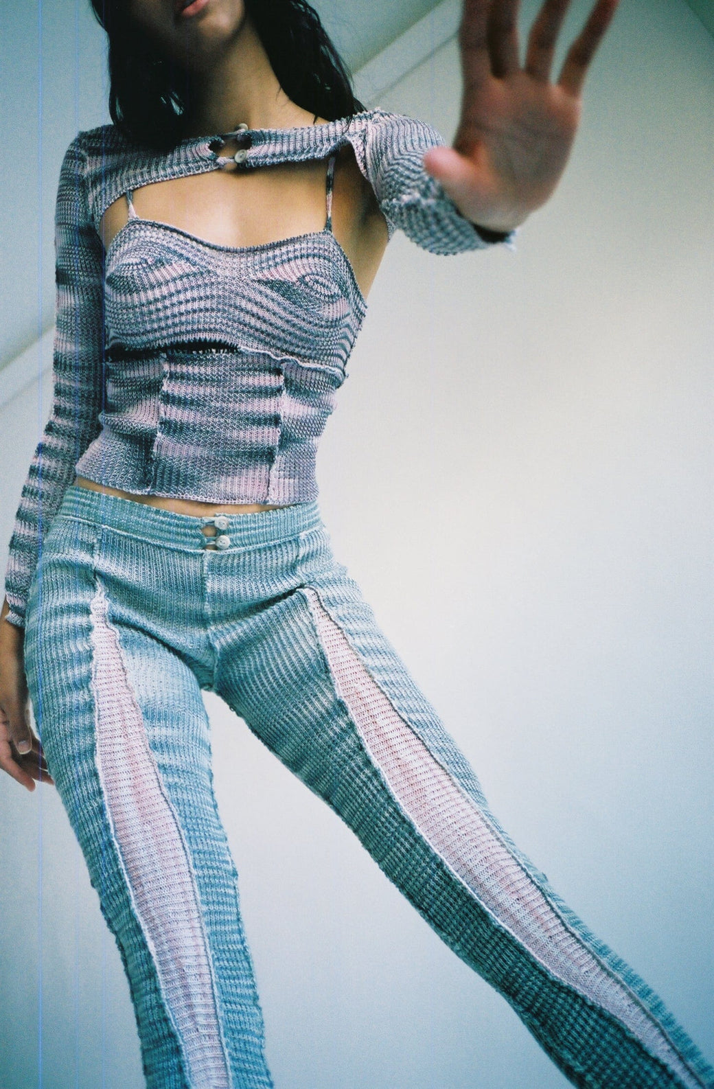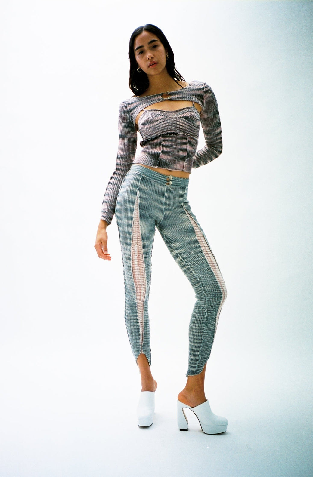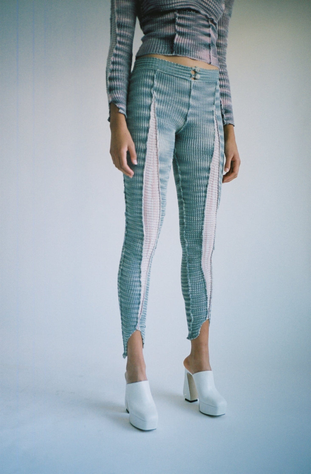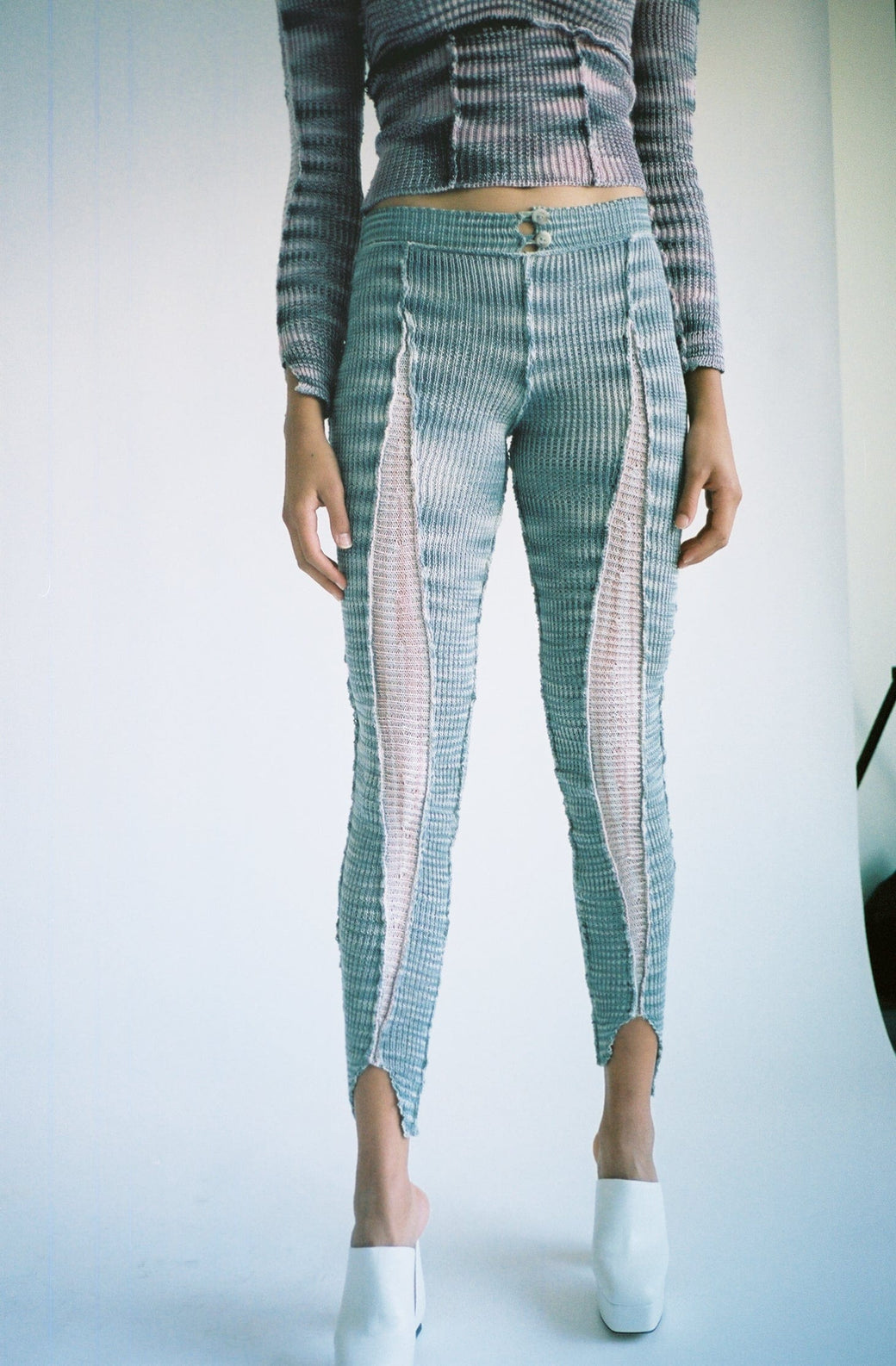 Handcrafted Rib-knit cotton-blend leggings. Jacquard pattern throughout. Paneled construction. Button closure. Vented cuffs. Gabe Gordon's new collection was inspired by adrenaline and anxiety. Its influences narrowed between films like "It Follows." As well as the swirling makeout session of shame and horror at the prom in "Carrie." As clothes decay, this brand never will, and the overall brand speaks as a personal narrative. Worn with the Midge Tank, Mini Split Cardigan, and the Hannah Jewett Silver Mutant Cloud Earrings.