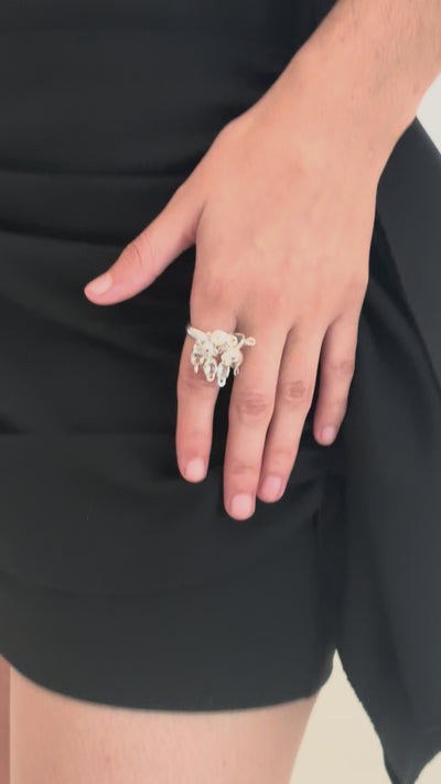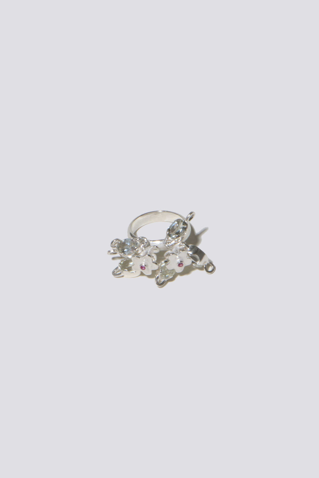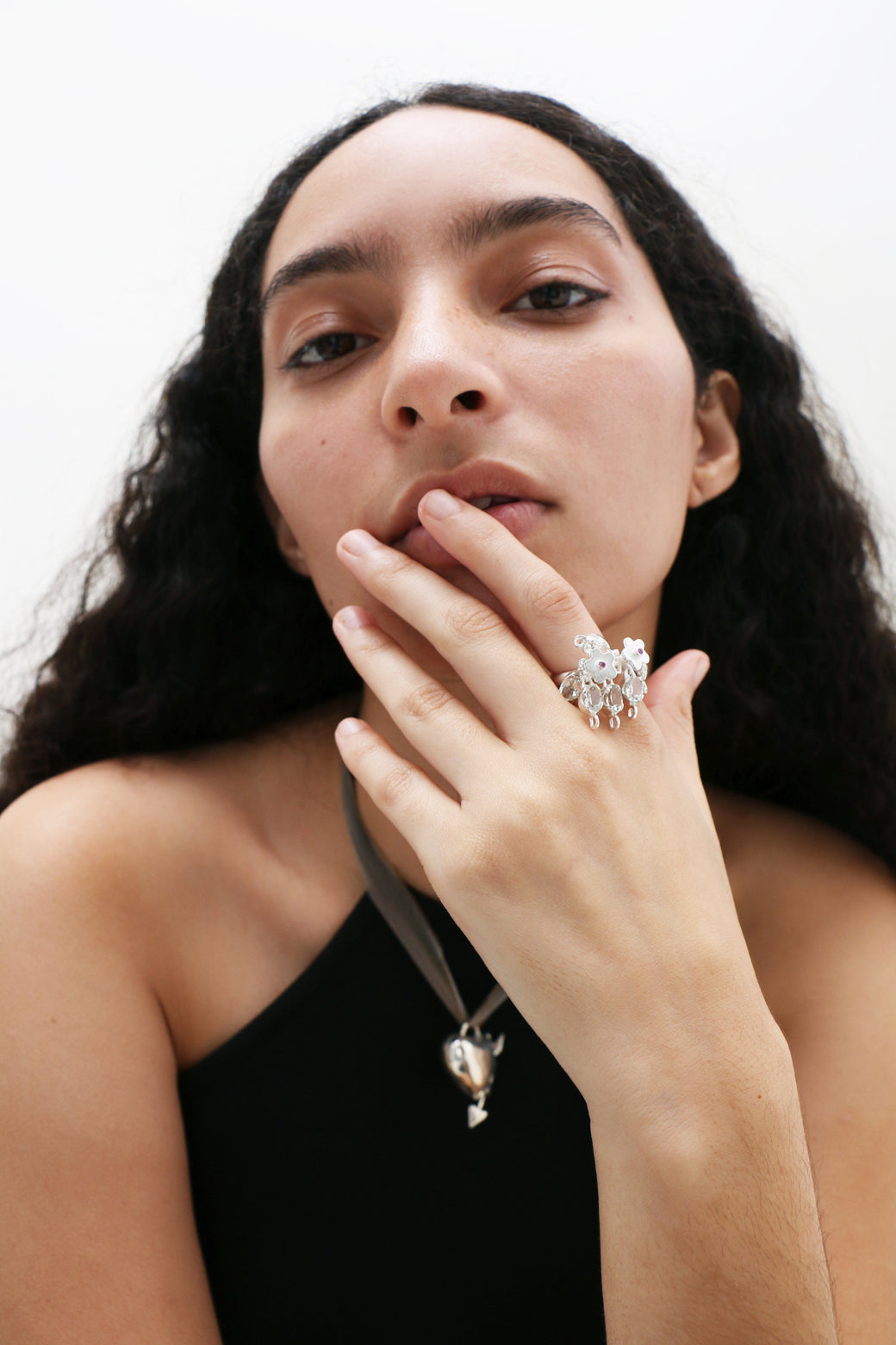 Silver charm ring featuring green amethyst stone leaves and silver flowers with pink sapphire centers.