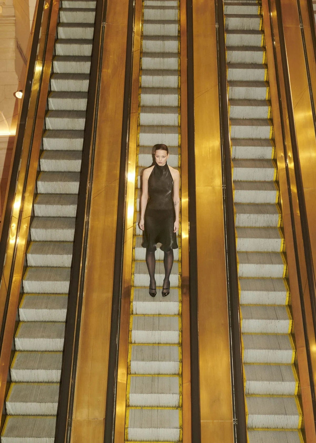 Dari is 5'8 and measures 34" bust, 26” waist, and 37" hips and wears a size S. Fabrication is 100% Polyester. Made in New York City. XS: Bust 14 1/2" Length 44" S: Bust 15 3/4" Length 44 1/2" M: Bust 16 3/4" Length 45" L: Bust 17 3/4" Length 46"