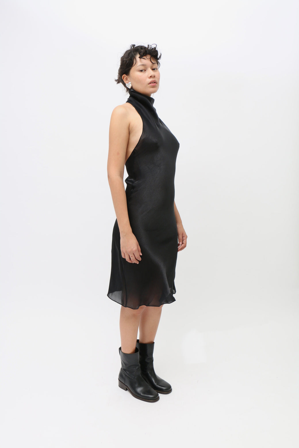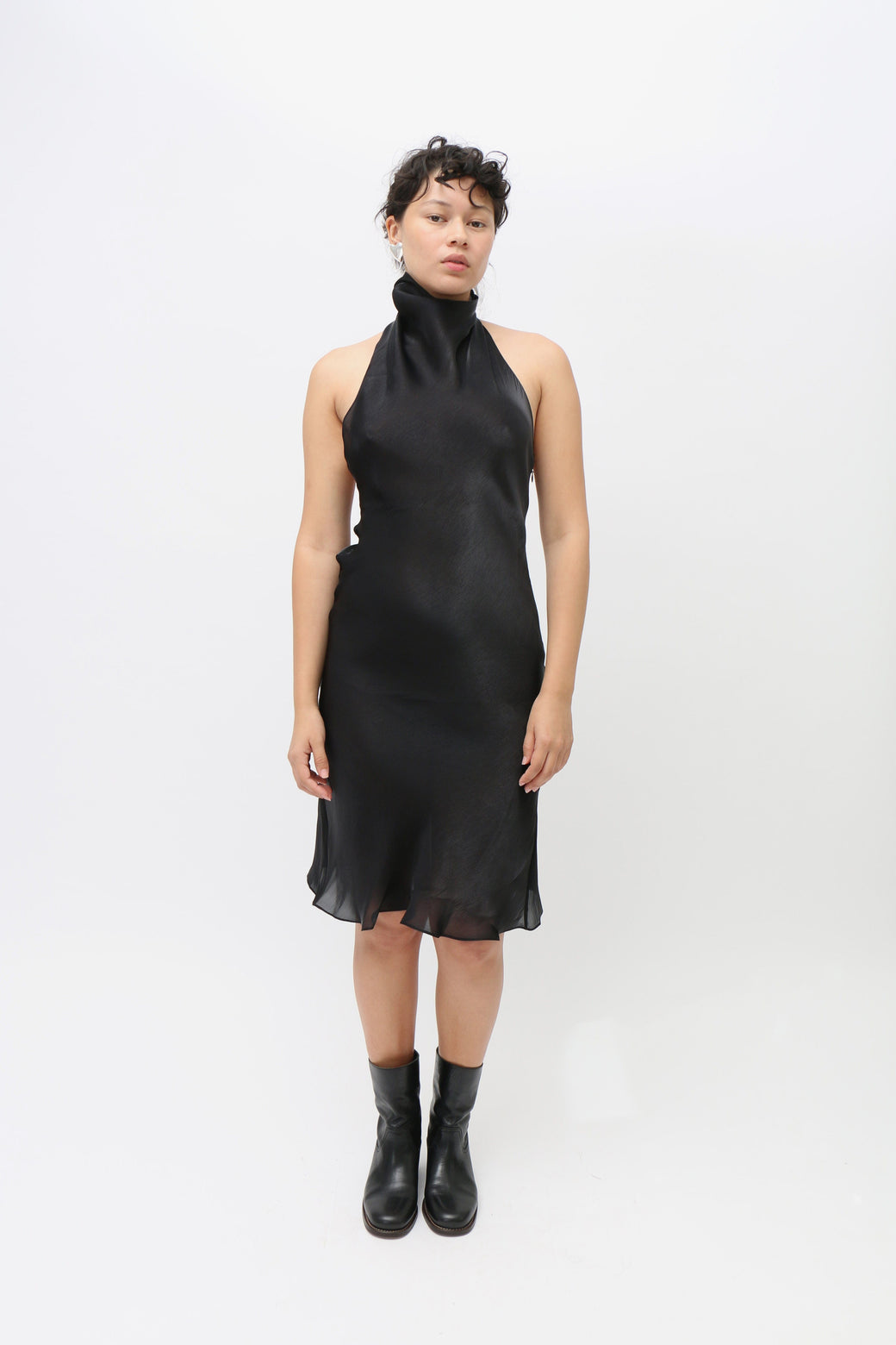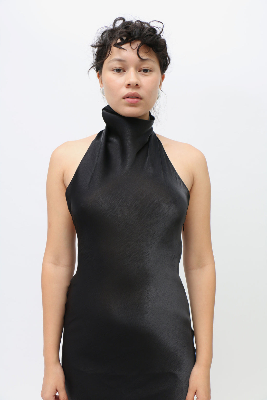 A luxurious French-crafted satin halter dress, cut on the bias to enhance its elegant drape. Featuring a high cowl neckline and a low, alluring back, the dress is finished with a discreet hook-and-eye closure at the neck and a concealed side zipper