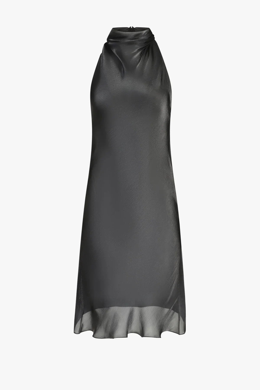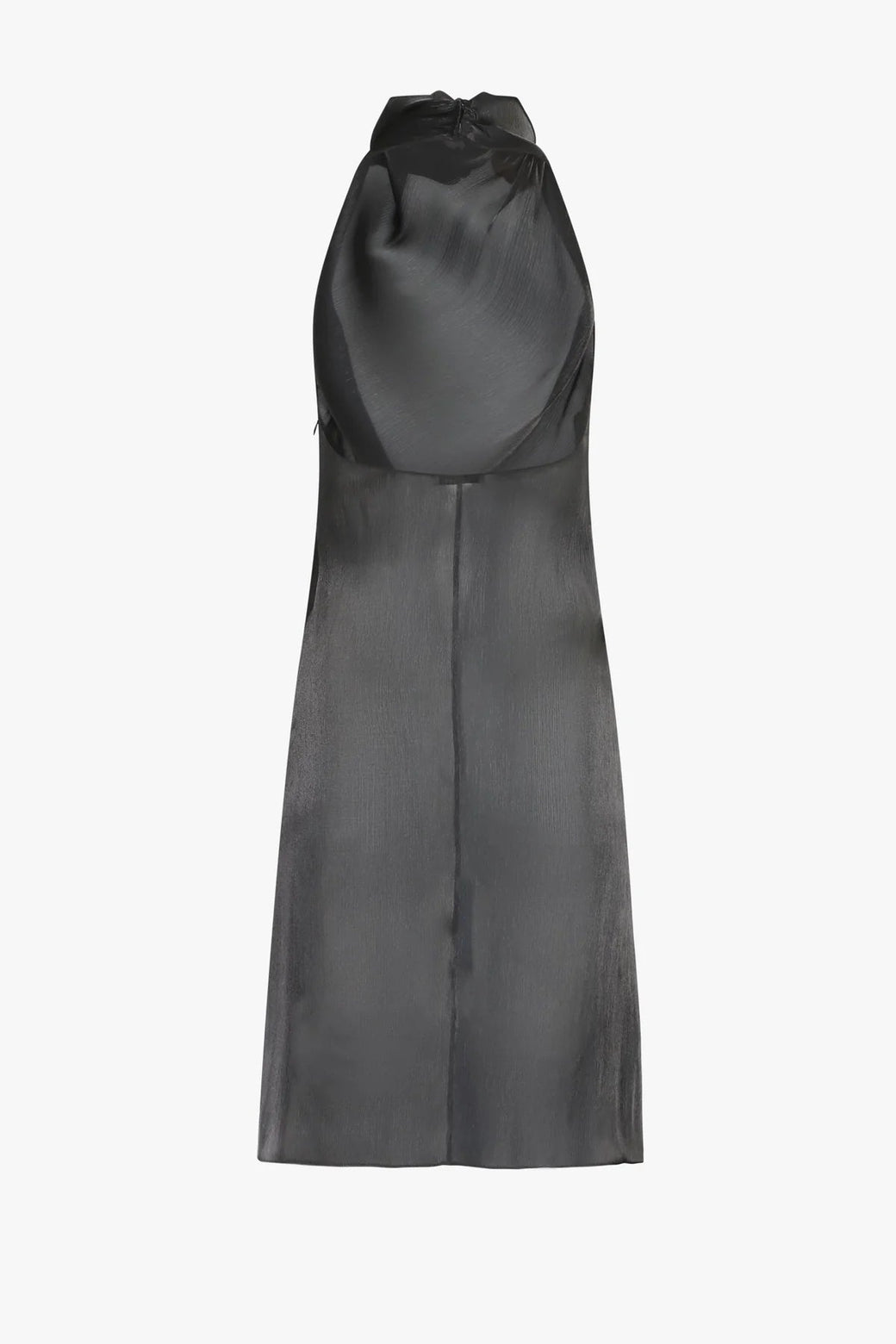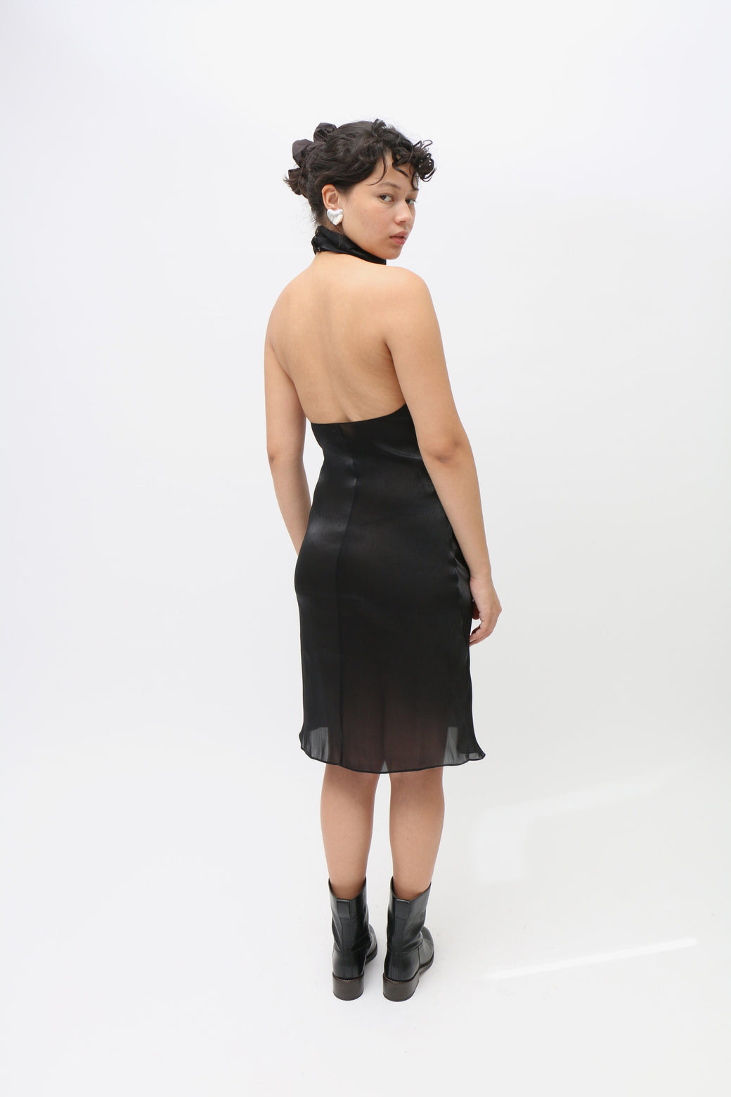 A luxurious French-crafted satin halter dress, cut on the bias to enhance its elegant drape. Featuring a high cowl neckline and a low, alluring back, the dress is finished with a discreet hook-and-eye closure at the neck and a concealed side zipper