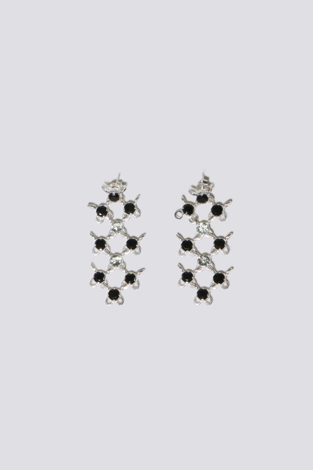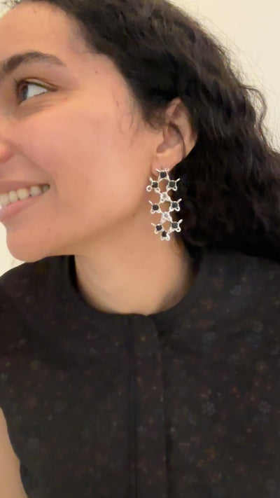 Silver chain-linked earrings with a mesh-like structure, set with black onyx and green amethyst stones. Sold as a pair.