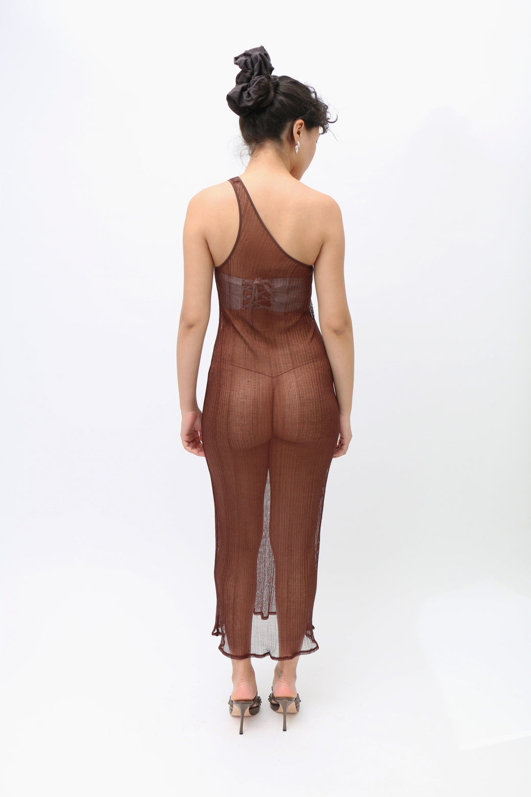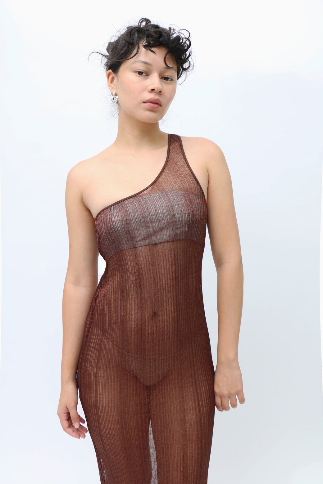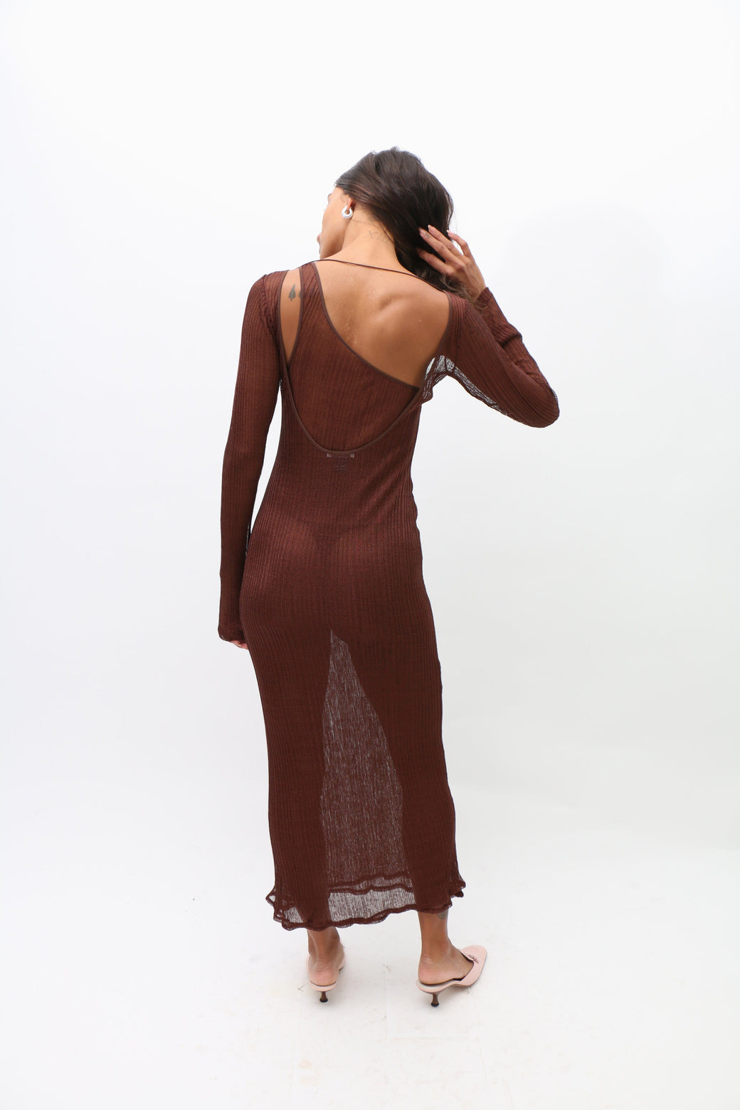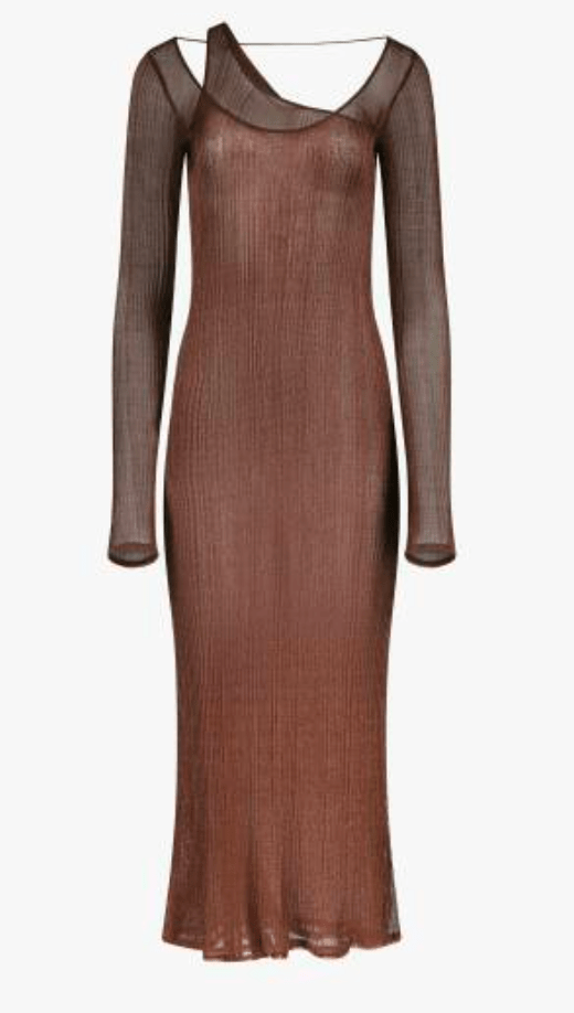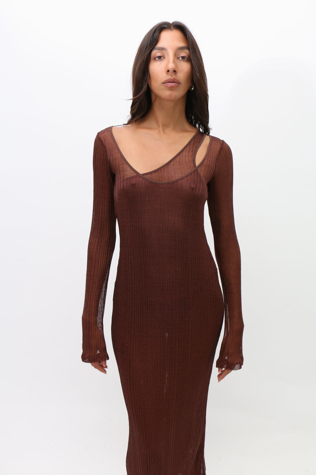 The Double Layered dress is two separate dresses layered for opacity. The underdress is an off the shoulder tank top while the top layer is a scoop neck long sleeve dress. The rib knit is enhanced with a metallic shimmering finish under the right lighting.