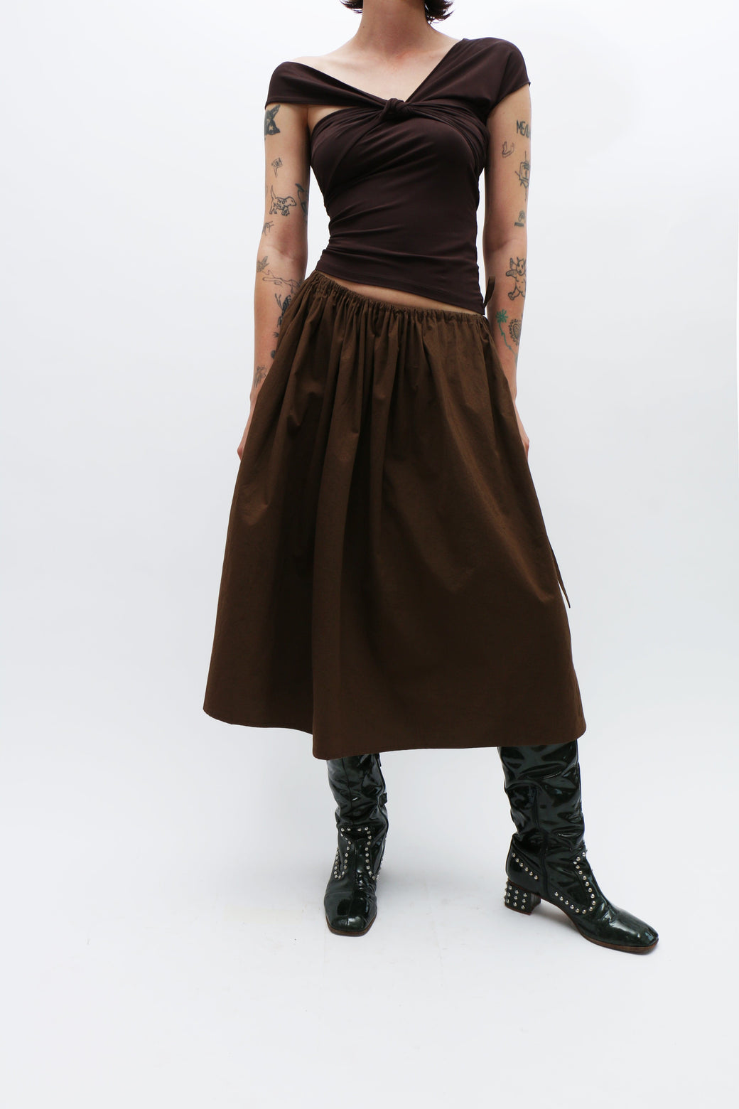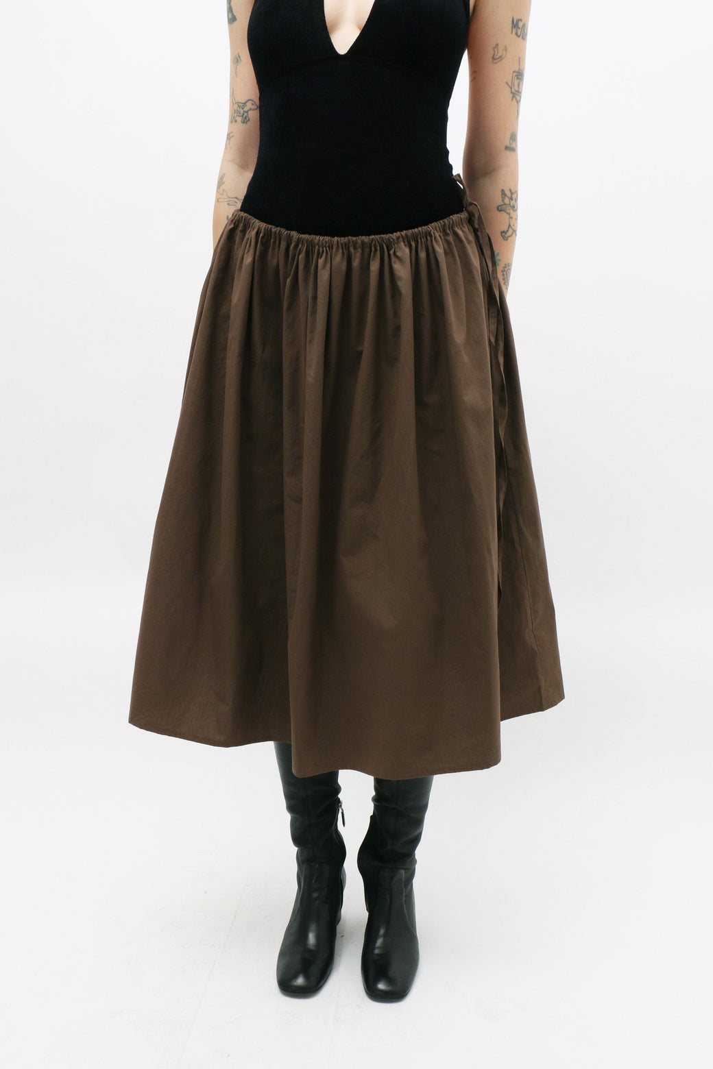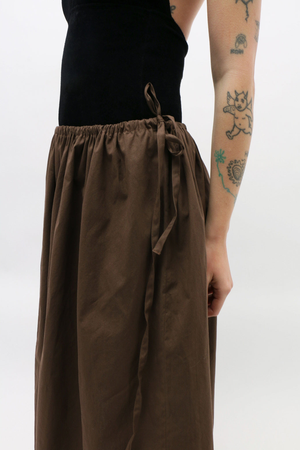 Cotton poplin skirt with a fully adjustable tie waist, allowing for versatile styling. Low-rise fit, enhanced by an extreme gathered waist. The skirt is adorned with a long self-tie bow along the side.