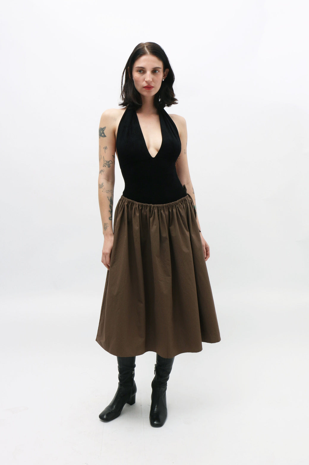 Ilana is 5'8" tall and measures 32” bust, 24” waist, and 36” hips and wears size S. Fabrication is 100% Cotton. Made in Los Angeles. Size 1: Best for waist sizes between 23-29 inches. Size 2: Best for waist sizes between 30-40 inches. Size 3: Best for waist sizes between 40-50 inches. Skirt length measures 28 inches.