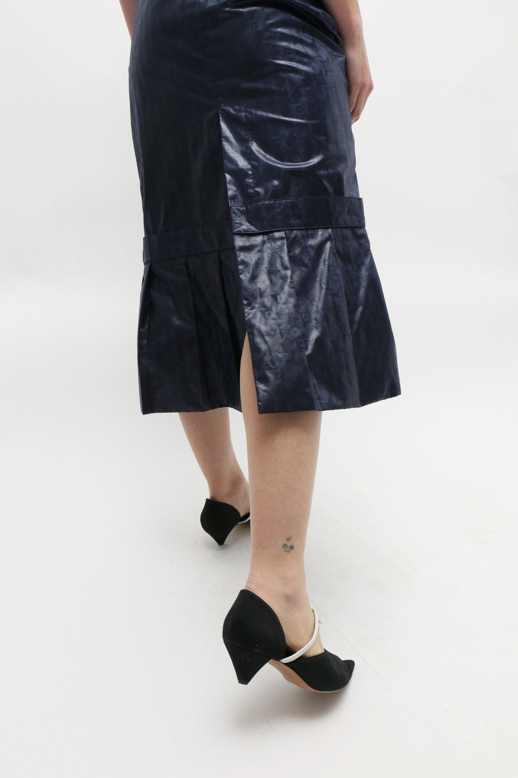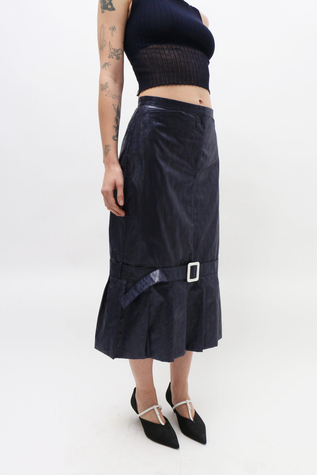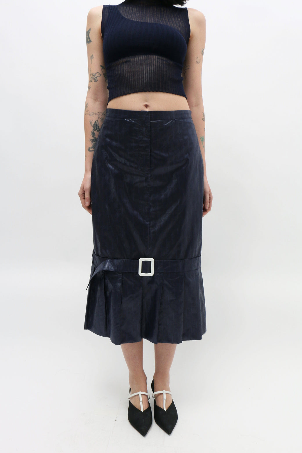Navy midi pencil skirt with a drop waist, featuring a fabric-covered belt above the knees and an oversized pleated hem along the bottom. Zip opening at the front waist.
