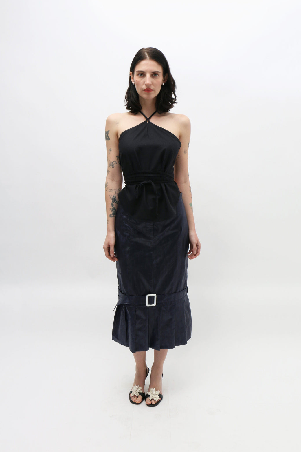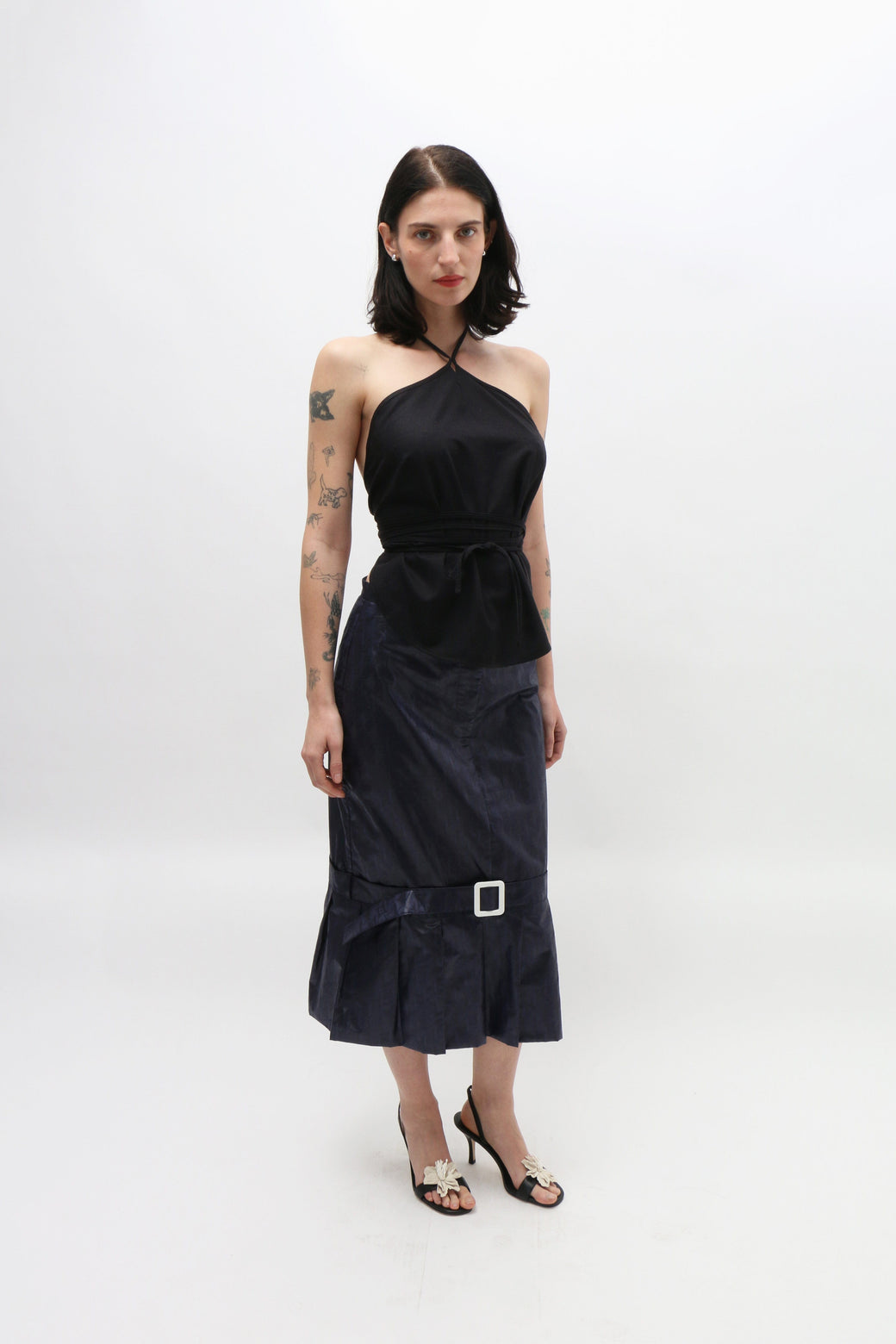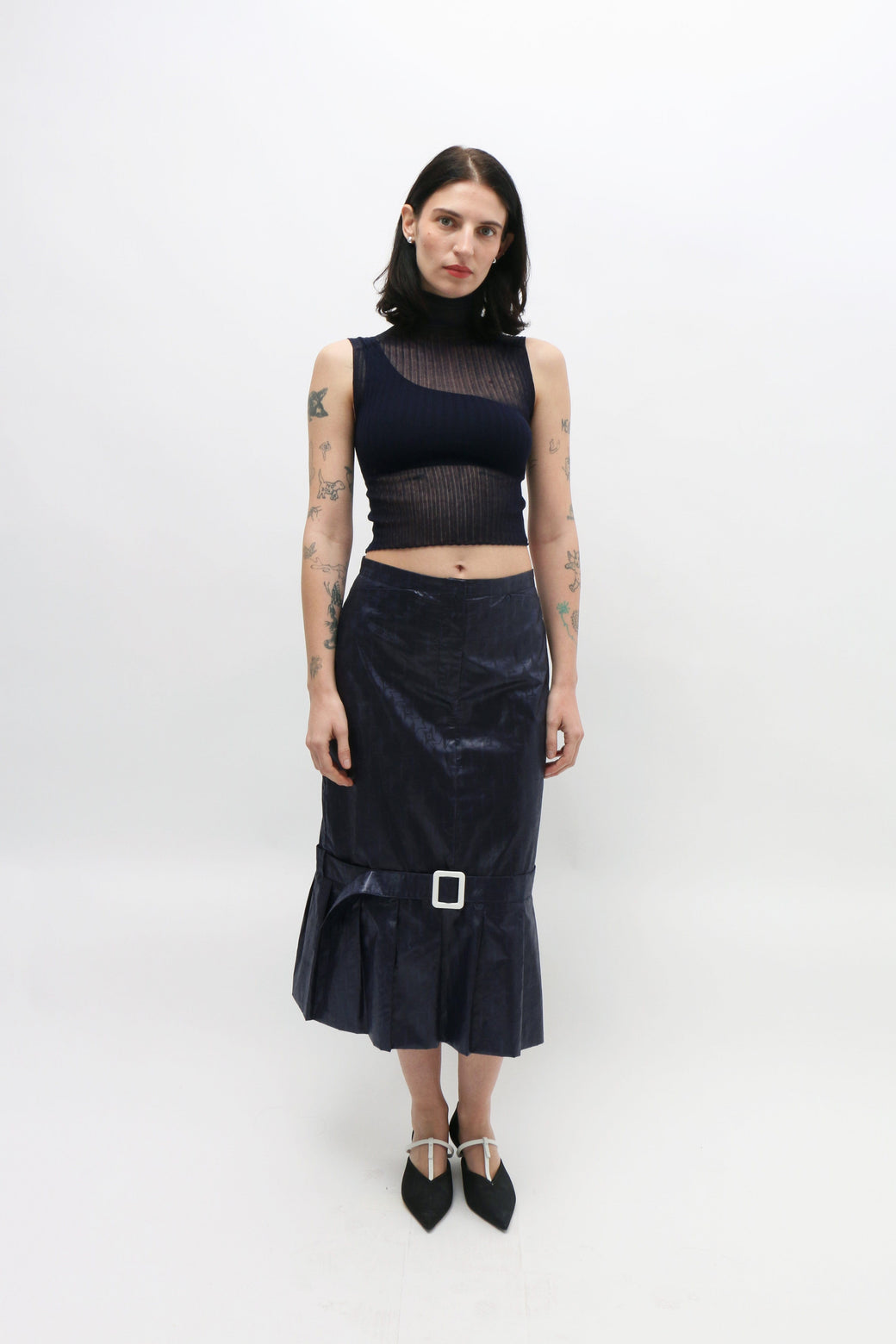 Navy midi pencil skirt with a drop waist, featuring a fabric-covered belt above the knees and an oversized pleated hem along the bottom. Zip opening at the front waist.