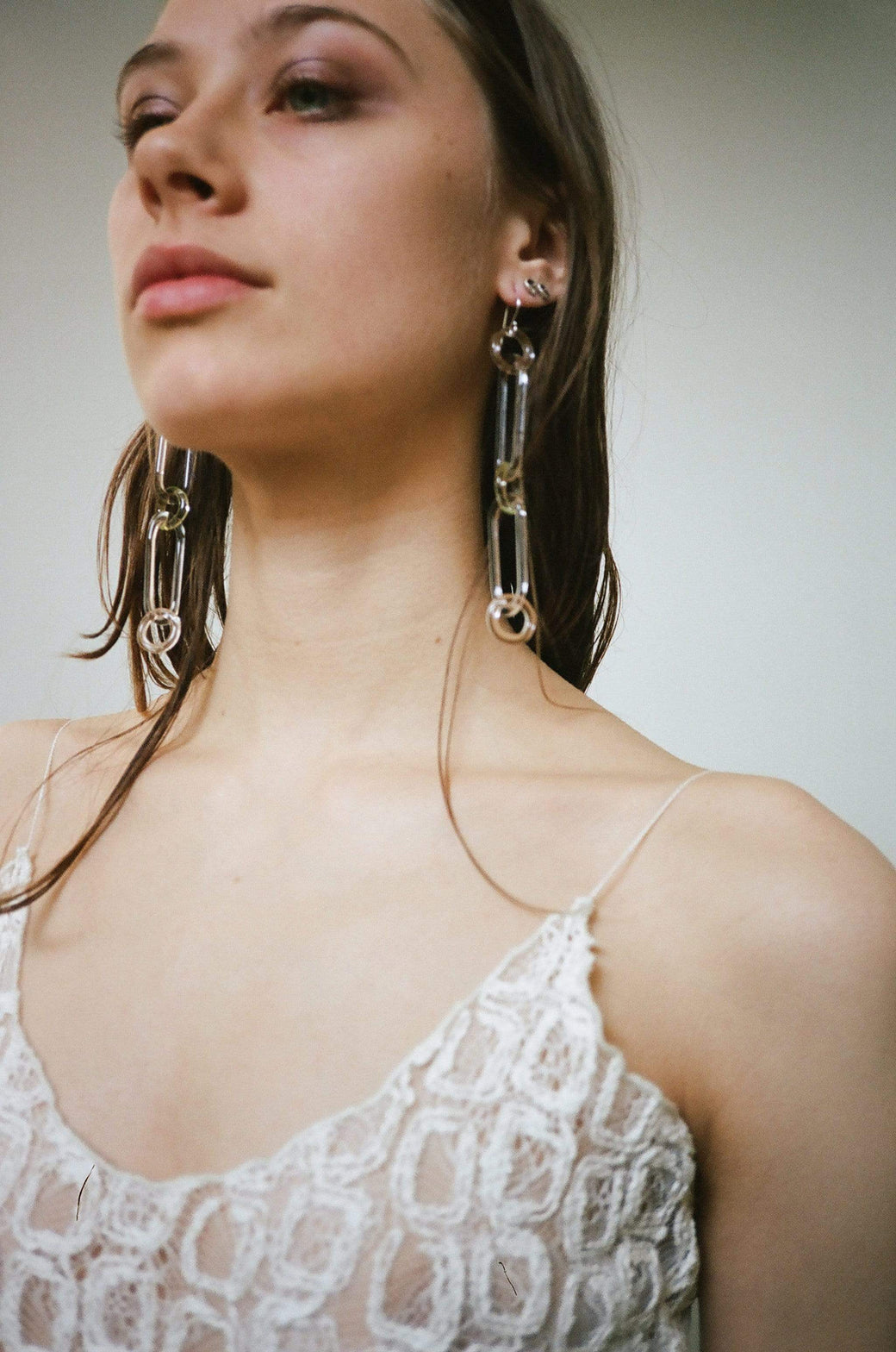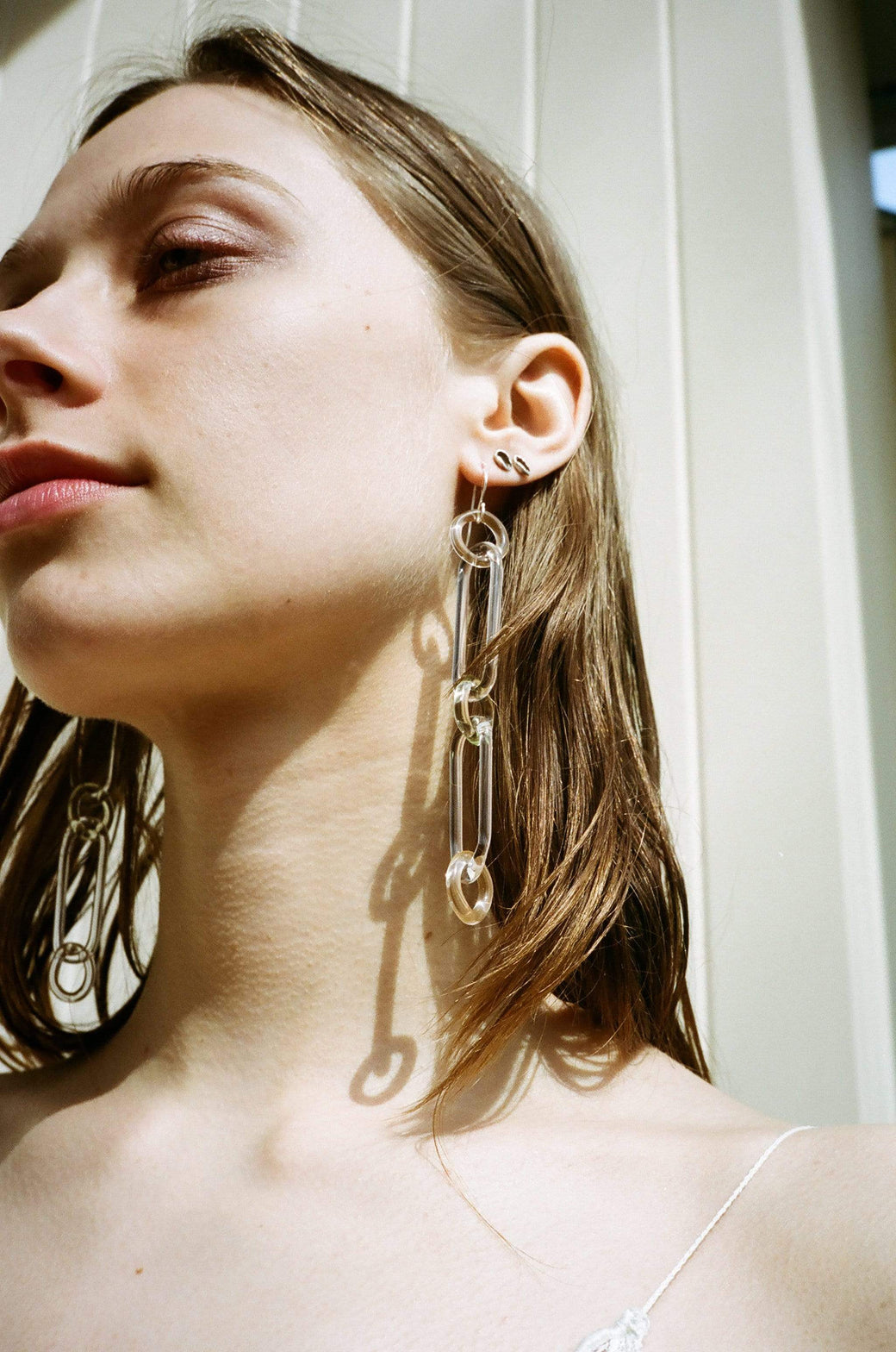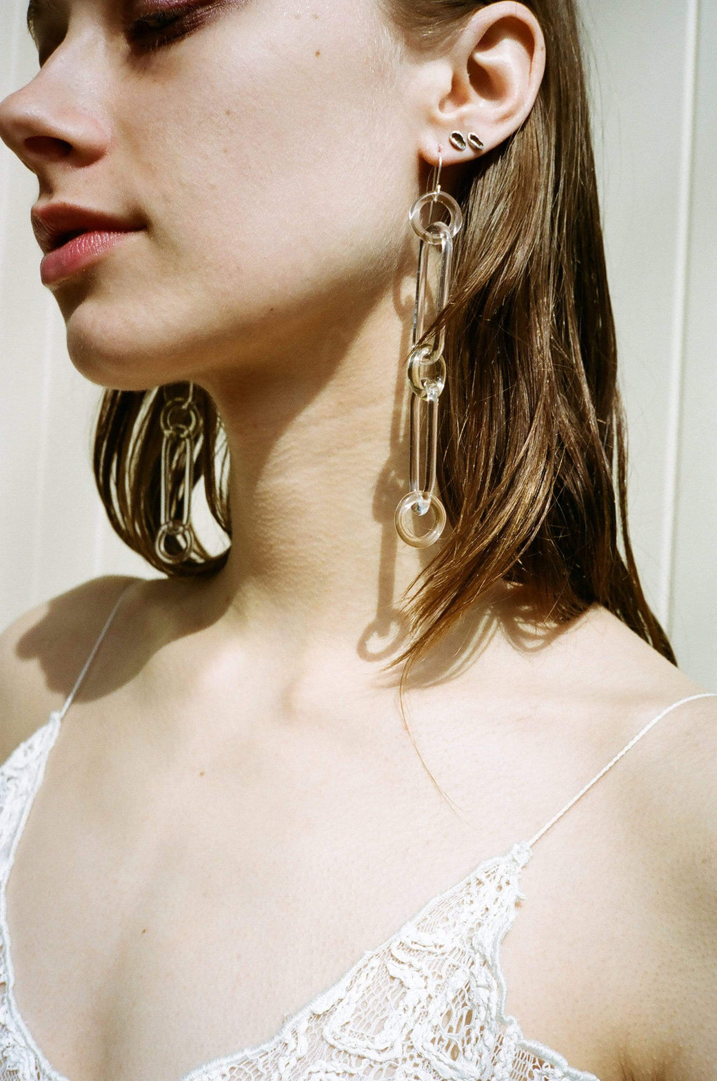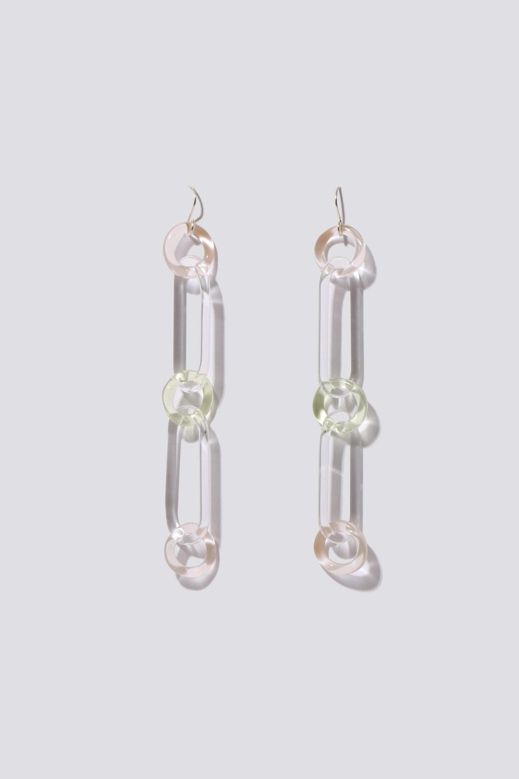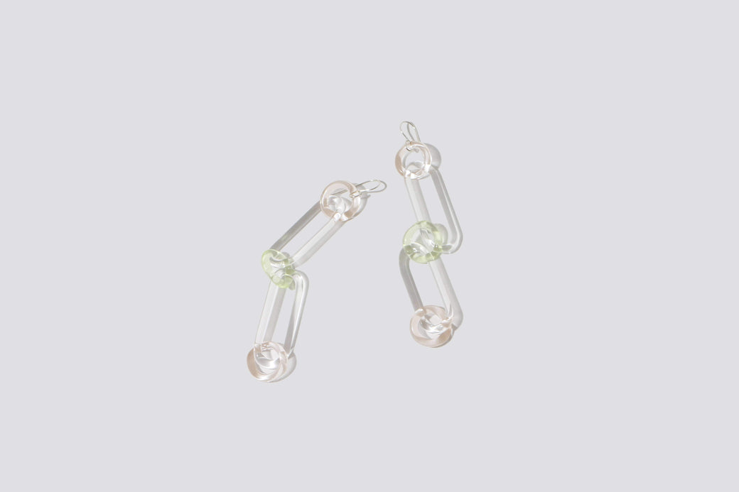 Glass earrings made of interconnected circle and oval shapes in clear, lime and peach. Sterling silver earring wire. Made in Brooklyn by hand.