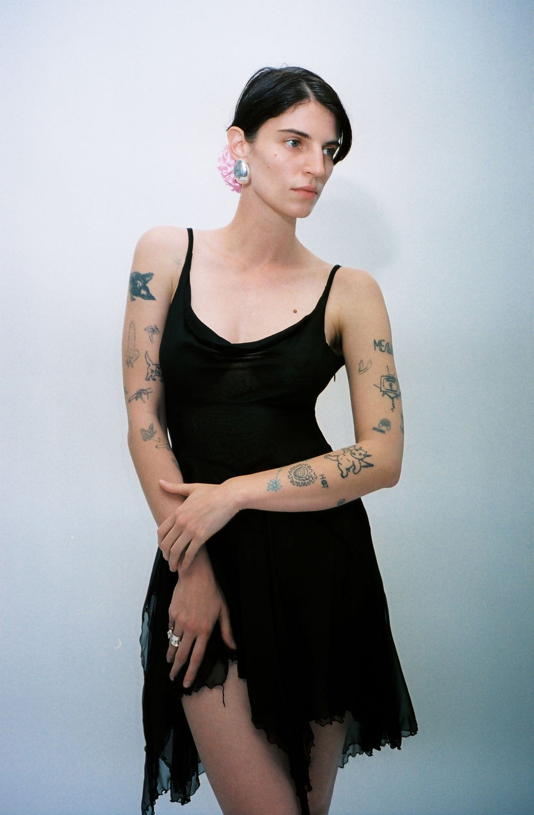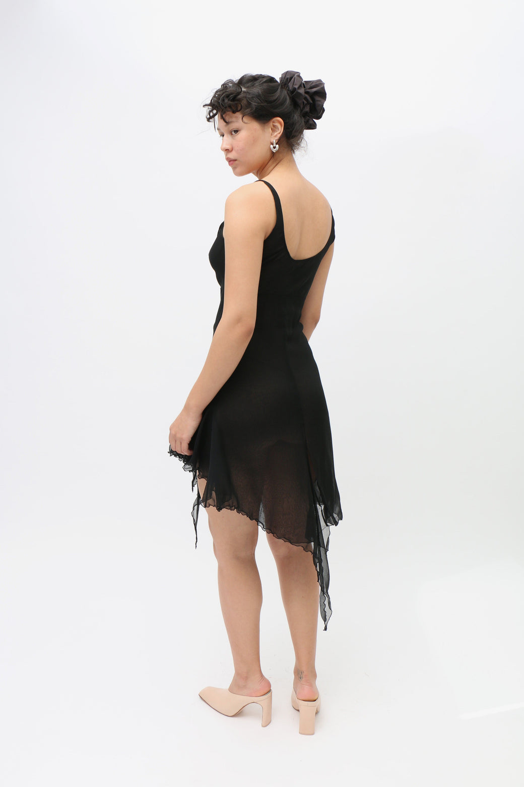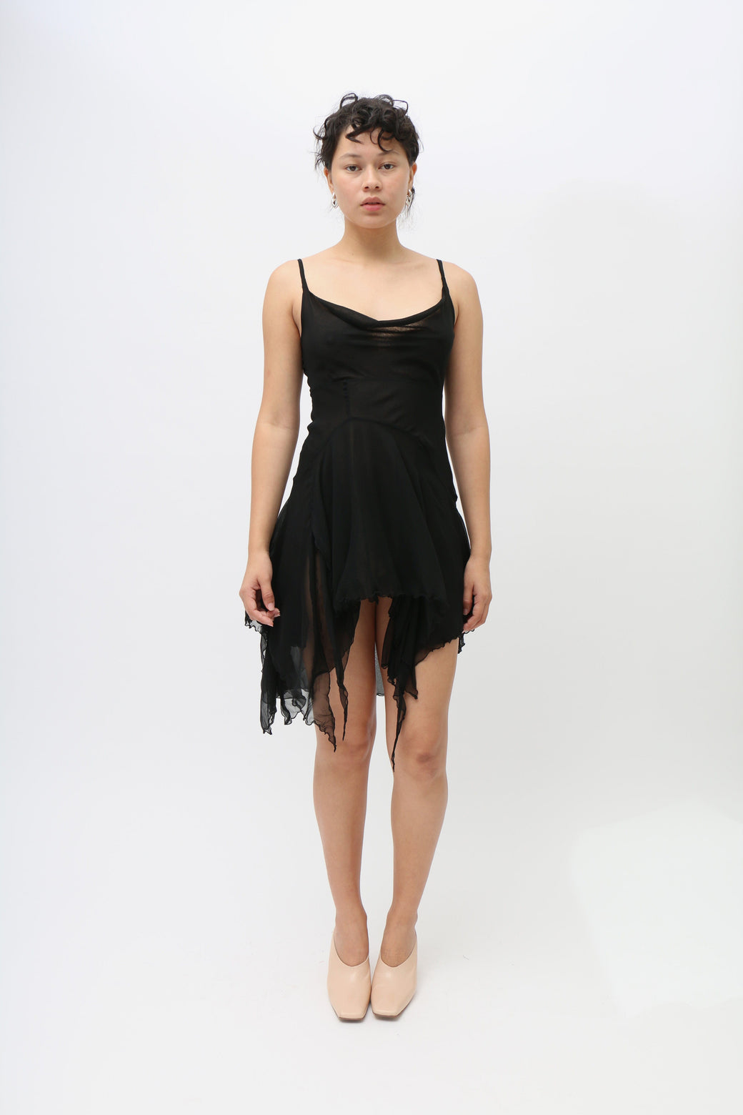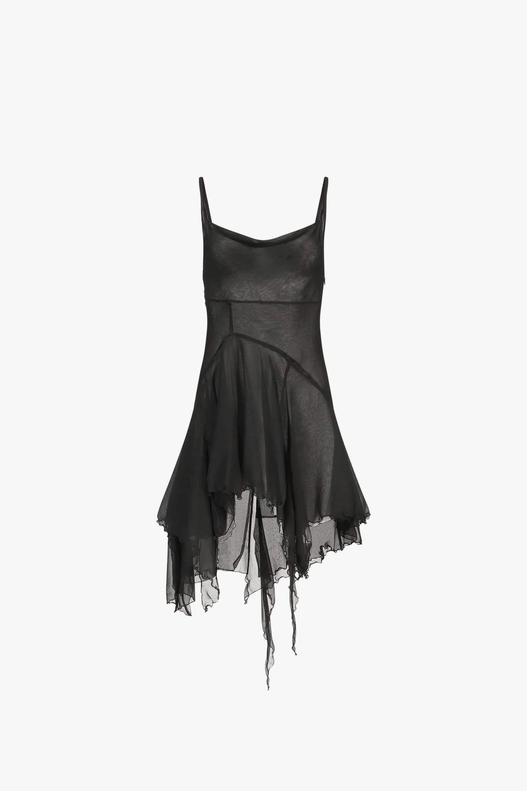 Priscavera's signature minidress features intricate asymmetric seaming, creating a paneled silhouette. Crafted from airy silk chiffon, it offers a barely-there feel and is cut on the bias for a flattering fit. The high-low handkerchief hem adds dynamic movement to this elegant piece.