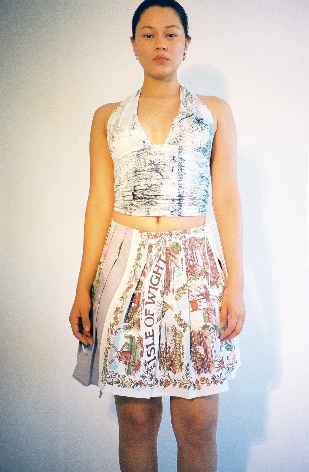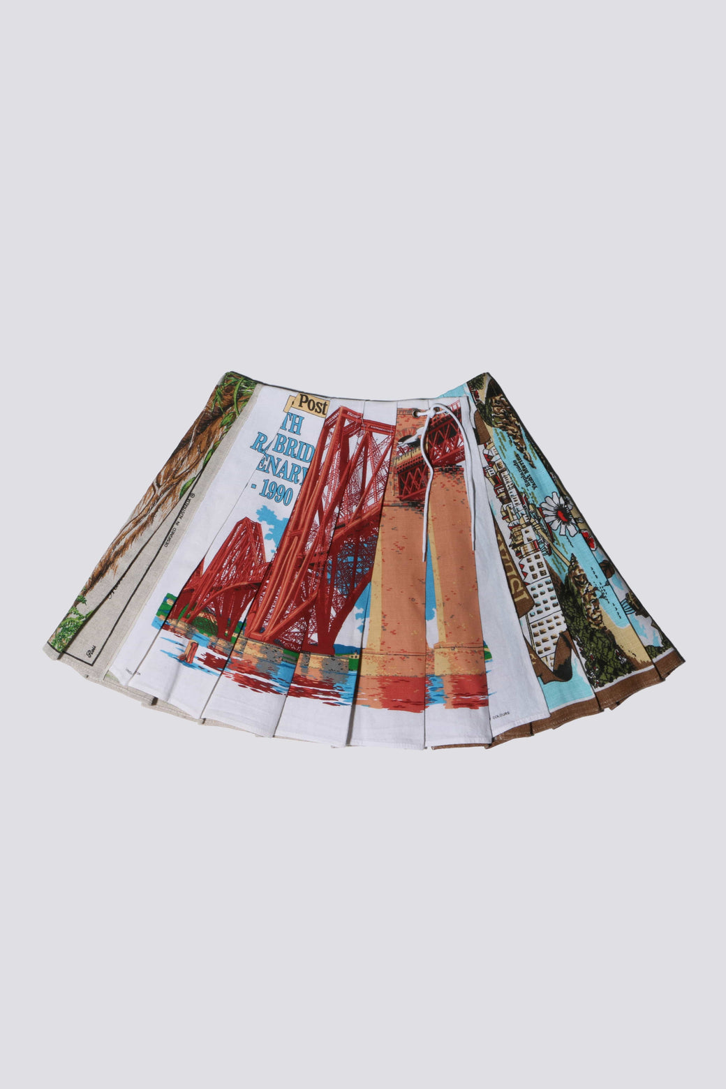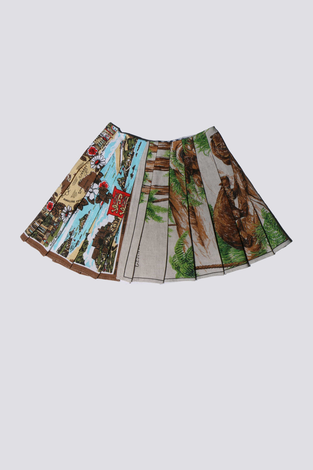 Rosie Evans creates one-off and small runs of anachronistic historically inspired fashion, following the ethical practice of upcycling old textiles and materials. Cotton skirt with classic tennis-style pleats made from vintage tea towels.