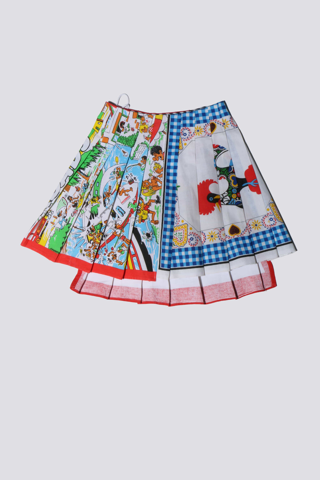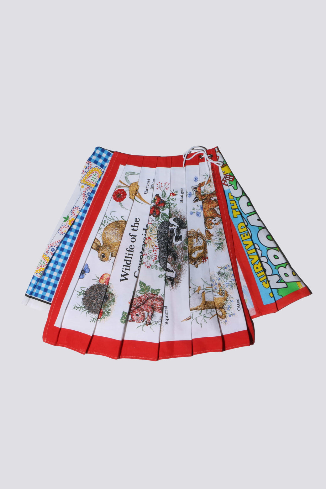Rosie Evans creates one-off and small runs of anachronistic historically inspired fashion, following the ethical practice of upcycling old textiles and materials. Cotton skirt with classic tennis-style pleats made from vintage tea towels.