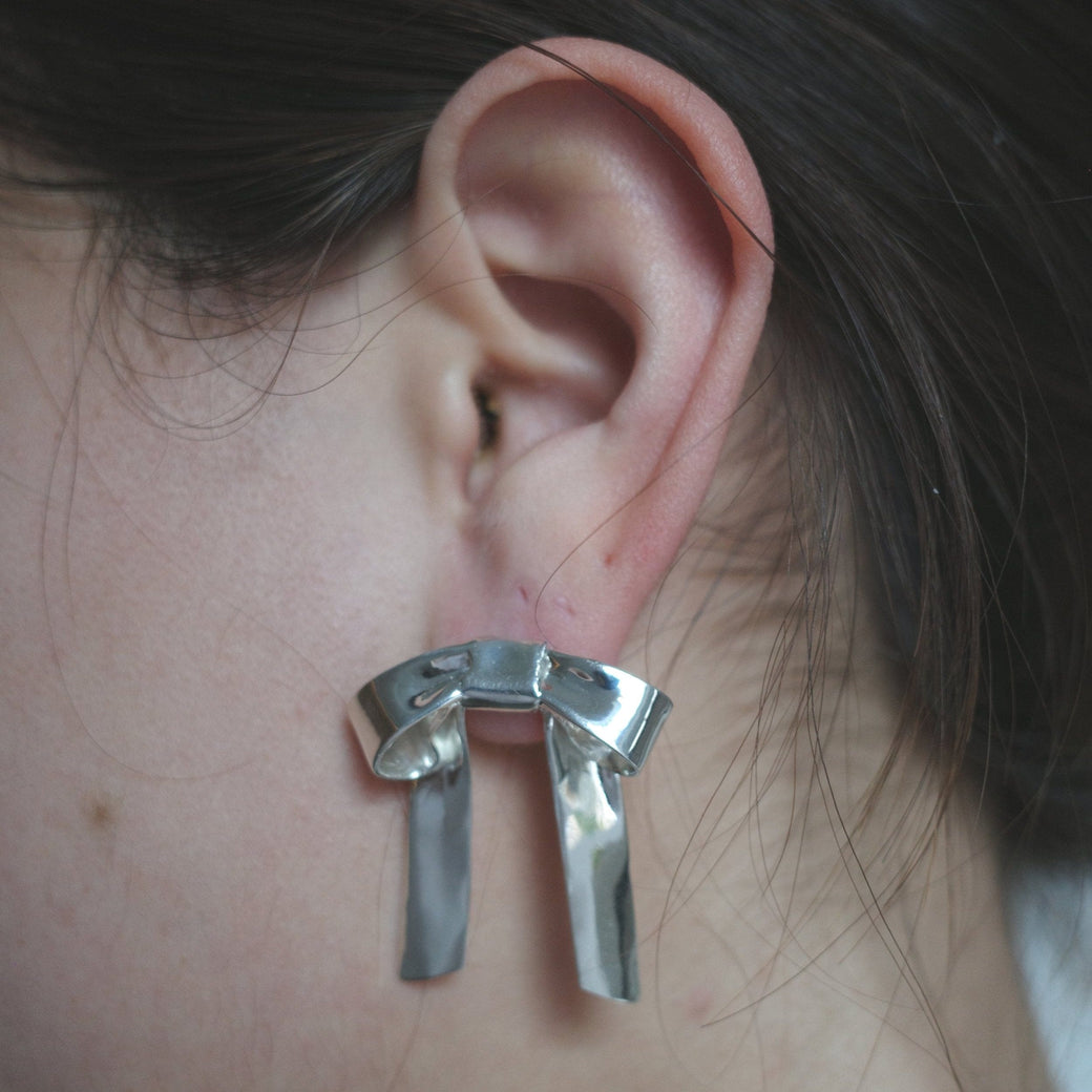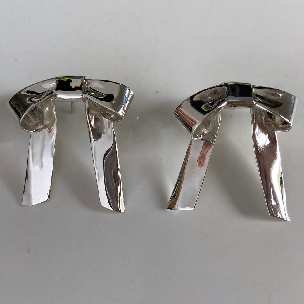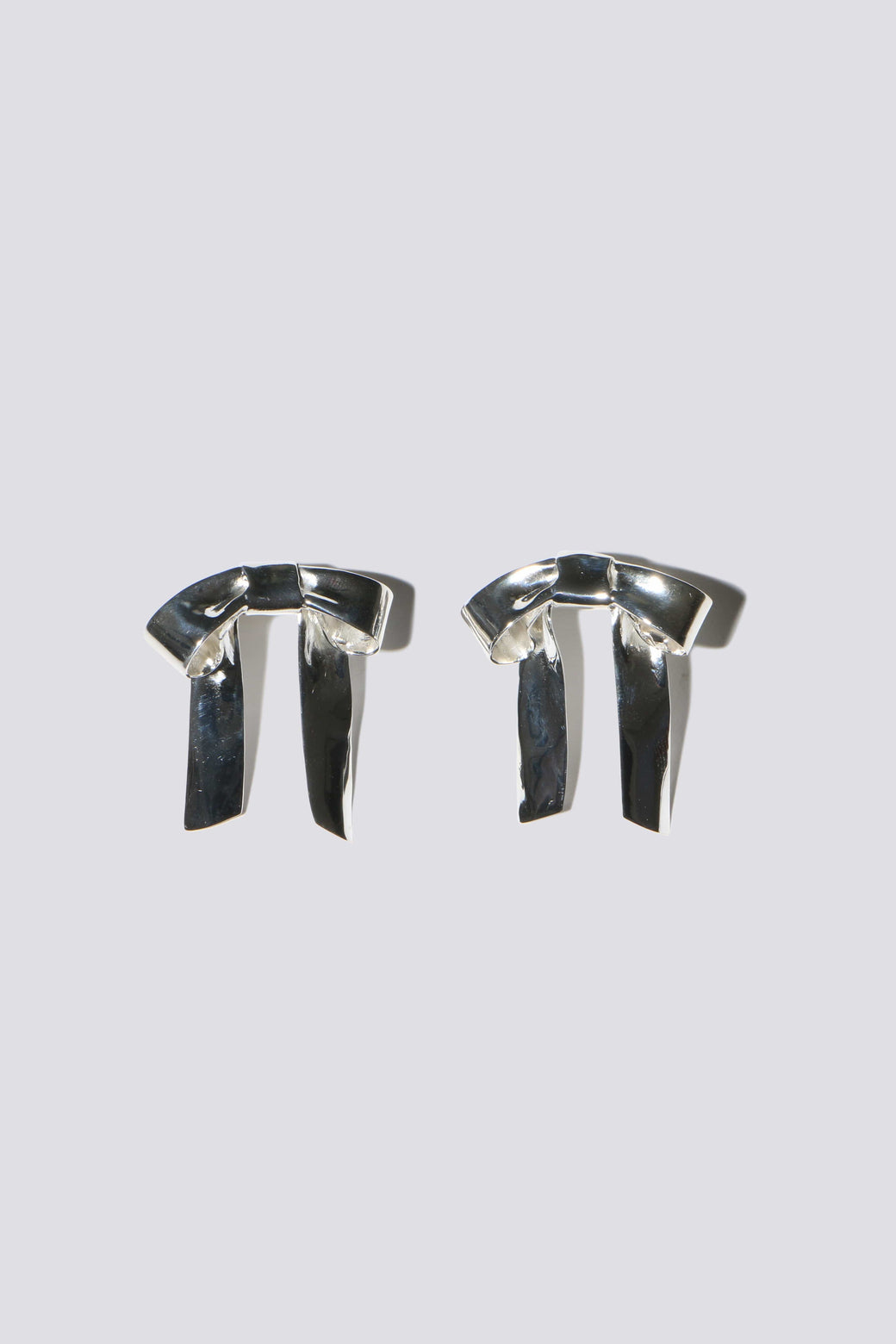 The Gifted Earrings, crafted from 925 silver, feature a charming ribbon design that creates the appearance of a delicately tied bow. Finished with 18k white gold earring posts. Sold as a pair.