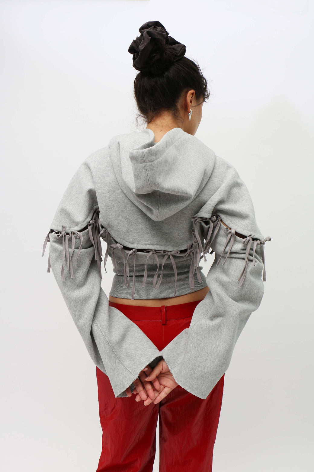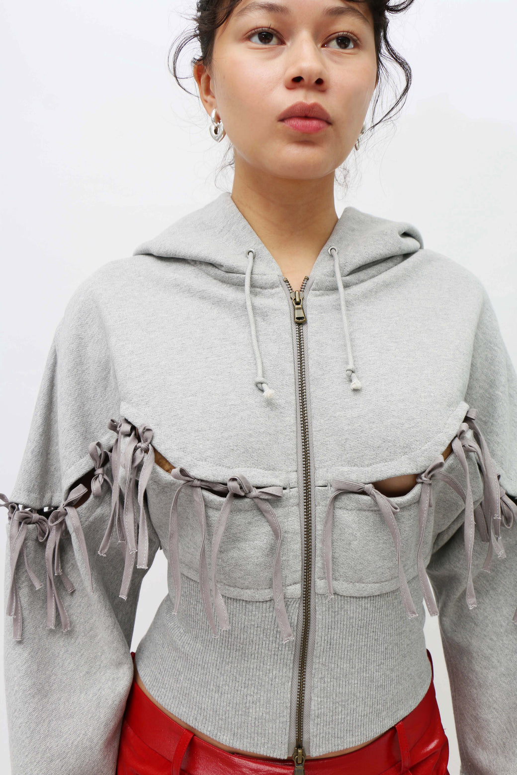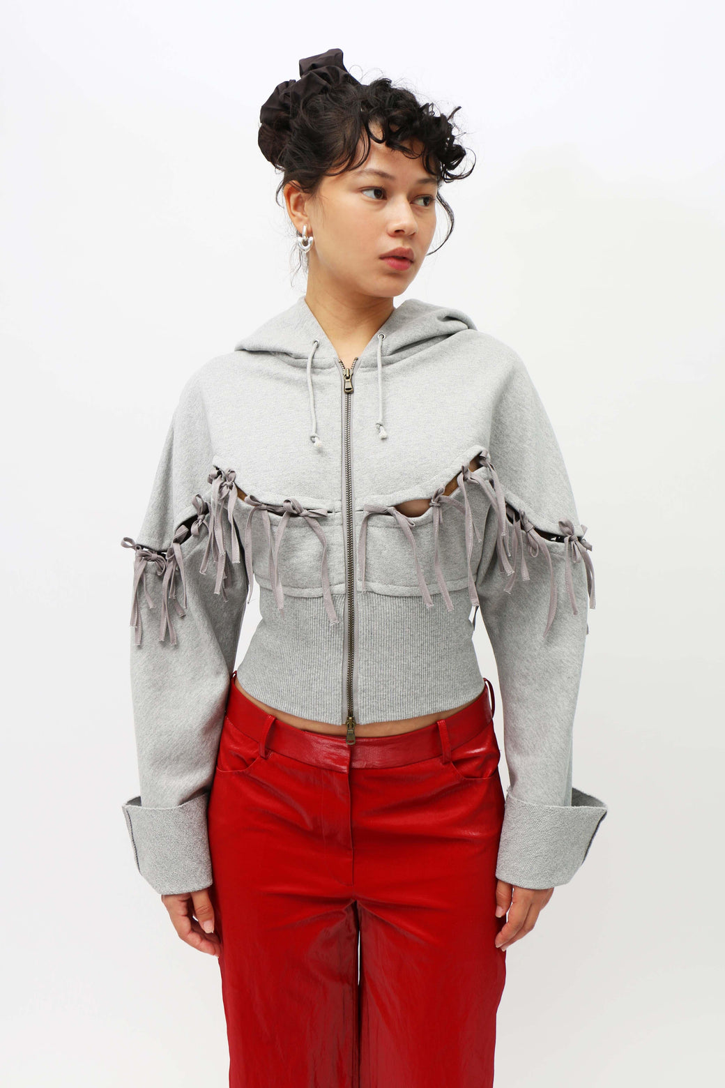 A deconstructed zip-up hoodie with cutouts along the bust and sleeves, secured by bow ties. Designed with extra-long, wide-cut sleeves and an exaggerated wide-ribbed waist, it’s finished with a gold double zipper for added flair.