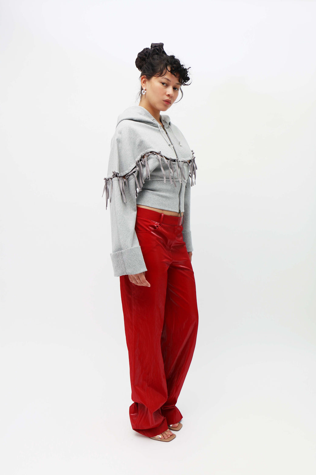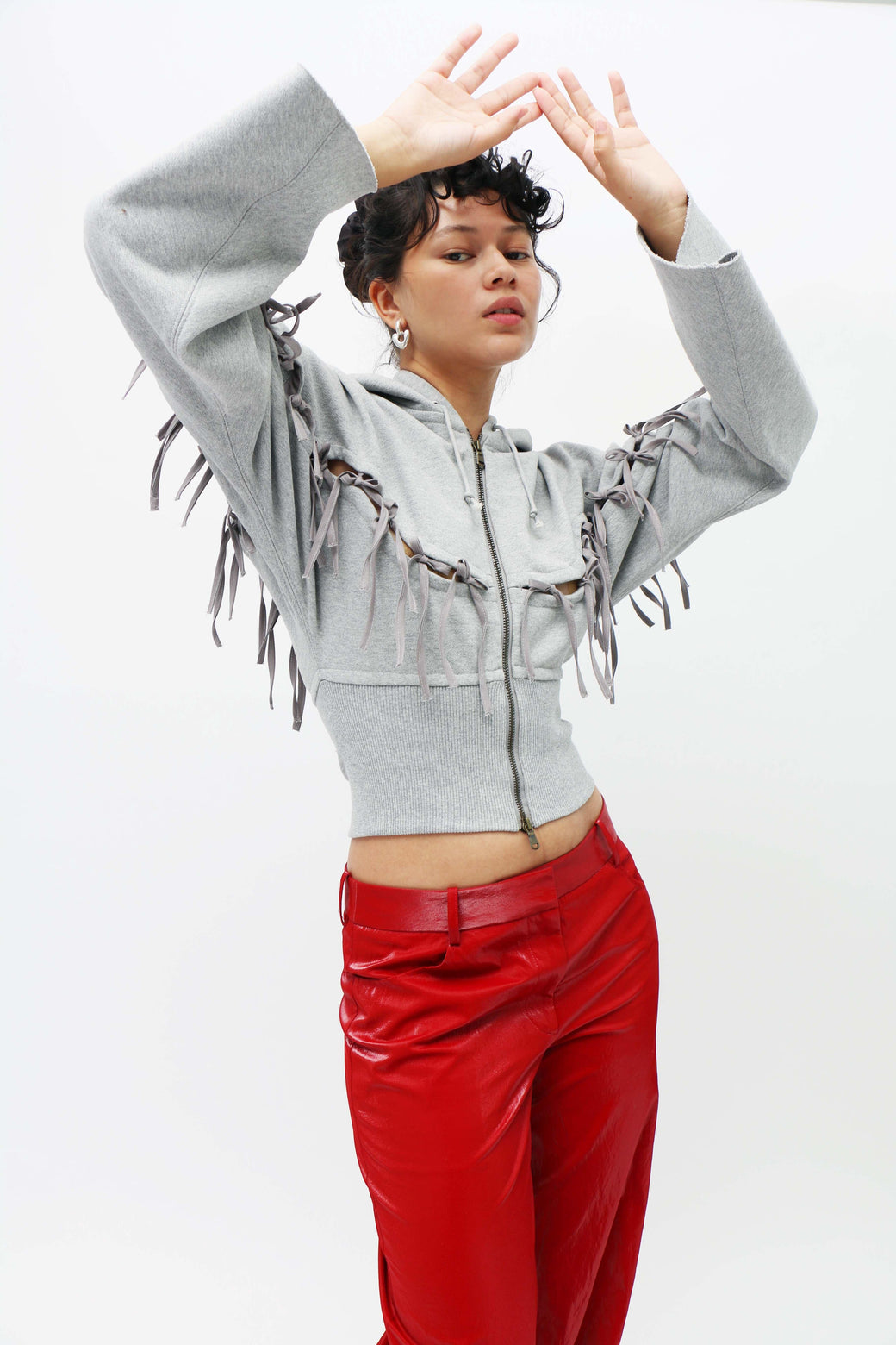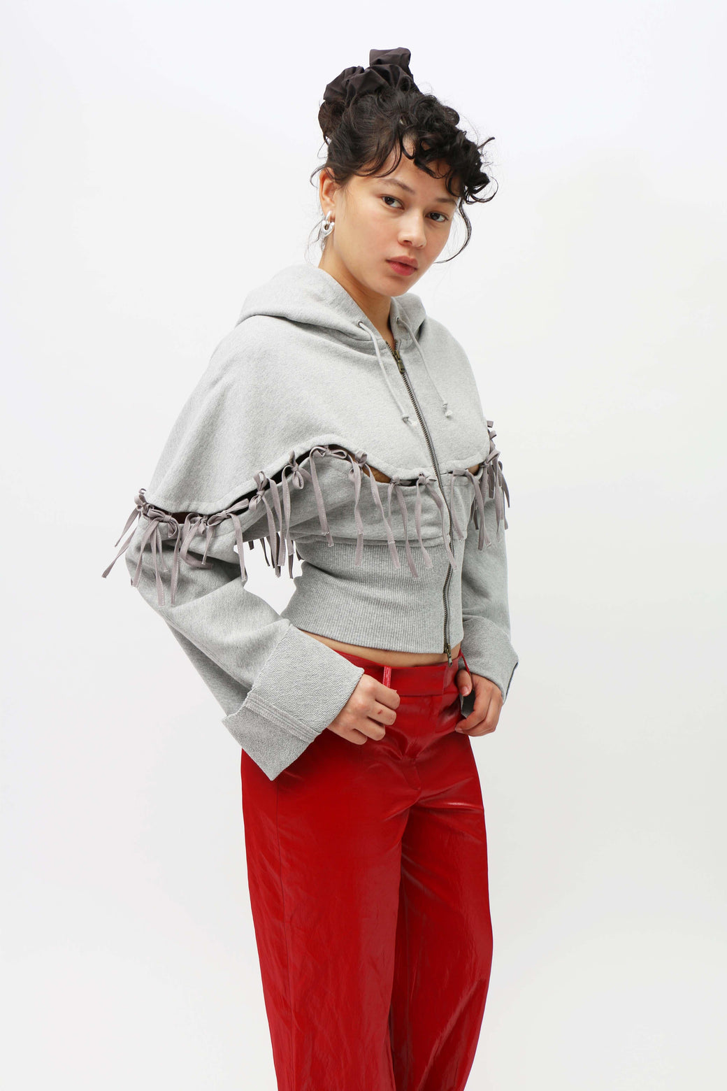 A deconstructed zip-up hoodie with cutouts along the bust and sleeves, secured by bow ties. Designed with extra-long, wide-cut sleeves and an exaggerated wide-ribbed waist, it’s finished with a gold double zipper for added flair.