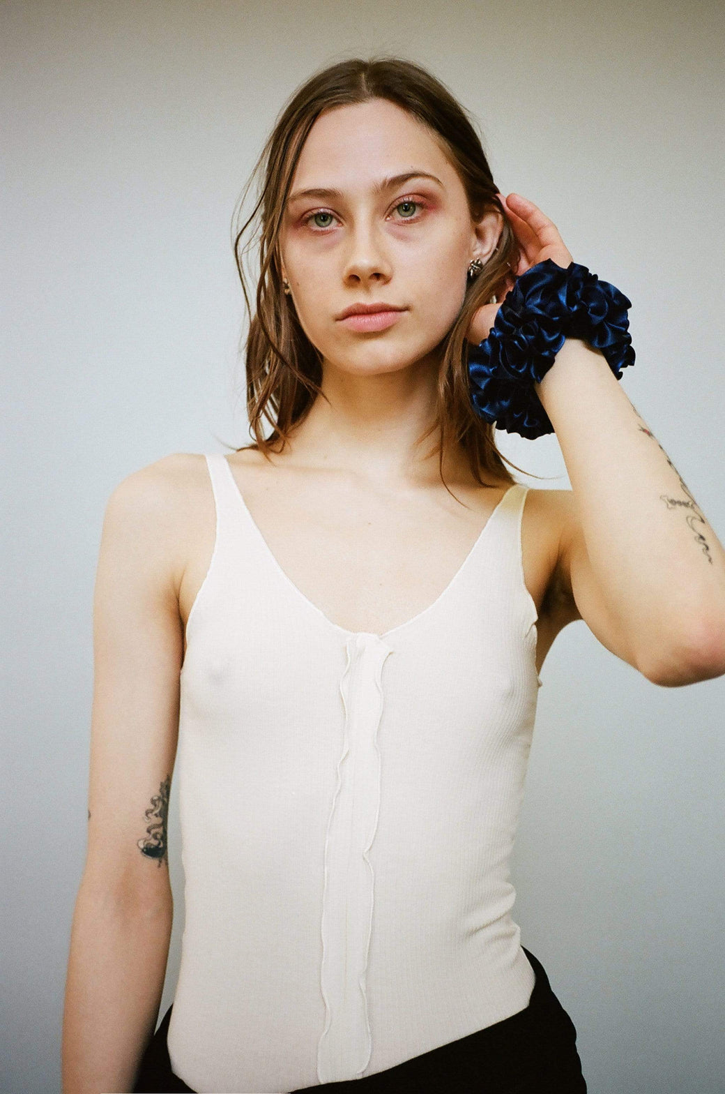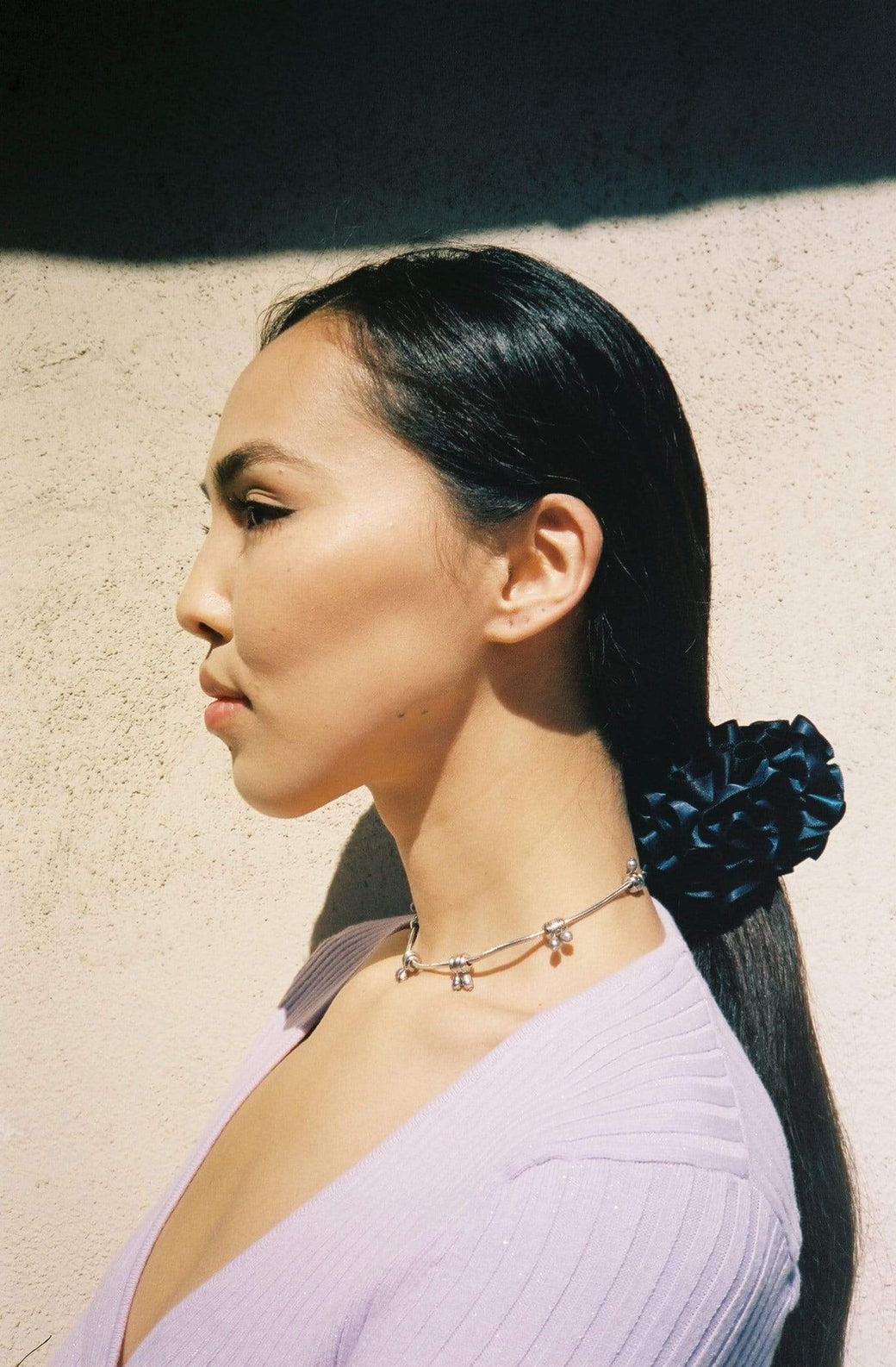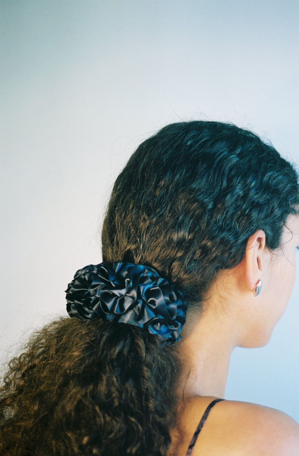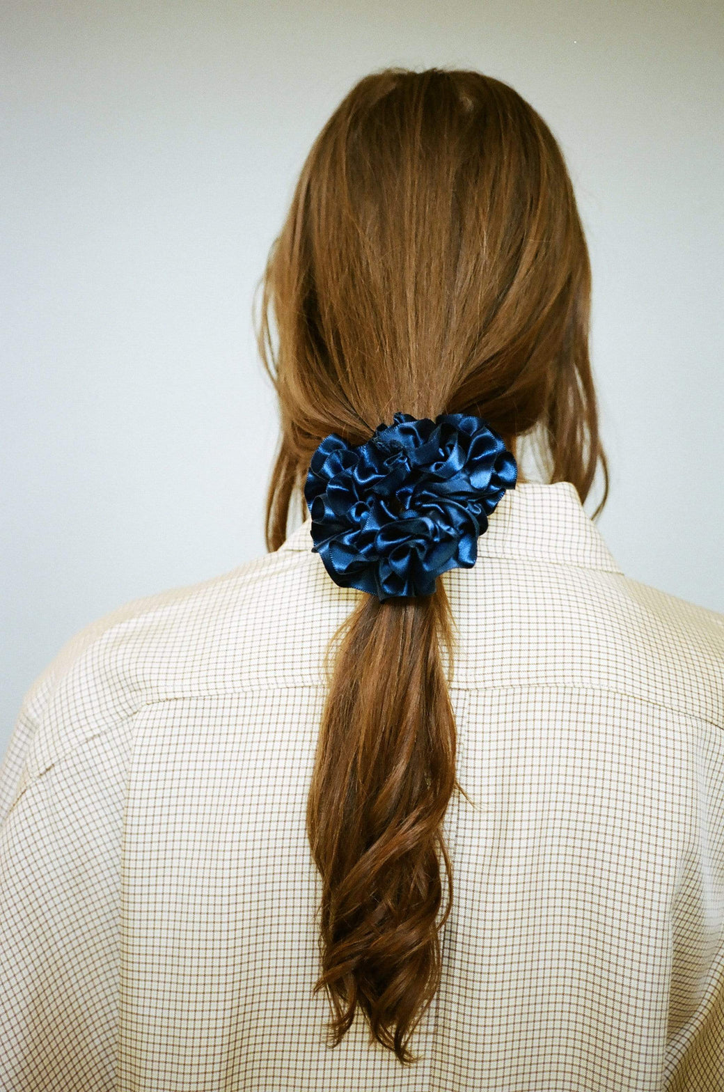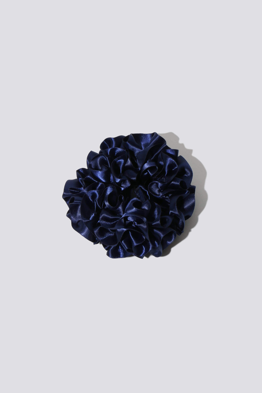 Hair scrunchie in color Ink, a deep blue navy. Furled silk resembling carnation petals. To be worn in the hair or adorned on the wrist or ankle.