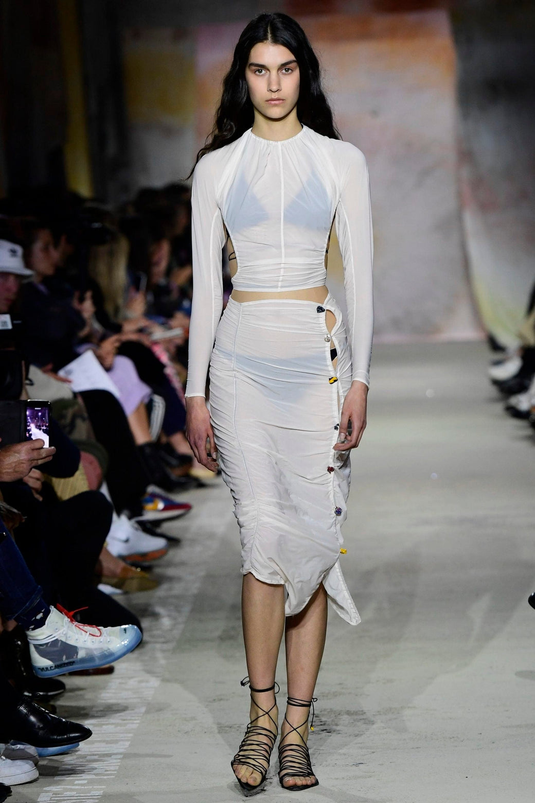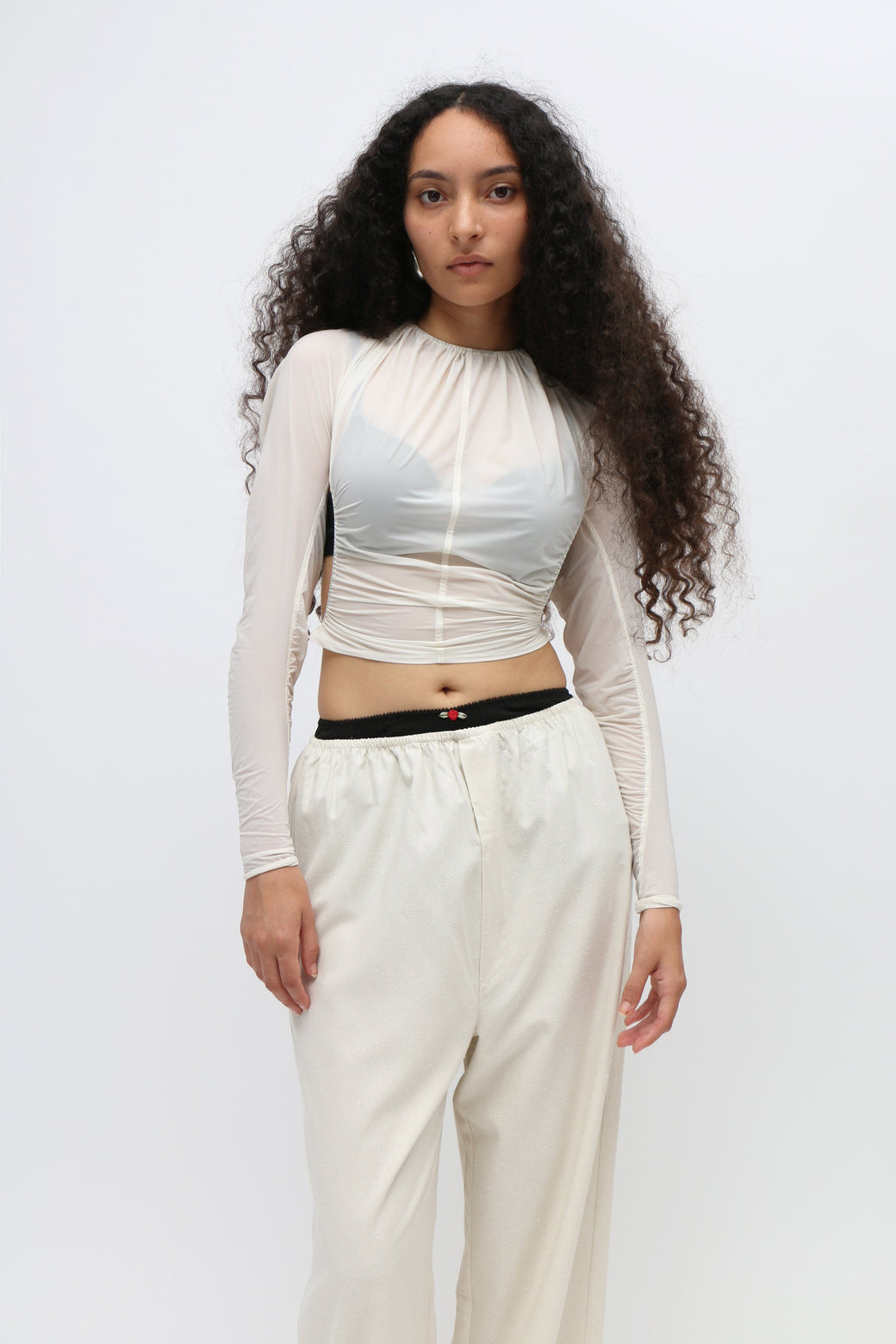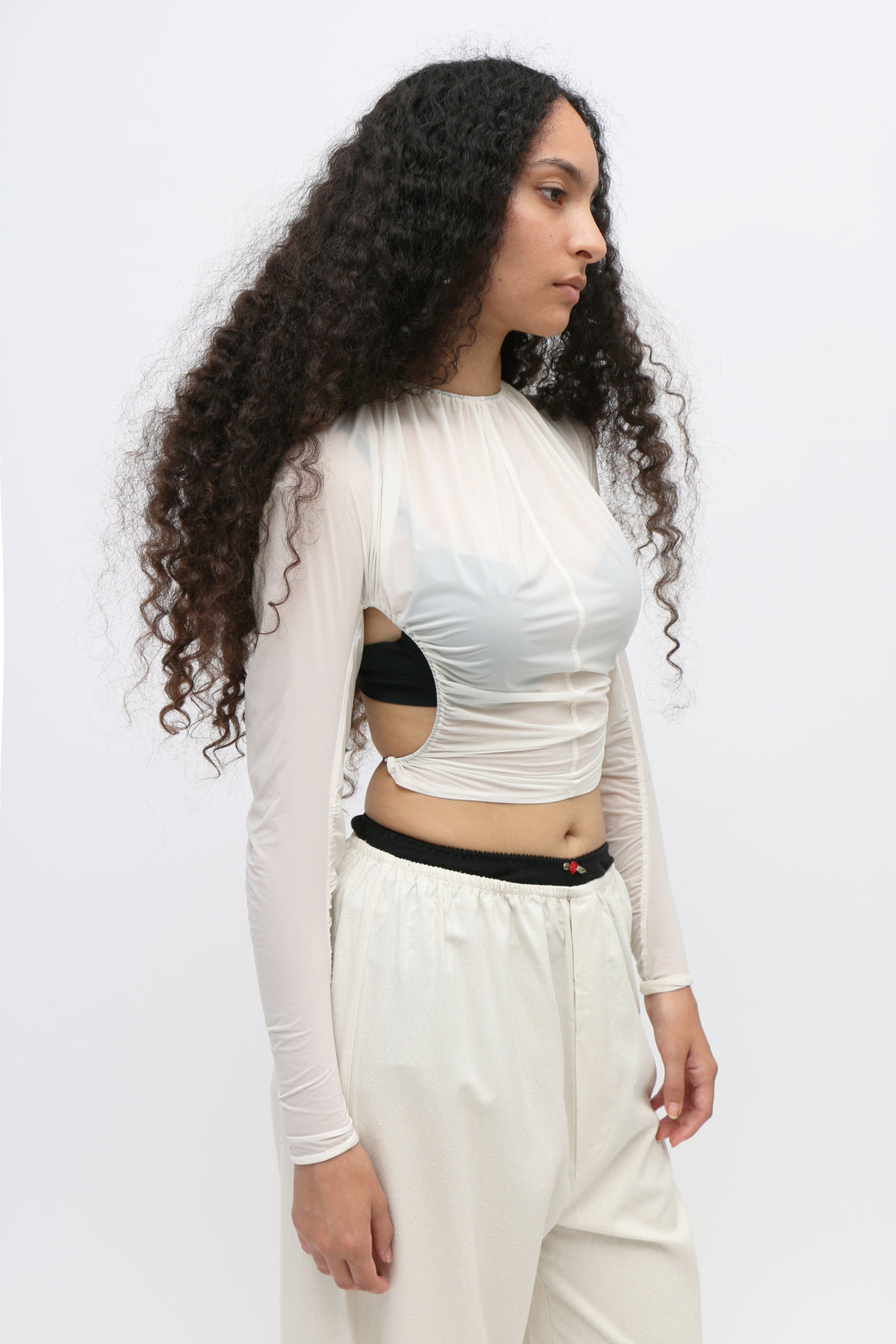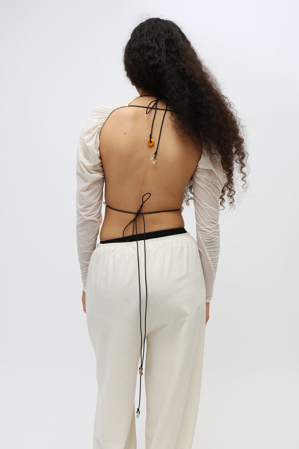 Shrunken sheer white top. Featherweight nylon fabric. Ruched neck. Open back with ties at the neck and waist. Featuring borosilicate glass colored buttons. Each glass button is unique due to its artisanal making. Worn with Primrose Bloomer Pant, layered over the Blaze Tank Top. This piece runs small, we recommend ordering next size up. Each glass button is unique due to its artisanal making, each style will have a unique assortment of colored buttons.