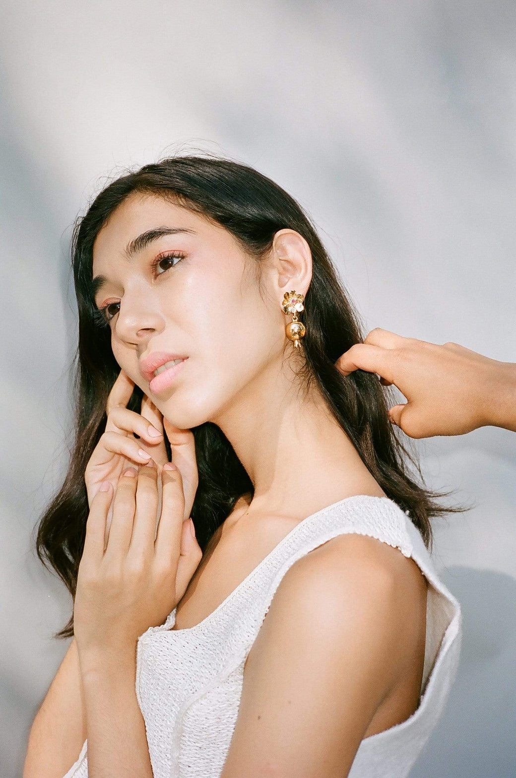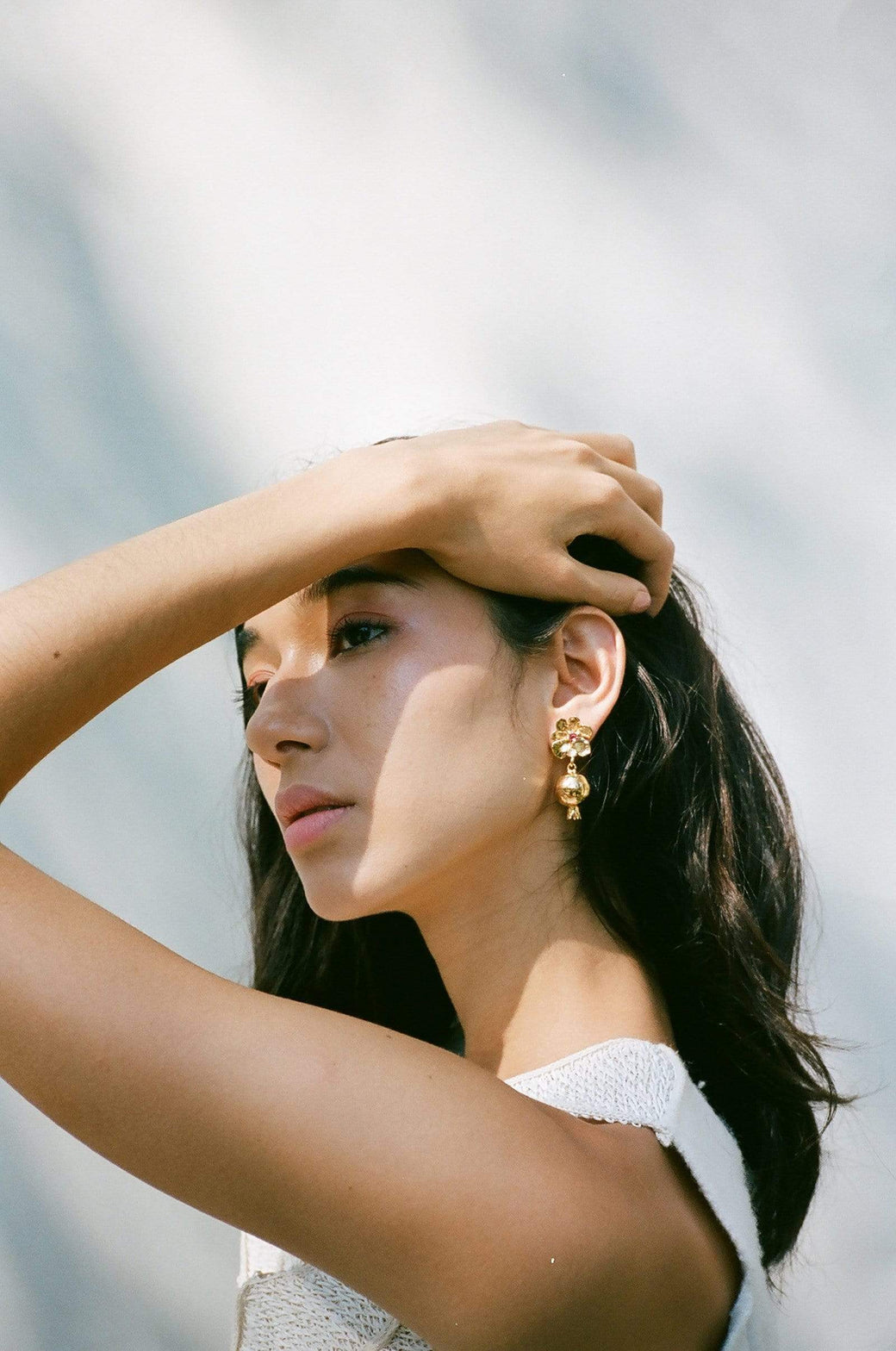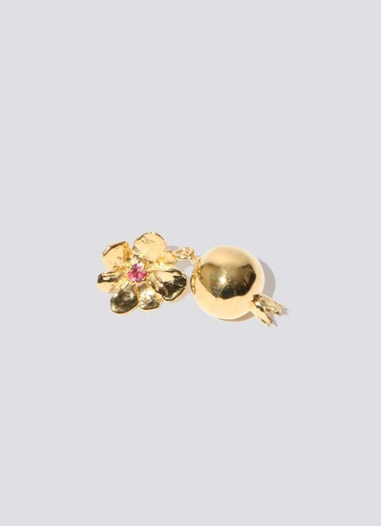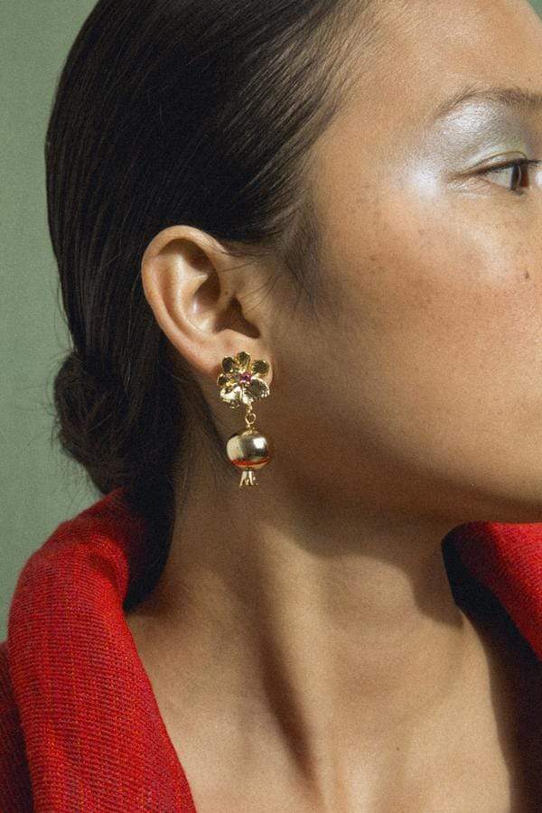 Flower with glass insert and suspended pomegranate motif. 18k gold vermeil with sterling silver ear post.