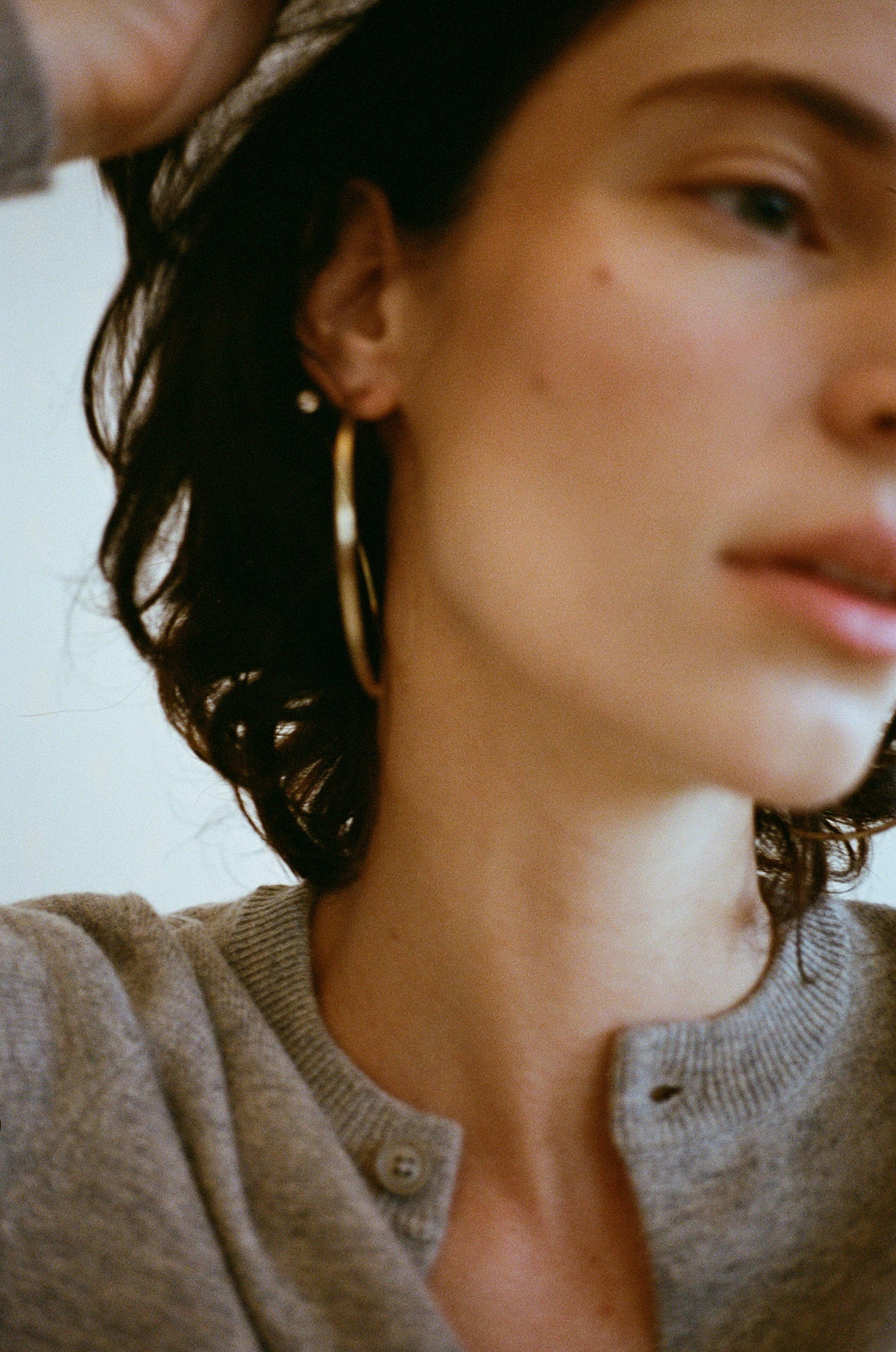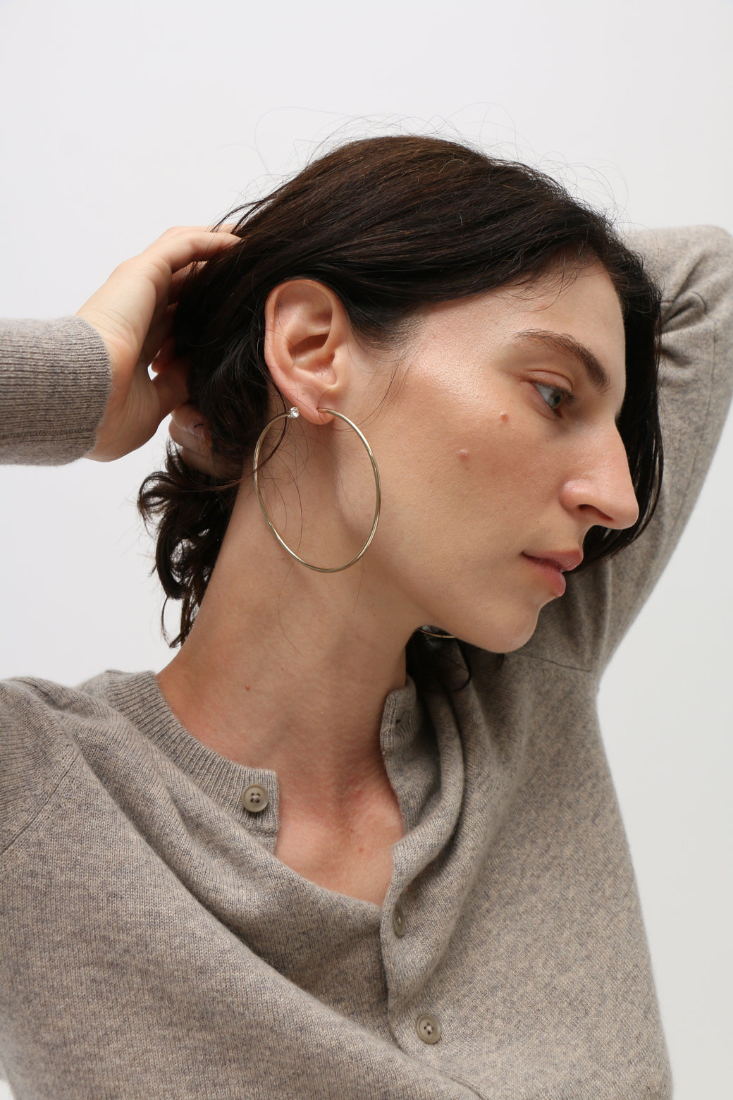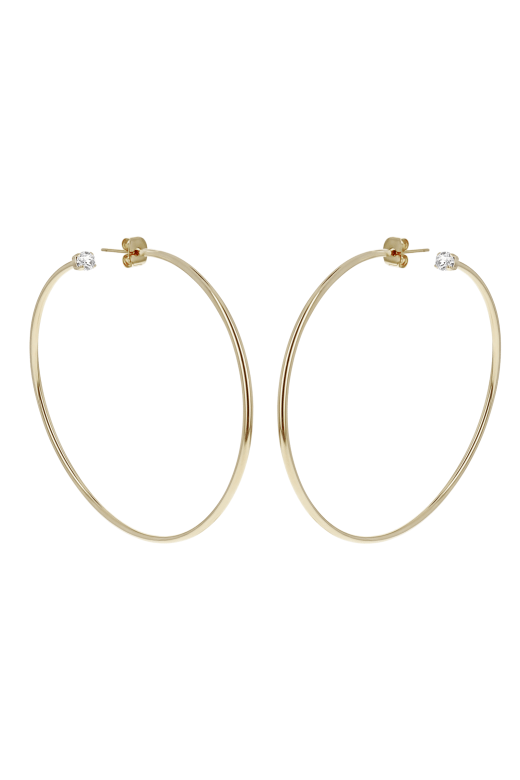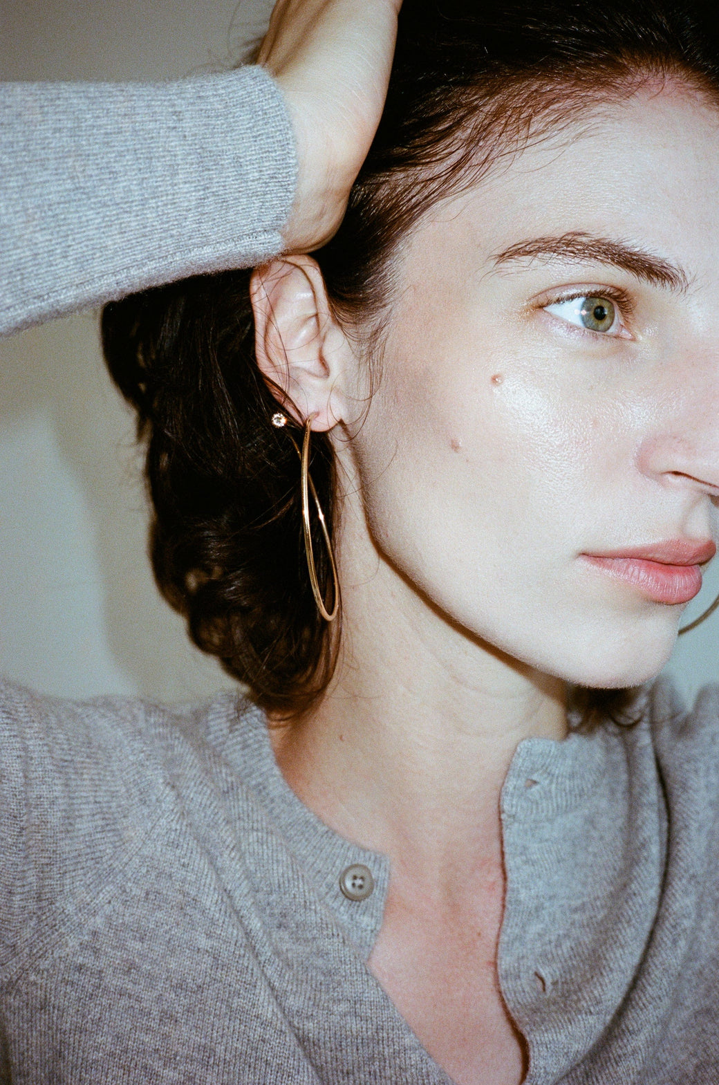 A part of Justine Clenquet's permanent collection, the Nancy Earrings are made of brass dipped in pale gold palladium. The hoops are slightly twisted while not connected, the back end facing front features a crystal diamond. Designed and handmade in France.