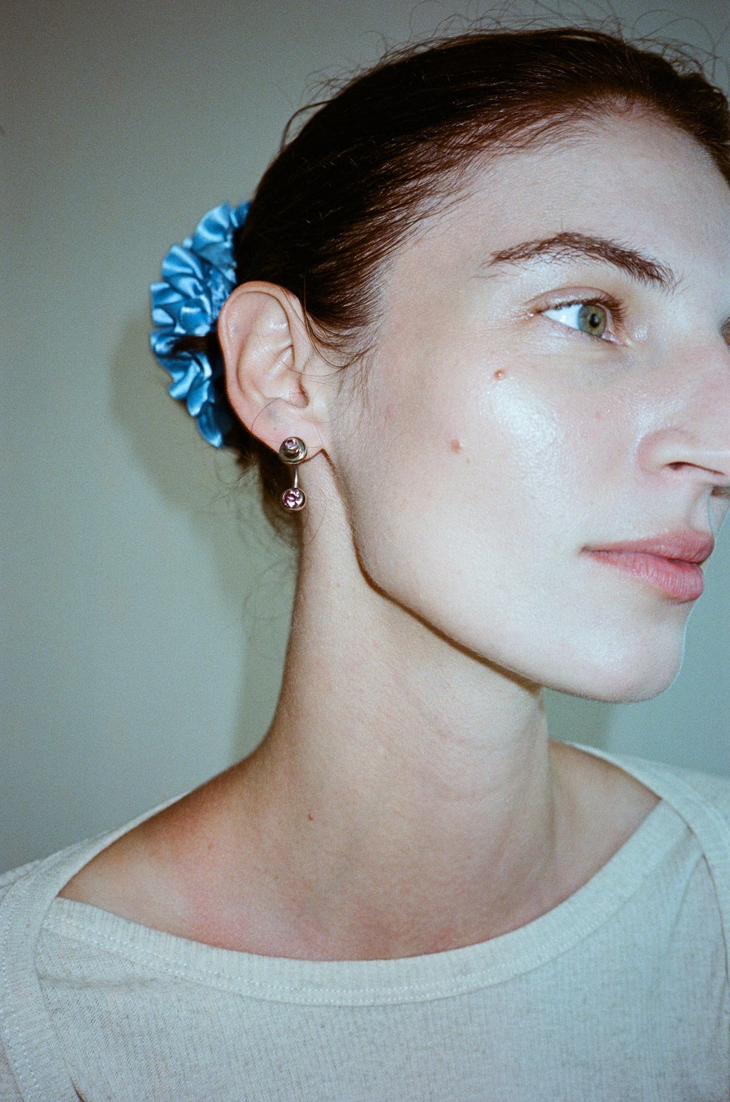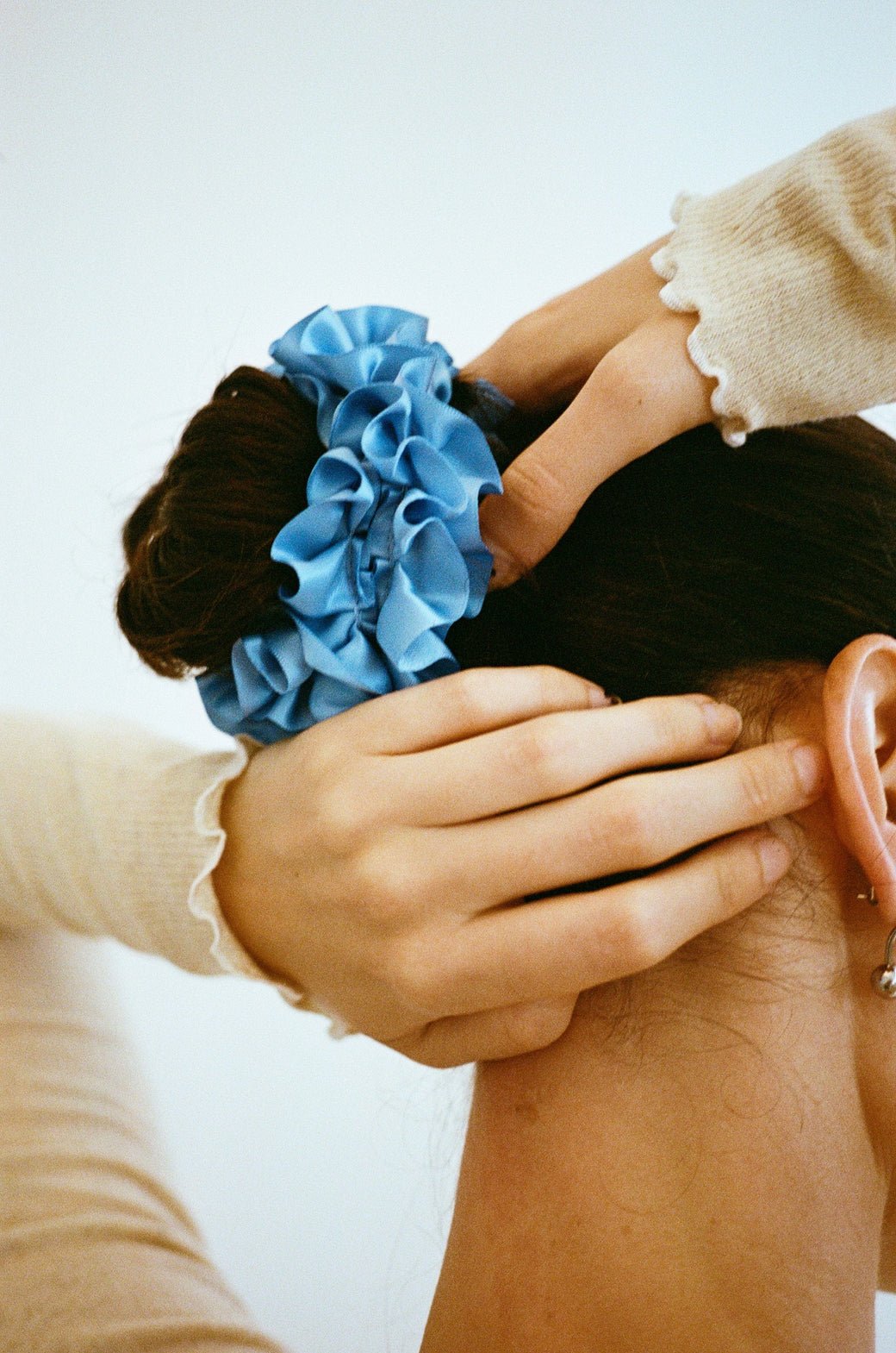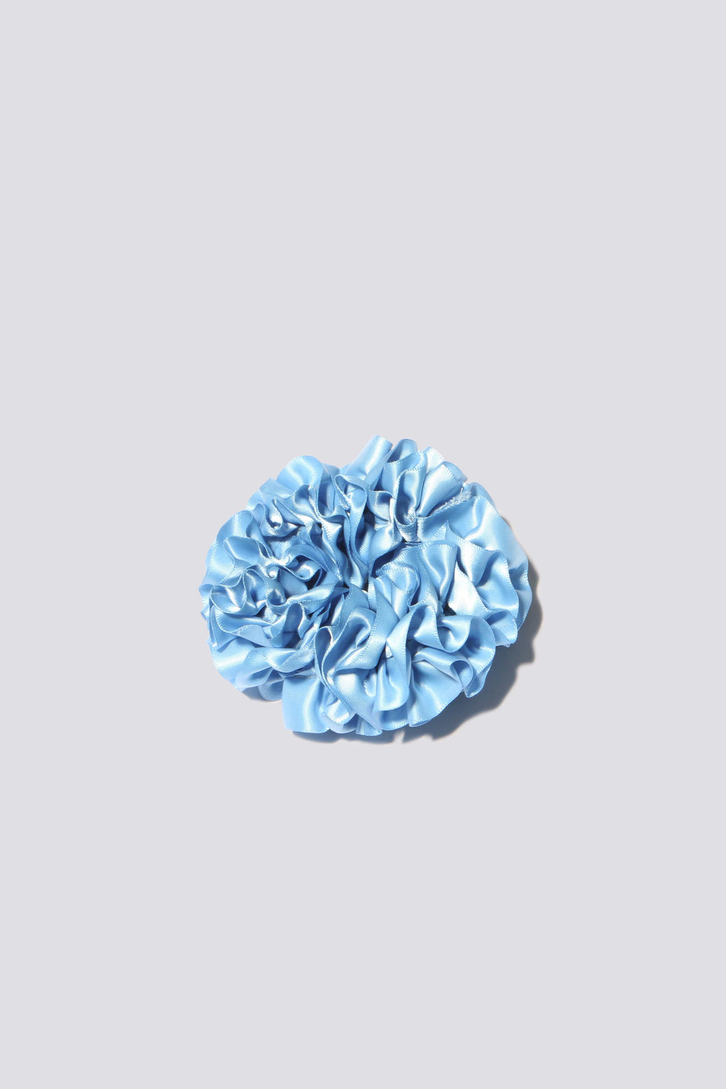 Hair scrunchie in color light baby blue. Furled silk resembling carnation petals. To be worn in the hair or adorned on the wrist or ankle.