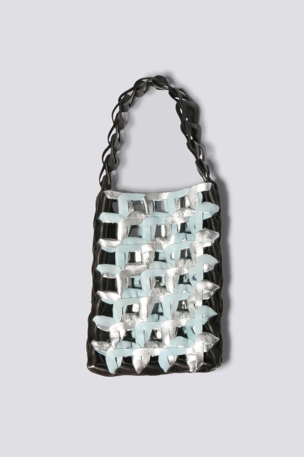 Maimoun Spring 2025 exclusive, the Current Medium Links Tote is made from upcycled leather with interlocked links. It features a mixed light blue and silver metallic interior with a black spine.