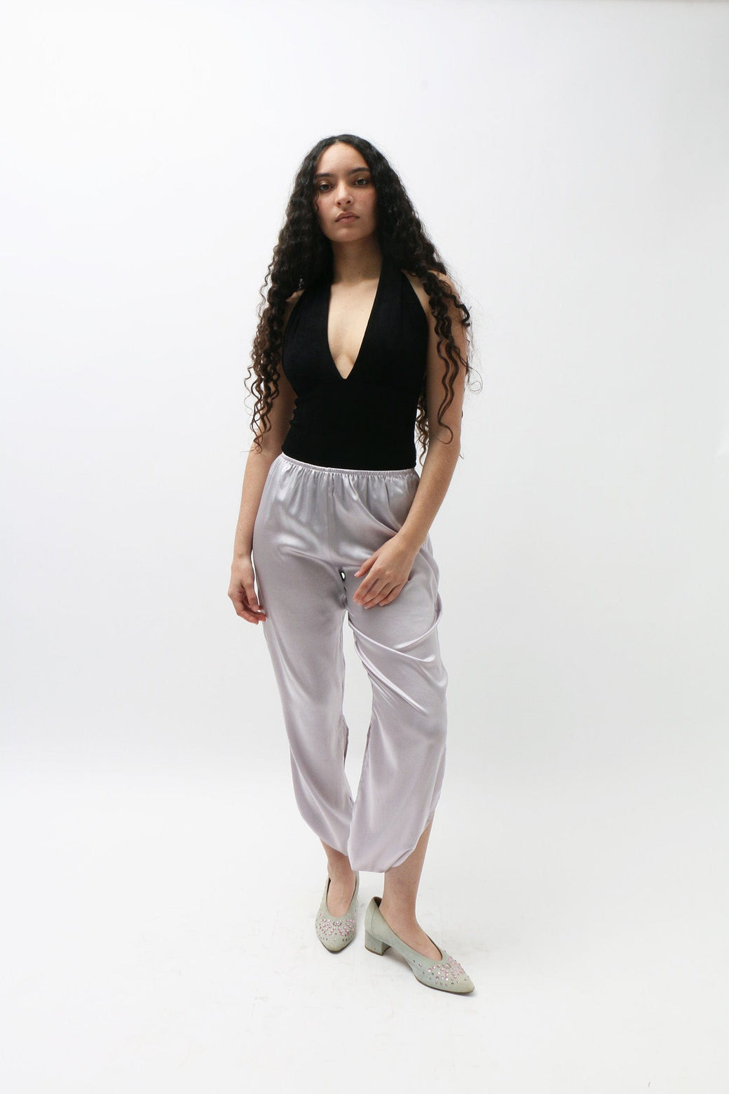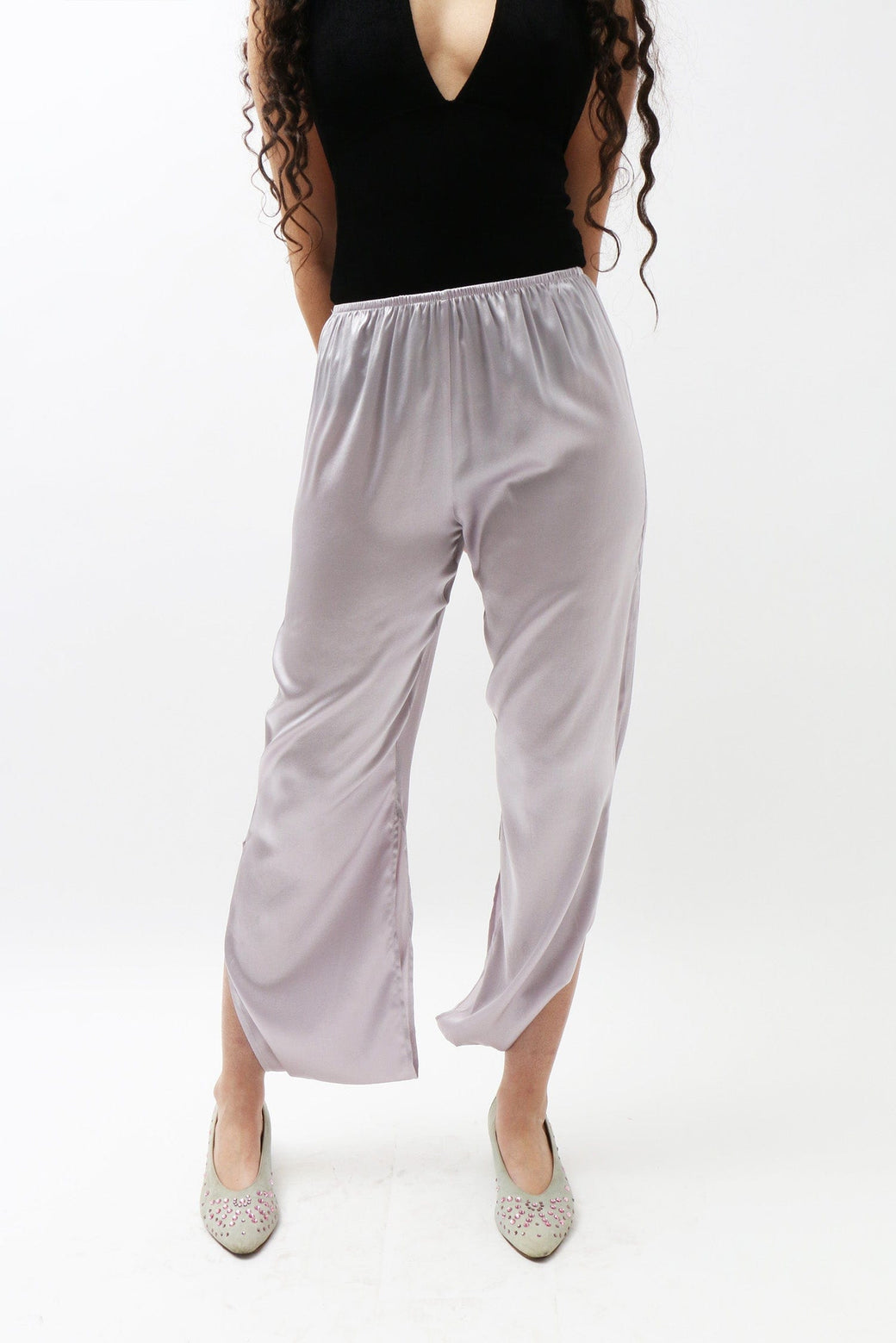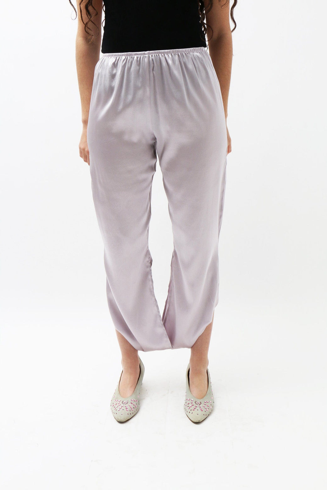 Silk periwinkle satin pants featuring an elastic waistband and loops at the cuffs. The versatile cut-out loops can be styled either inside or outside the legs.