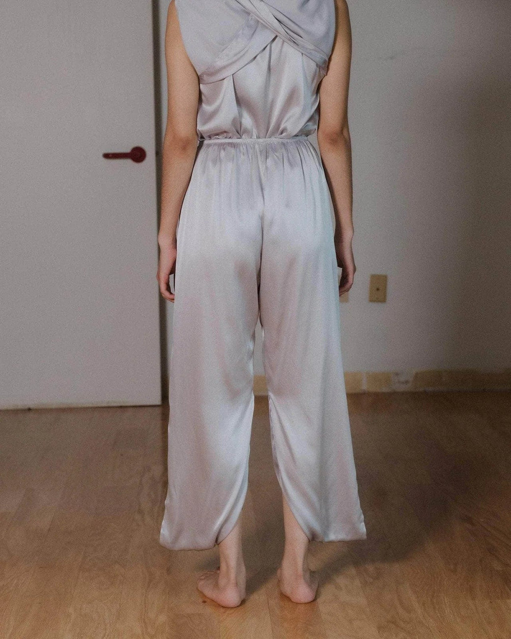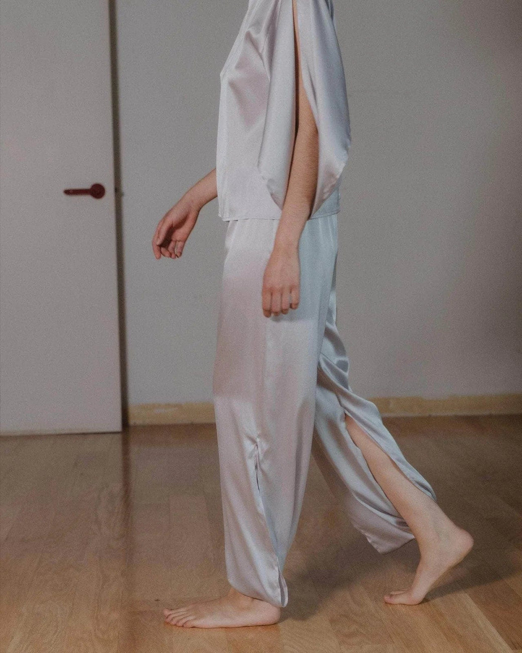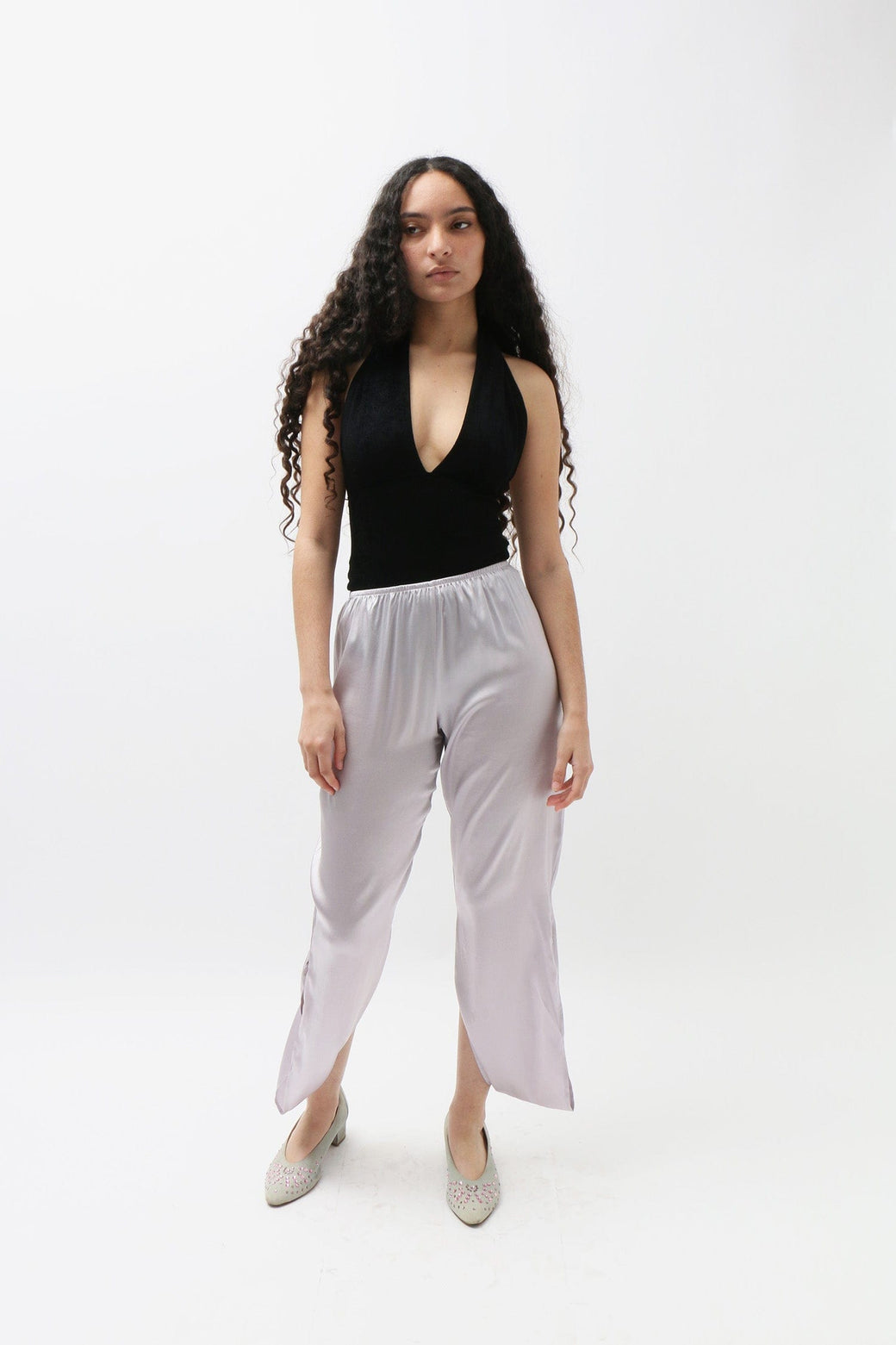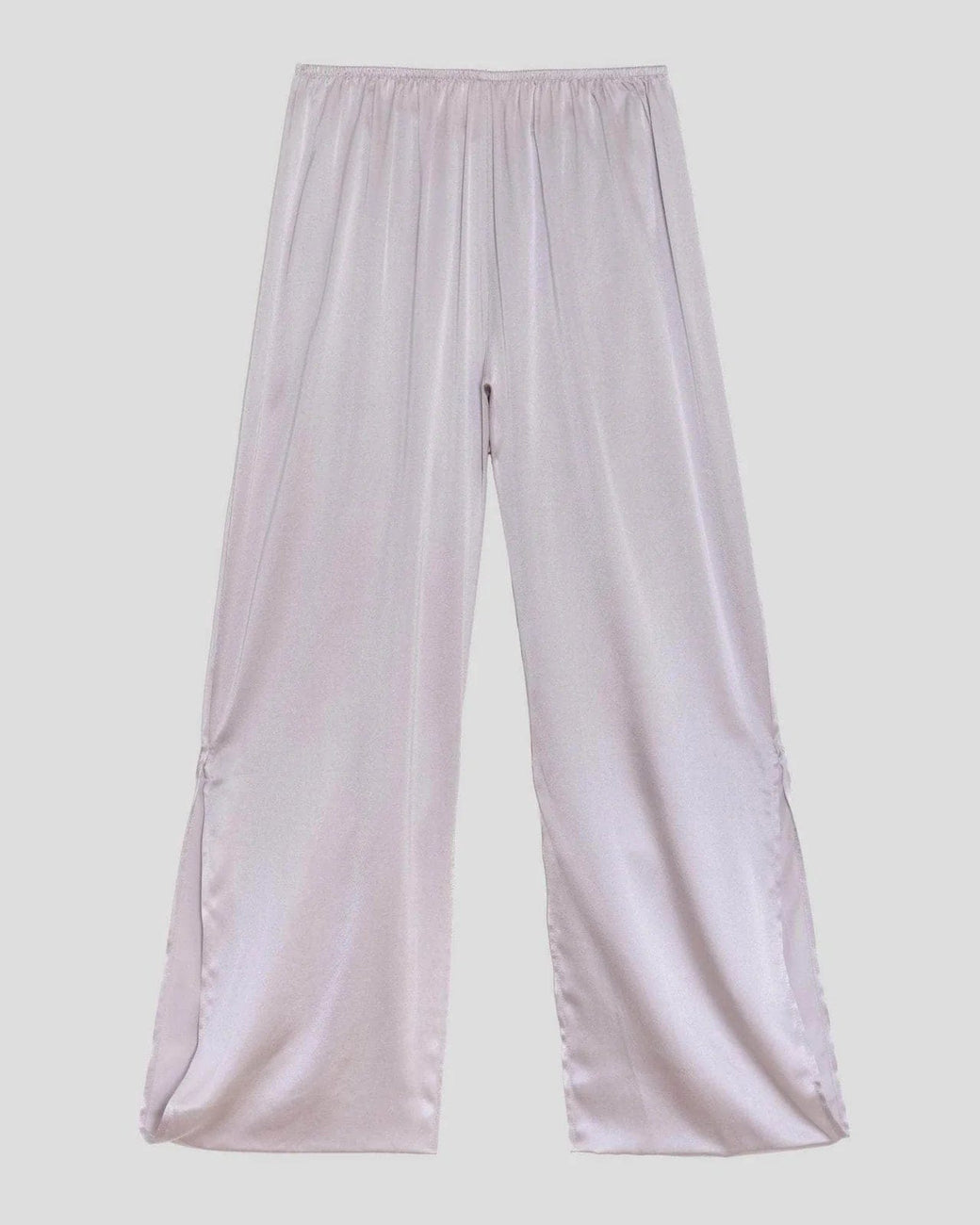 Silk periwinkle satin pants featuring an elastic waistband and loops at the cuffs. The versatile cut-out loops can be styled either inside or outside the legs.