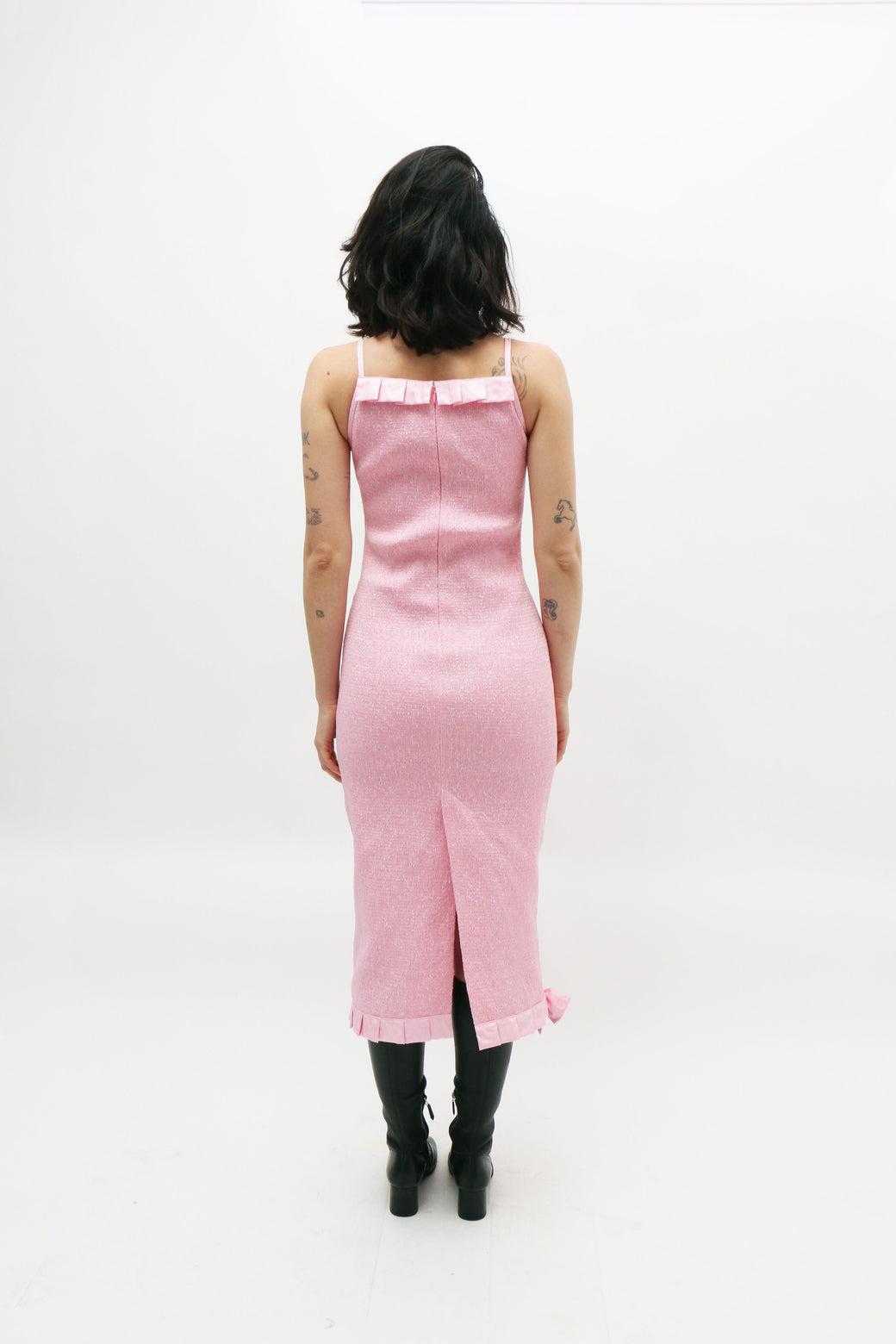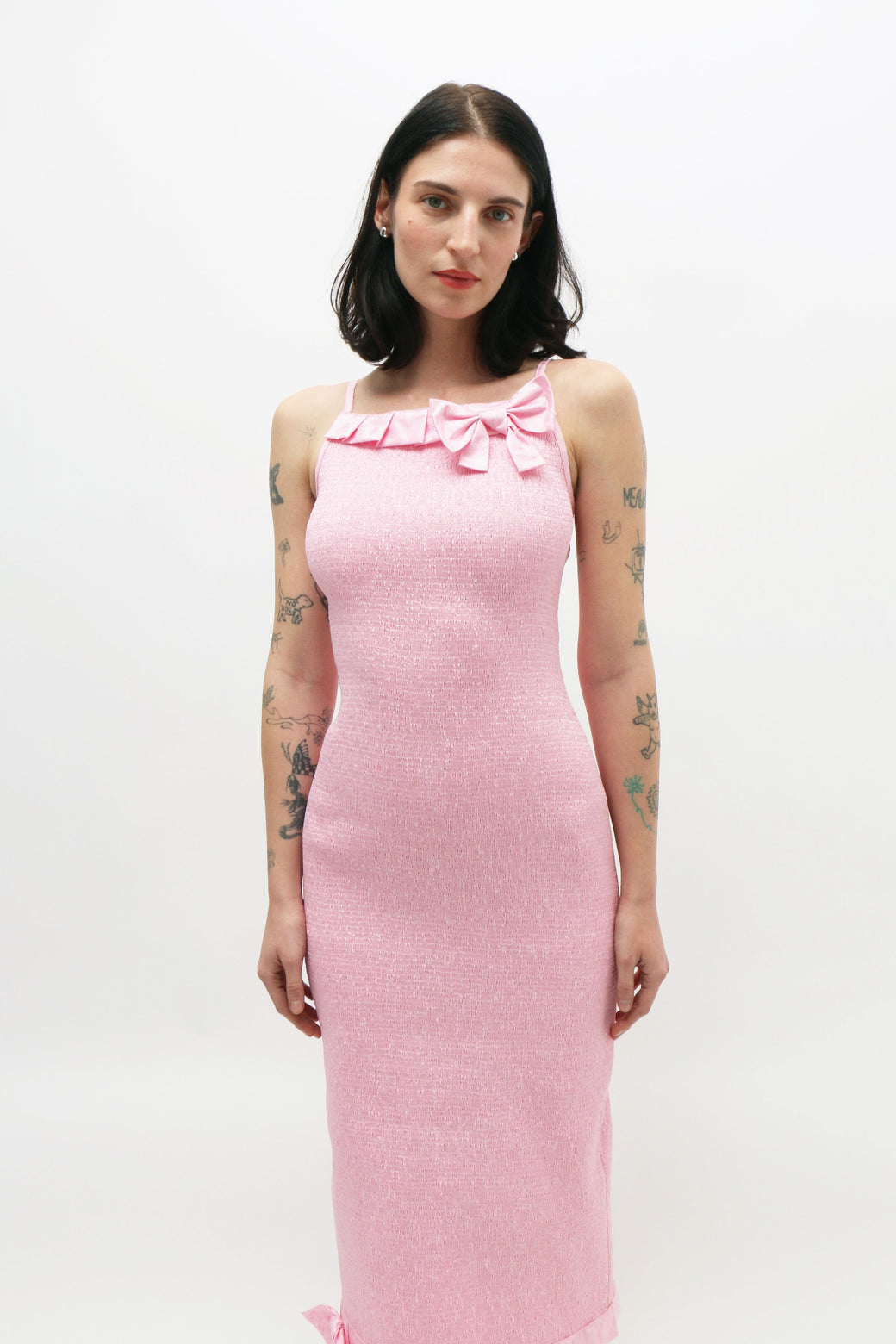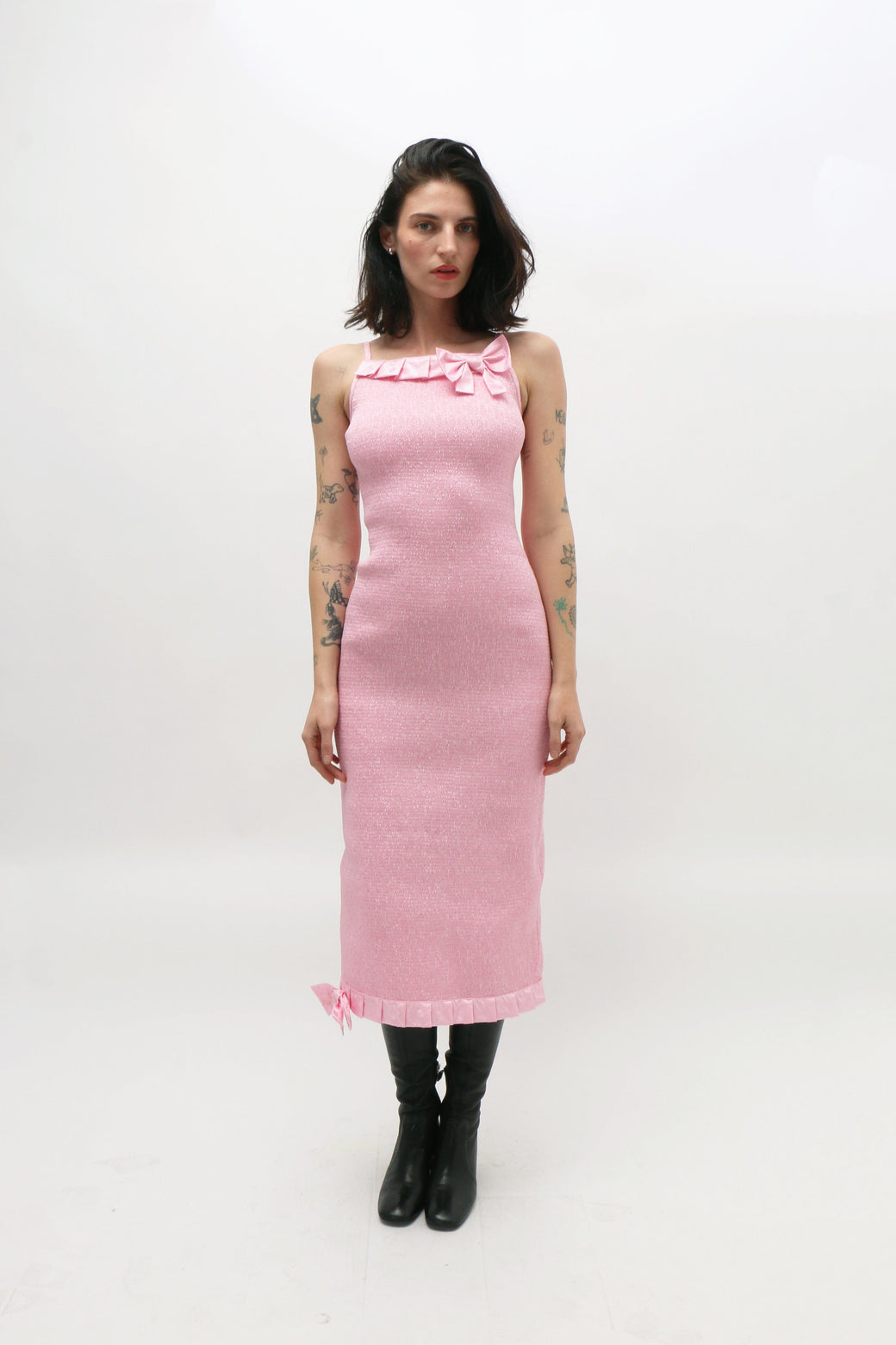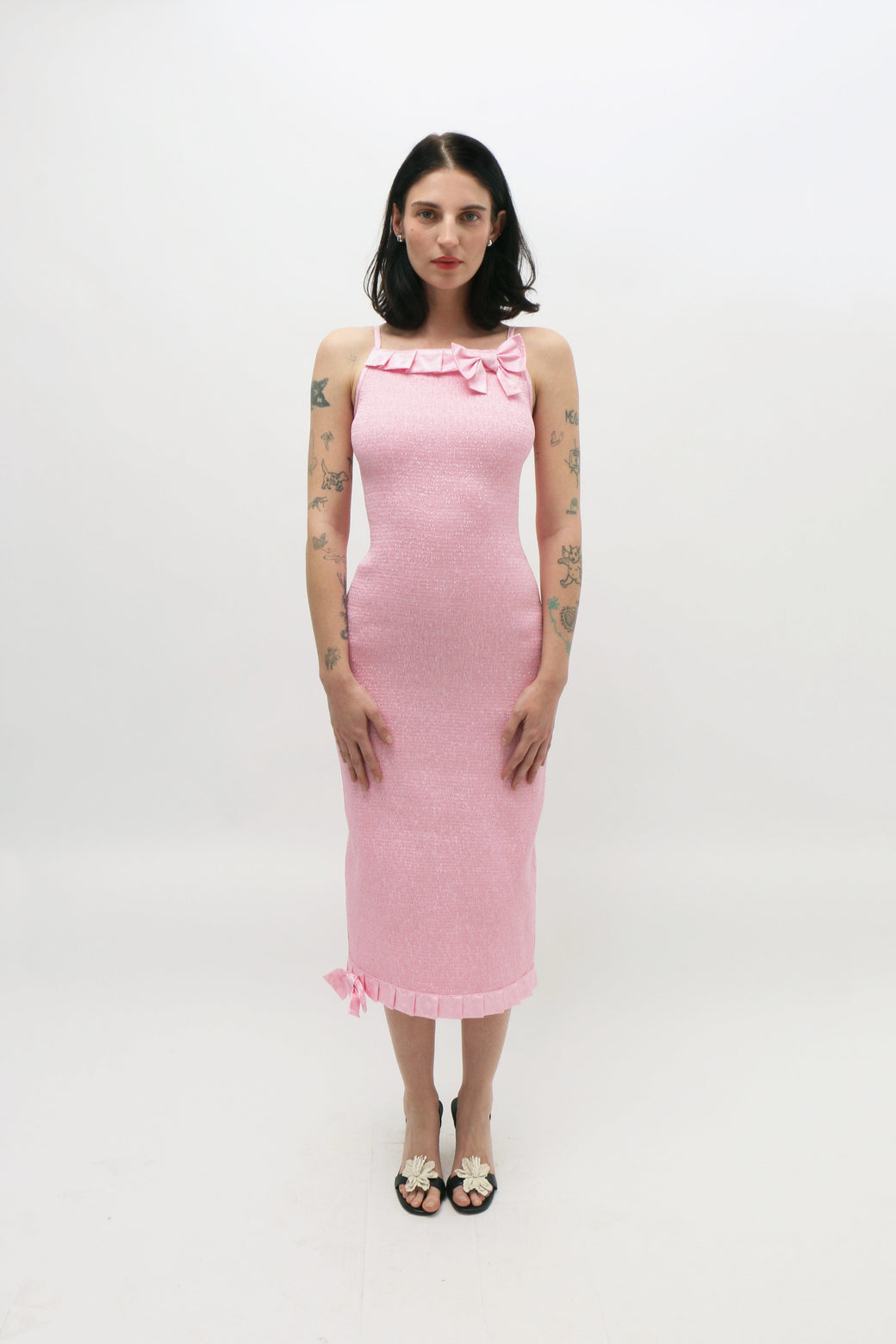 Baby pink fitted midi dress with gathered ruched details throughout, featuring spaghetti straps and a square neckline. The ruffled pleated hemline is adorned with two bows at the neck and bottom hem.
