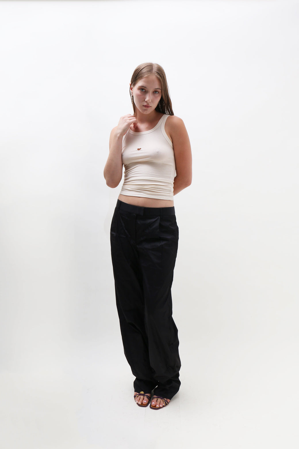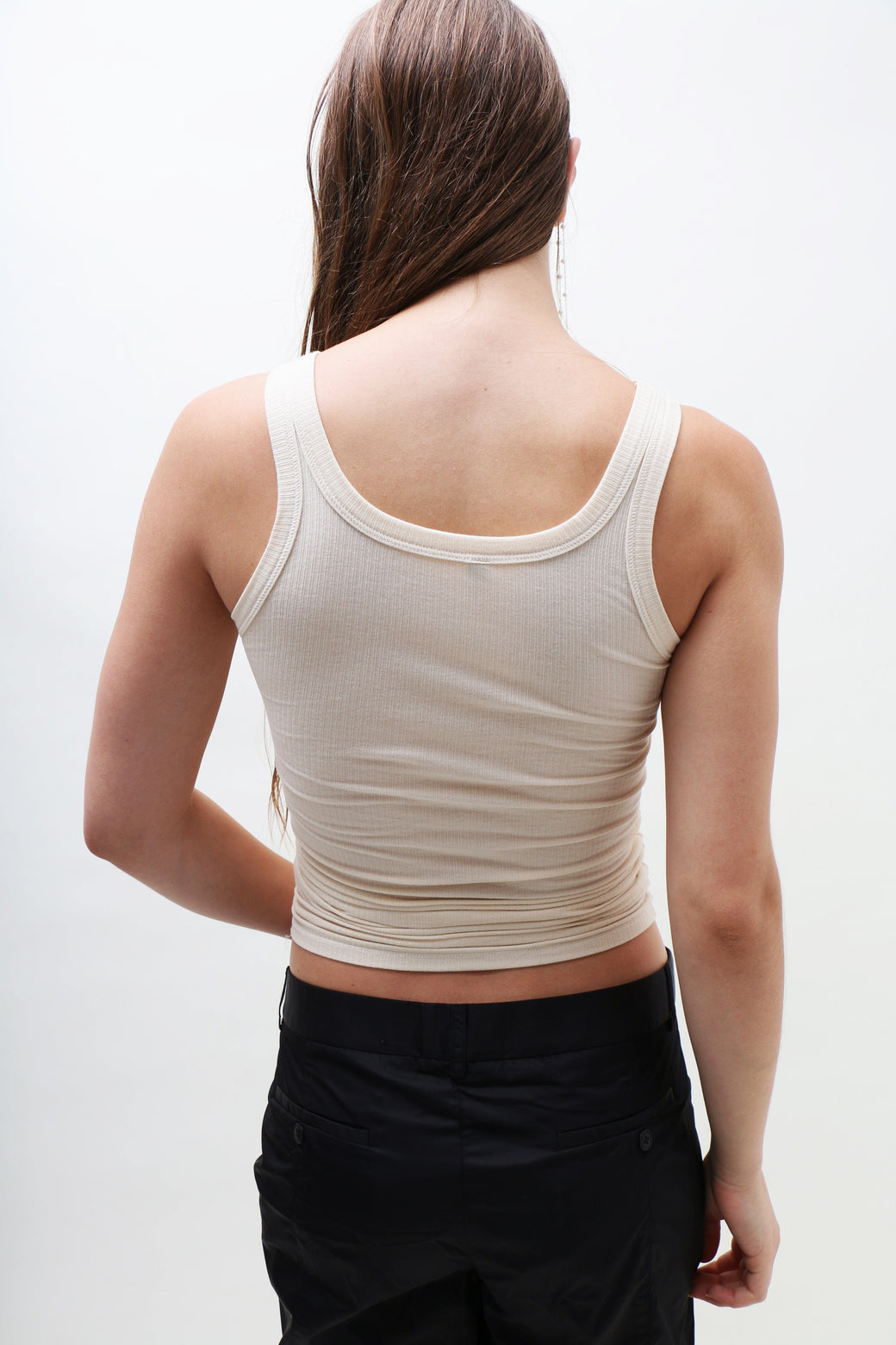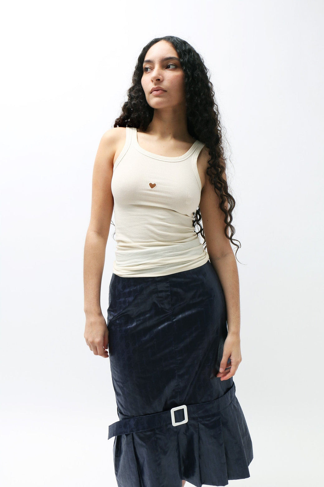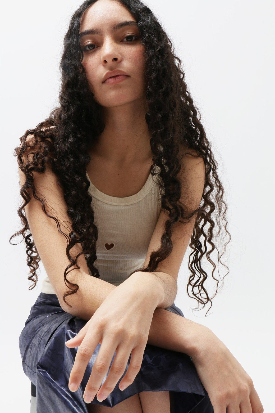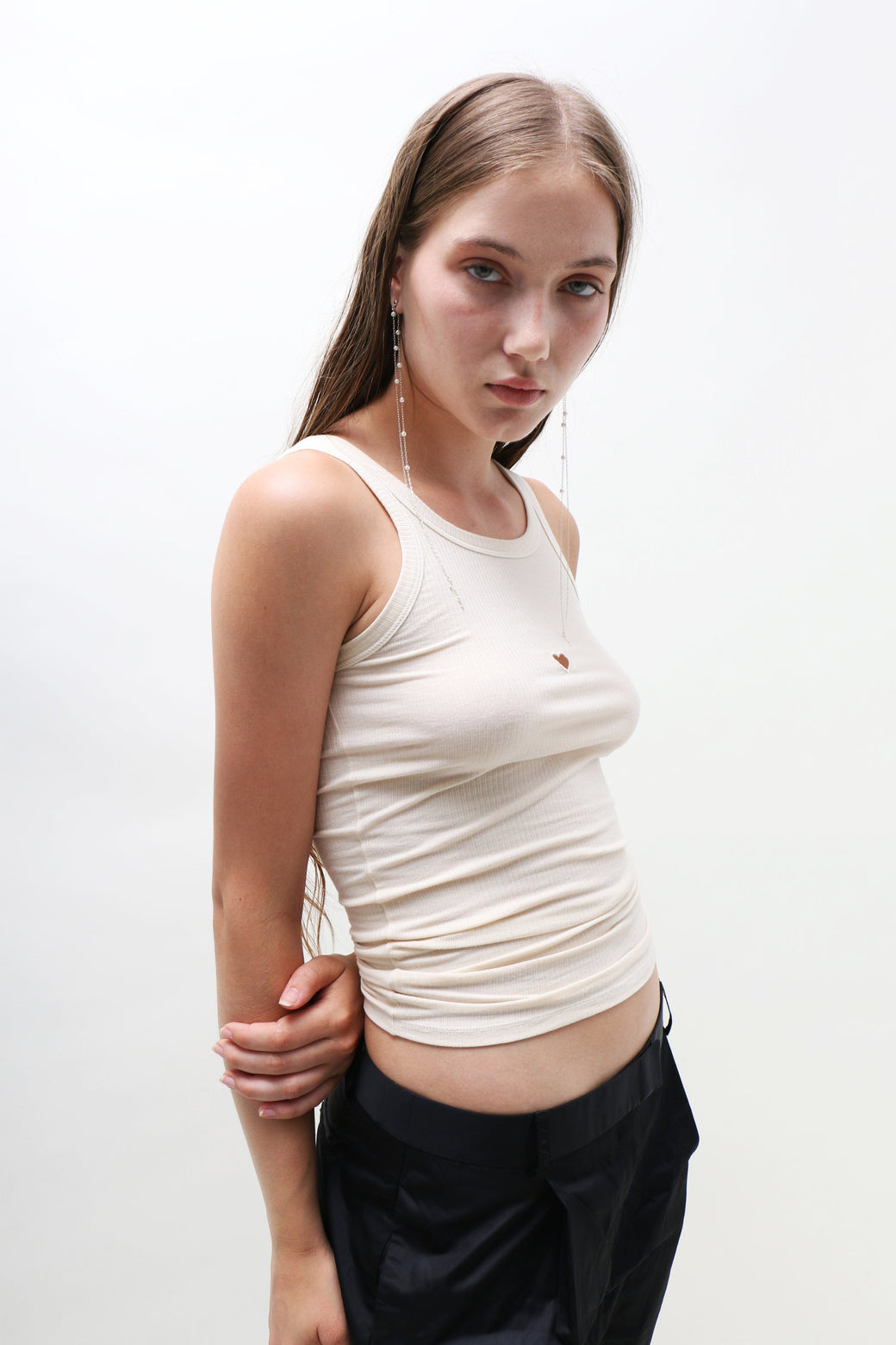 Ribbed organic cotton tank top featuring a subtle yet charming detail, a mini heart cutout placed on the chest. In off-white.