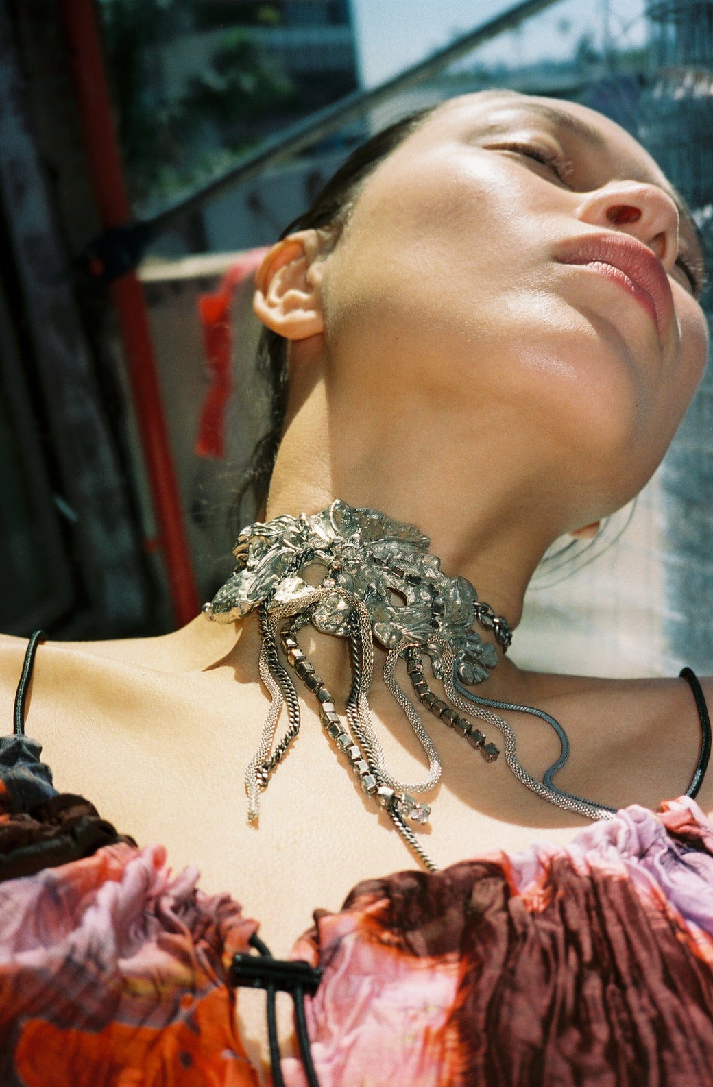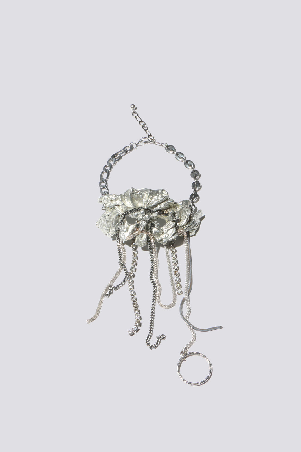 The Web Flower Choker, featuring a web like pattern of flower shapes. With up-cycled chains woven in and attached to the flower pendant. Made from up-cycled from pewter cutlery; one of one. Each piece may vary in shape and size.