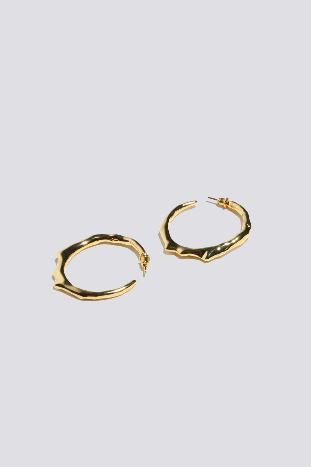 Resembling the movement of liquid in solid form. These hoops are made from solid 18 KT gold plated brass, nickel free posts. Weighted but comfortable. Handmade in New York.