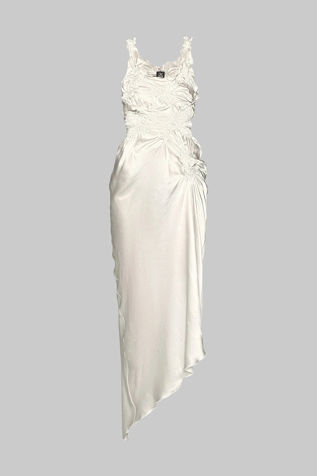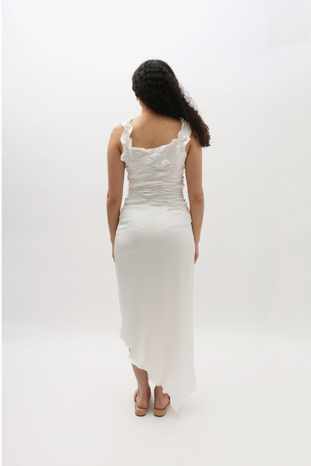Now available in white, this fitted silk crepe dress features an asymmetric hem and echoes J.Kim’s delicate Markiza theme. Hand-sewn paisley motifs gather and flow organically across the bodice, adding texture and movement. Finished with playful lettuce-edge detailing and bold red topstitching throughout, the pristine white hue enhances its sculptural elegance.