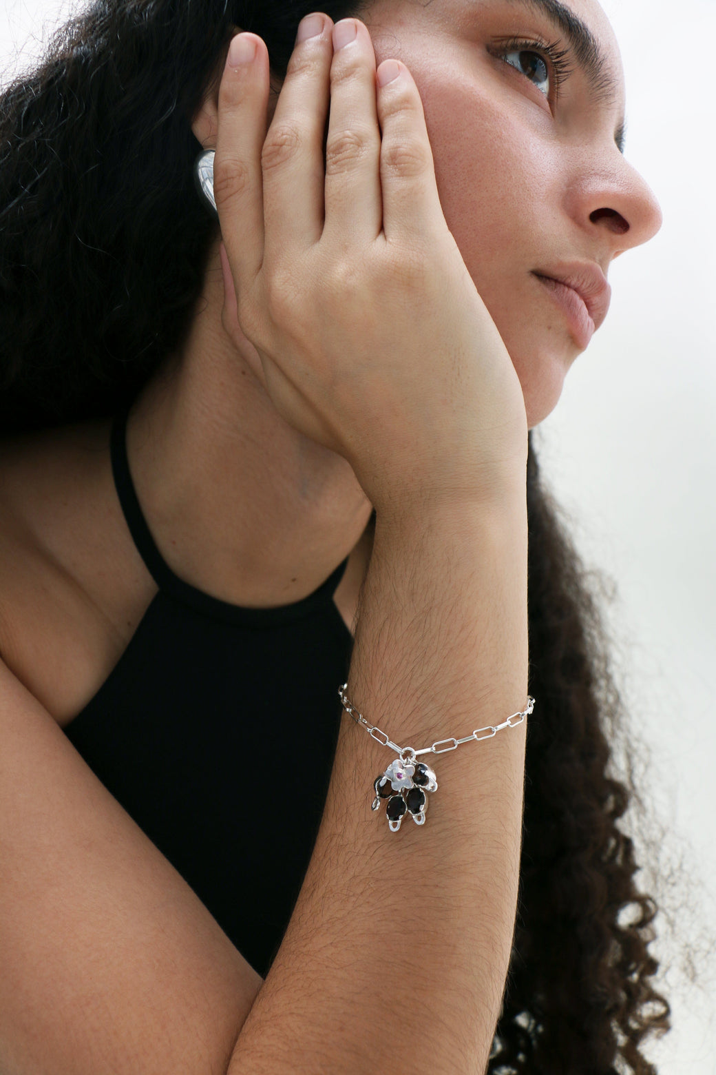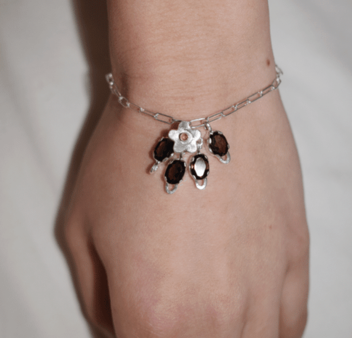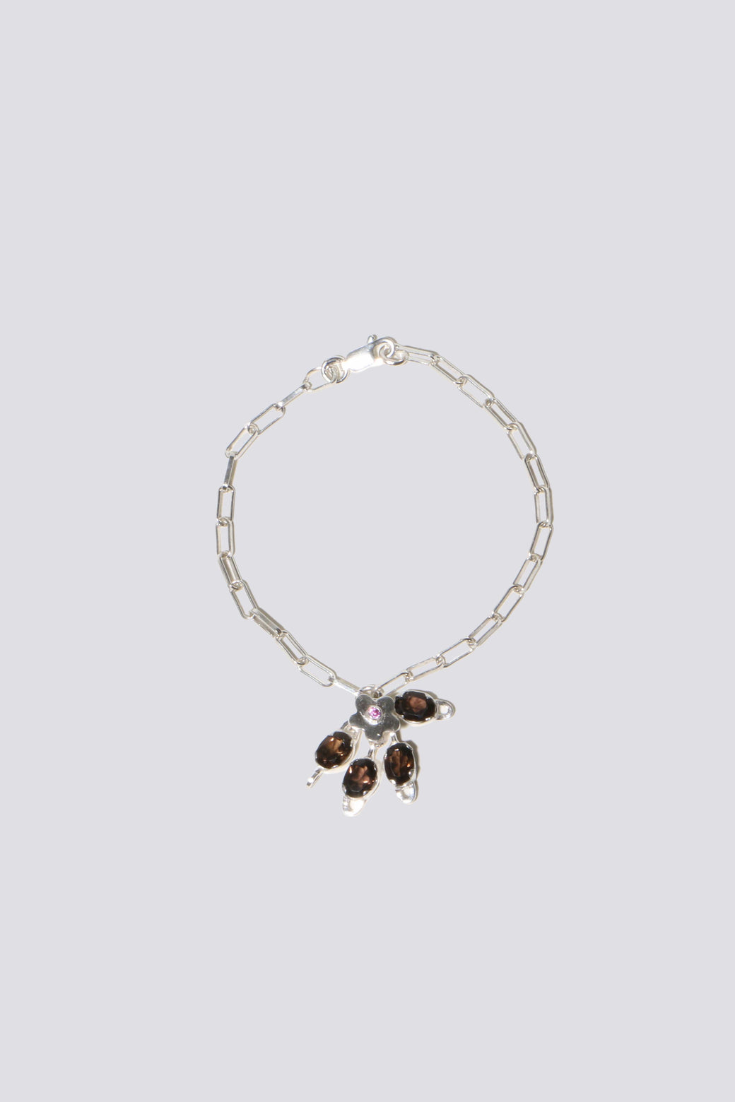 Silver chain-link bracelet with a small flower-cluster charm. The flower features smoky quartz leaves and a pink sapphire center.