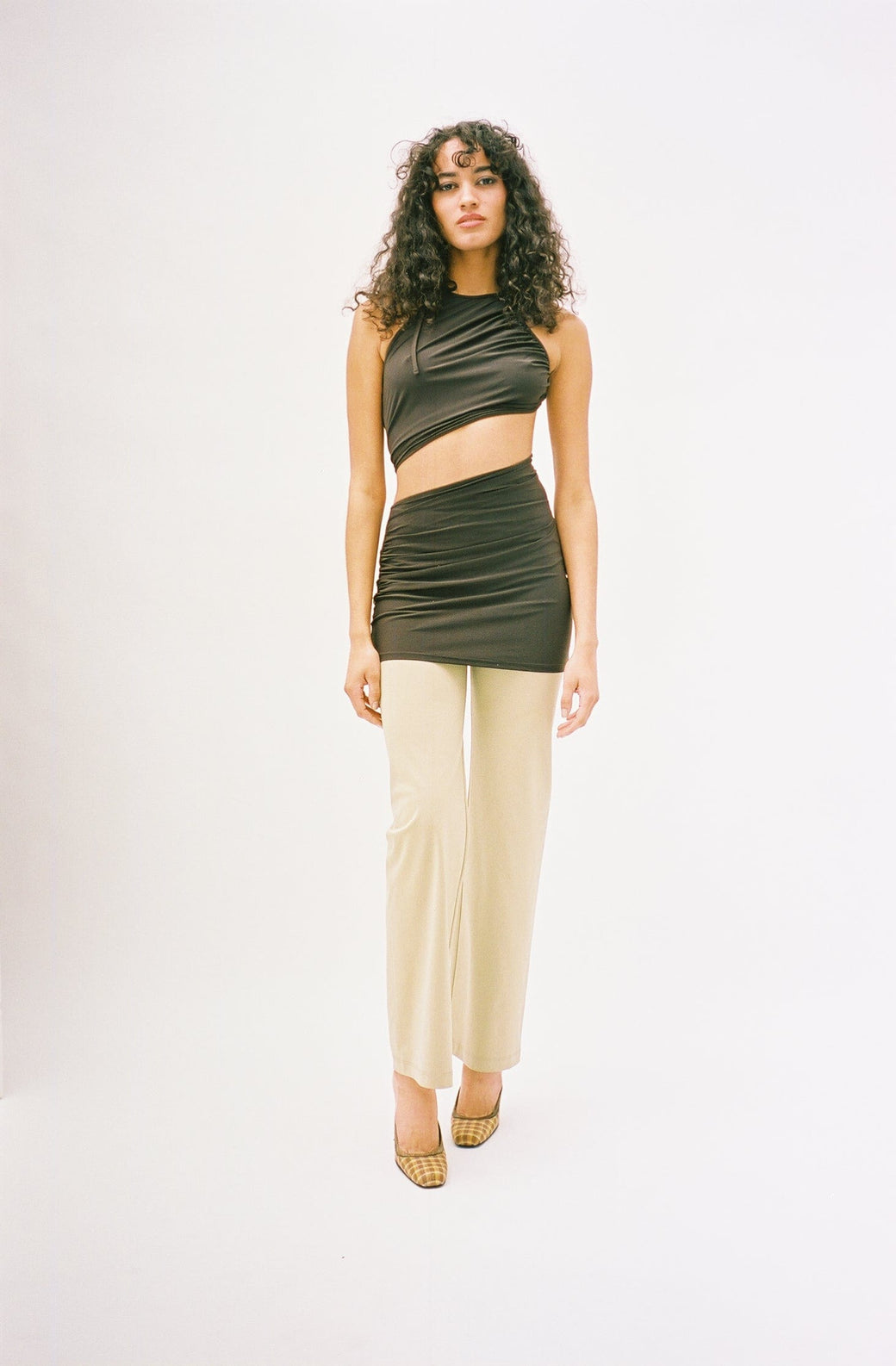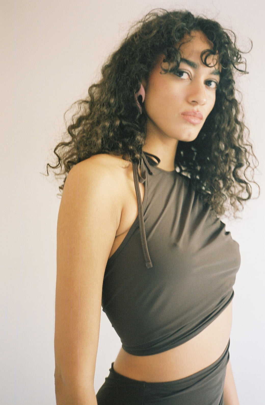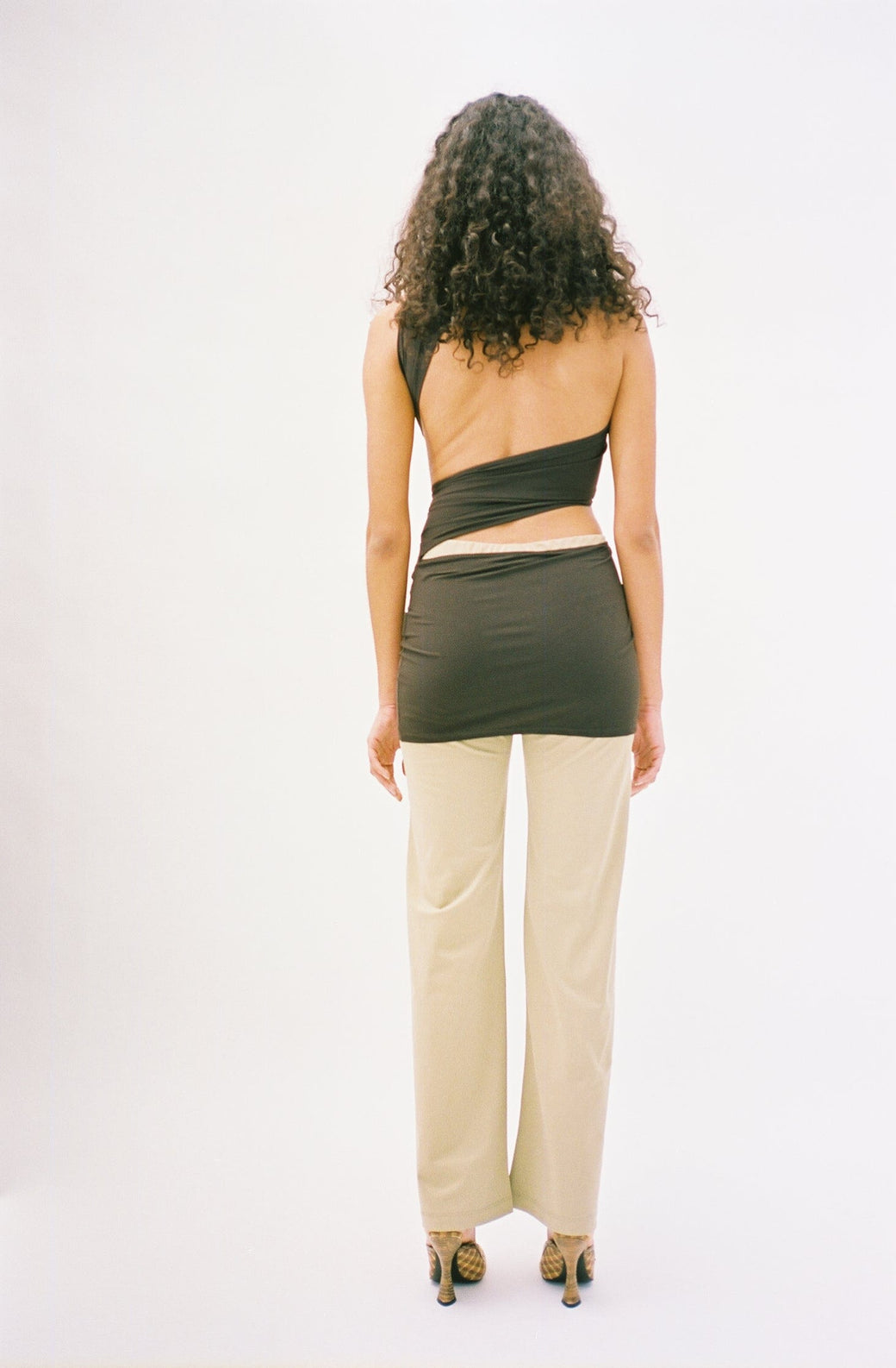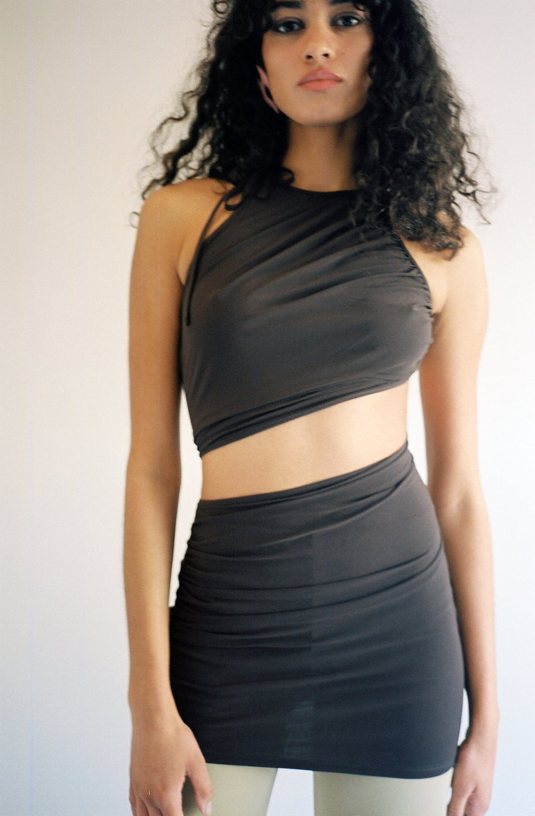 A deep brown spiral wrap dress in stretch nylon jersey. Featuring a form-fitting silhouette that curves and hugs every body type differently. A perfect party minidress, or dynamic layering piece. Round crew neck with self-tie fastening at back collar. Button fastening at the back waist to secure the wrap dress in place. Developed in the brands' studio in Paris on Boulevard Voltaire, focused on process and artistic gesture. Worn here over the Sandstone Dance Pant.