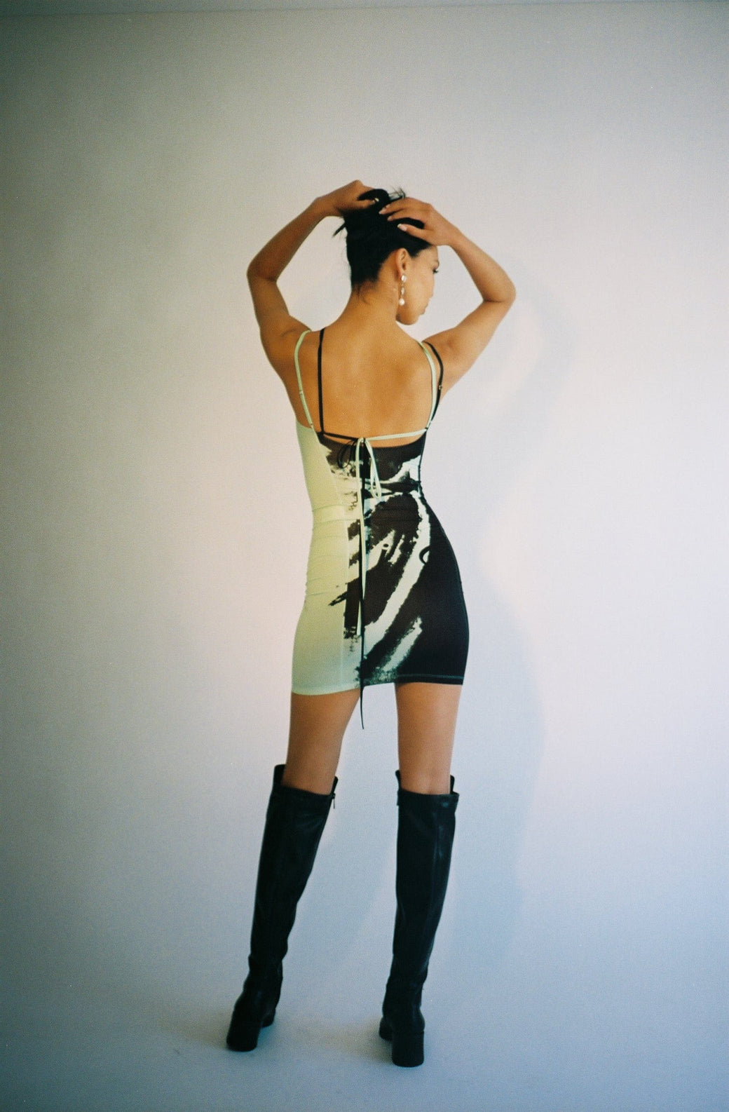 Mint green and black printed mini dress. Square neckline with criss-cross ties at the neckline with slitted corners. Showcasing a print of an abstract sequin dress. Thin adjustable asymmetrical strappy detailing with silver hardware. Can be worn multiple ways.This item is Final Sale.