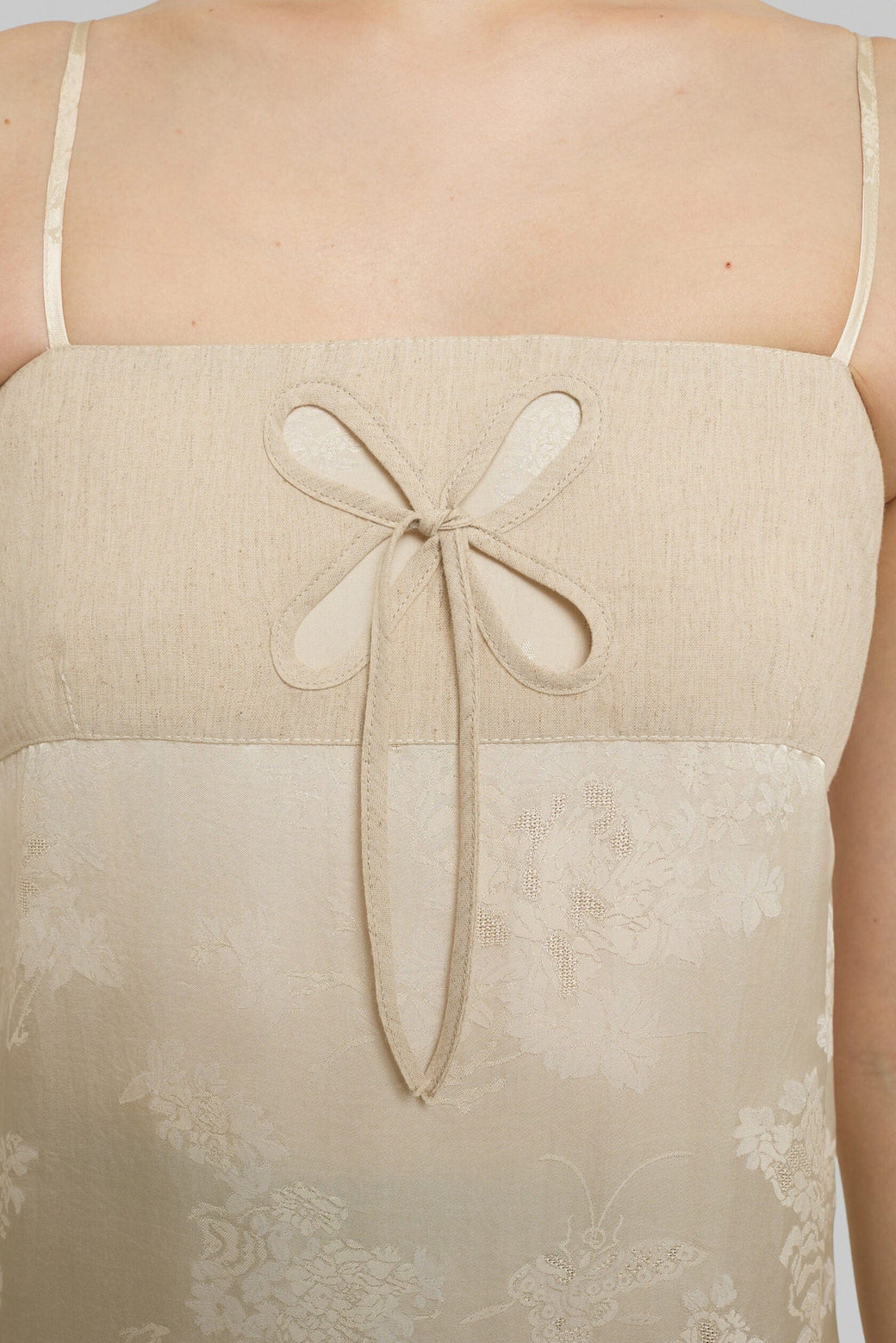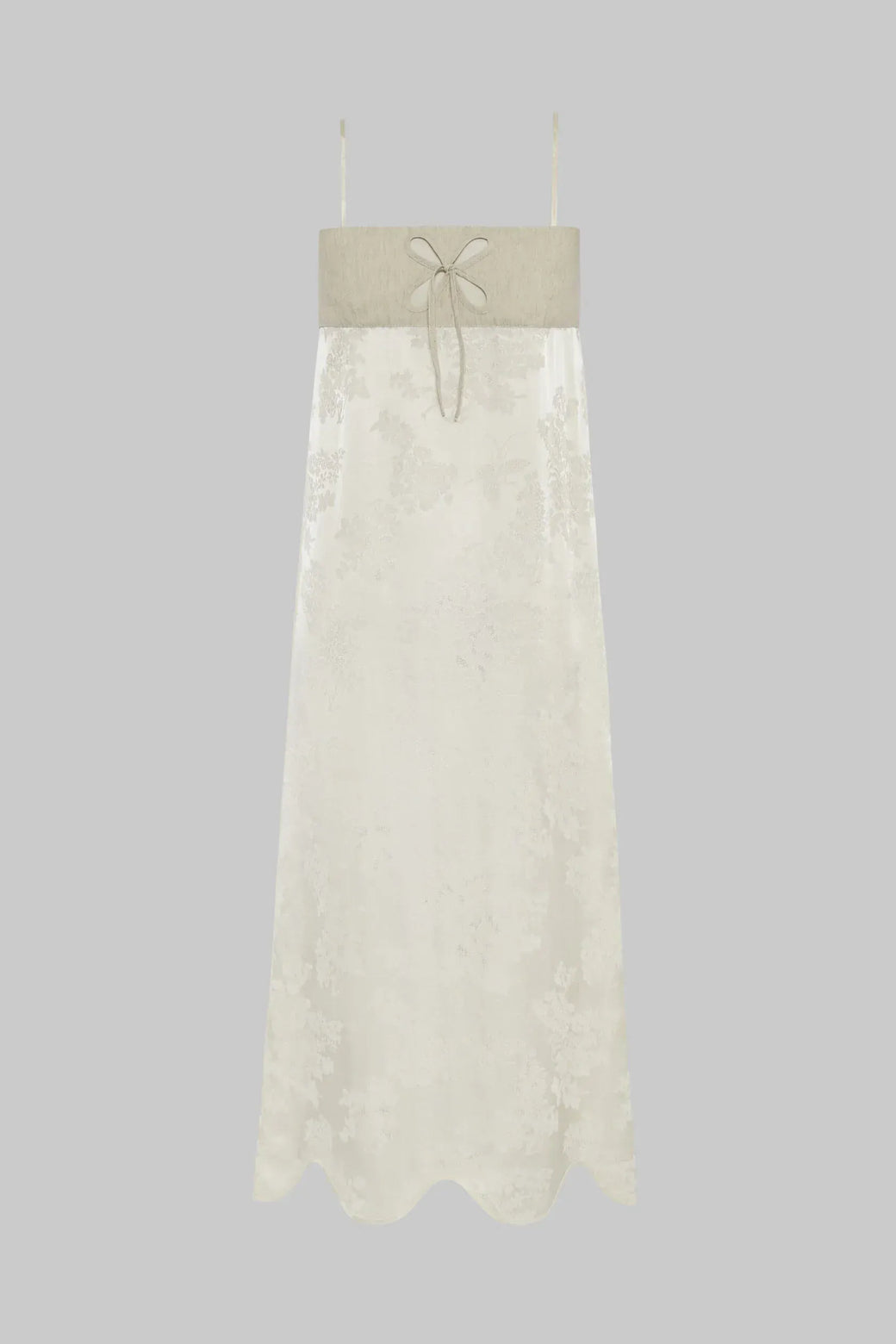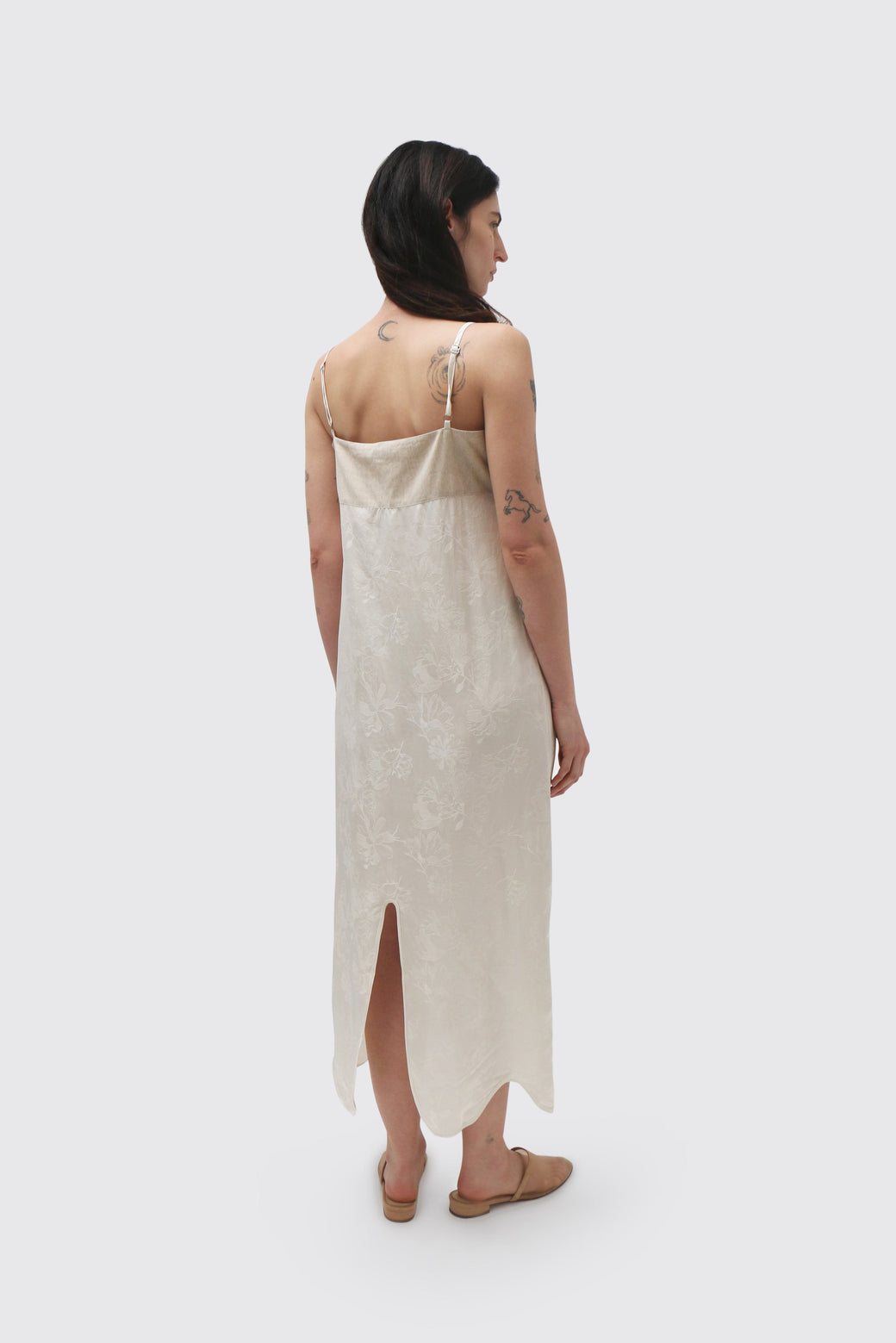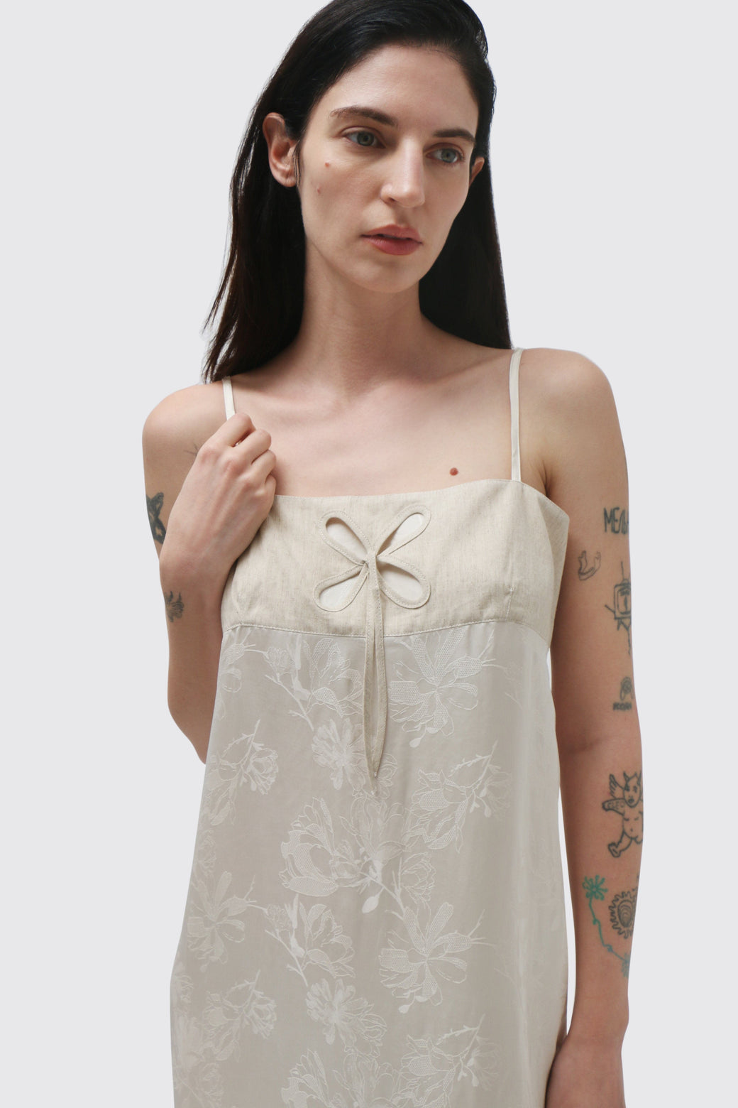 Bandeau dress with dimensional petal appliqué and a petal-shaped hemline. Linen bodice balanced by a floral jacquard skirt, creating texture and contrast.