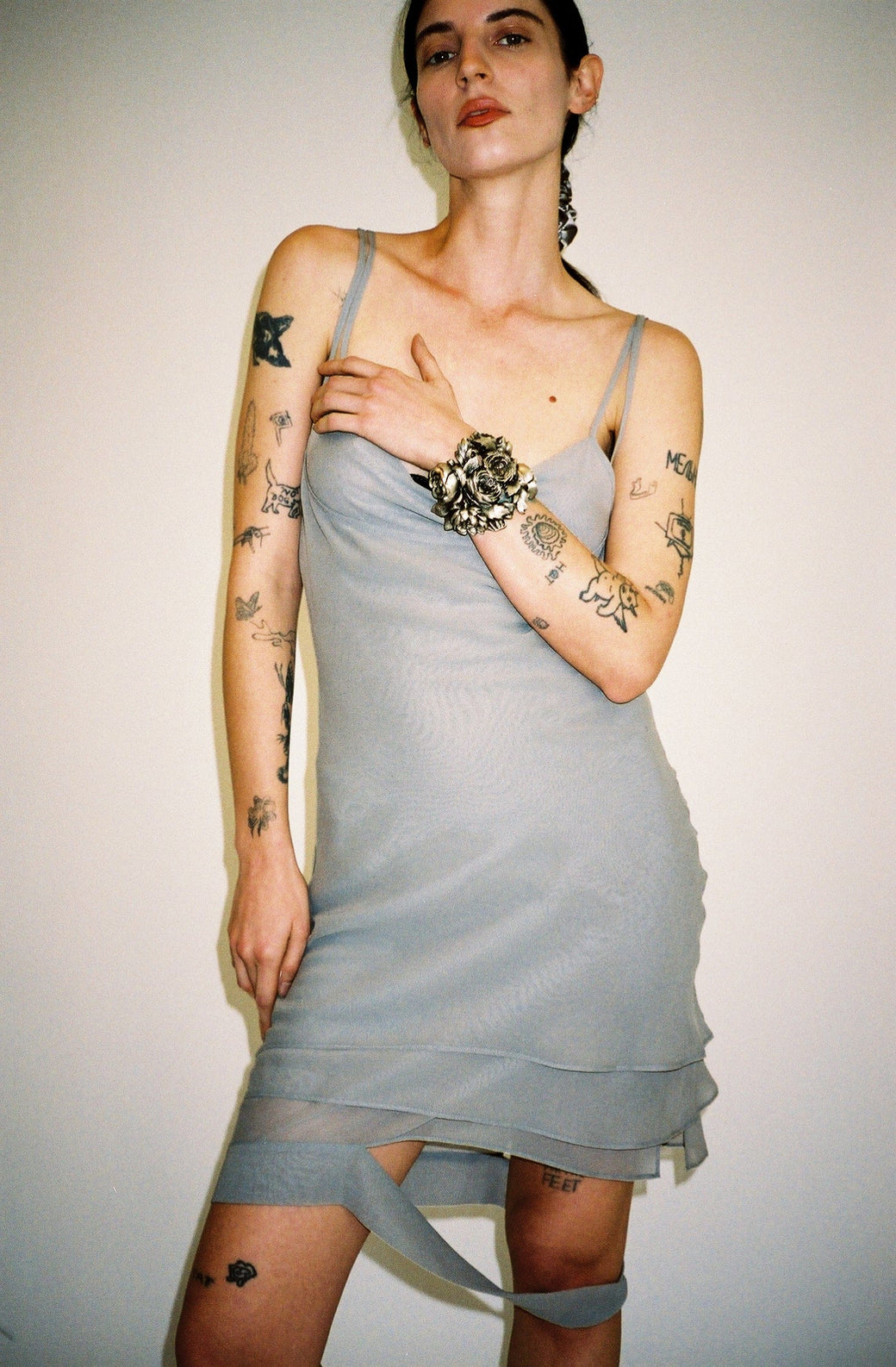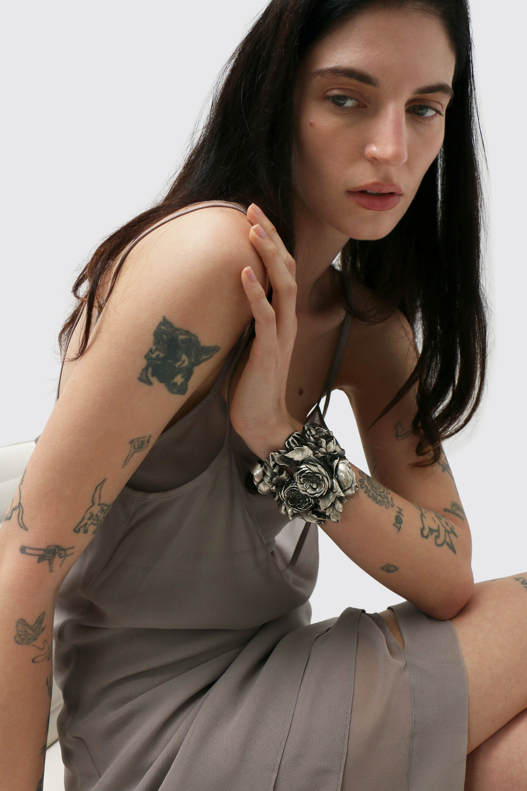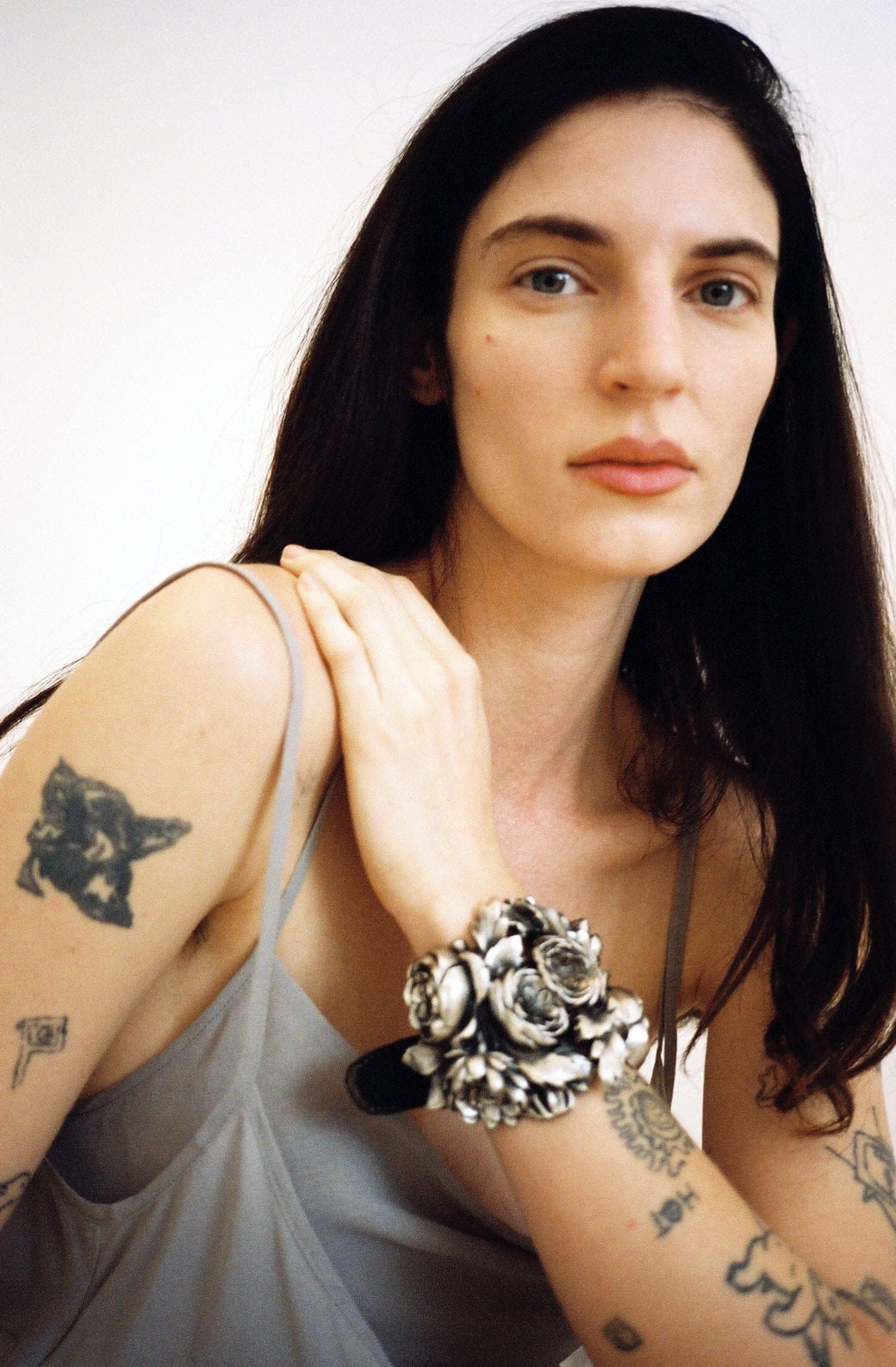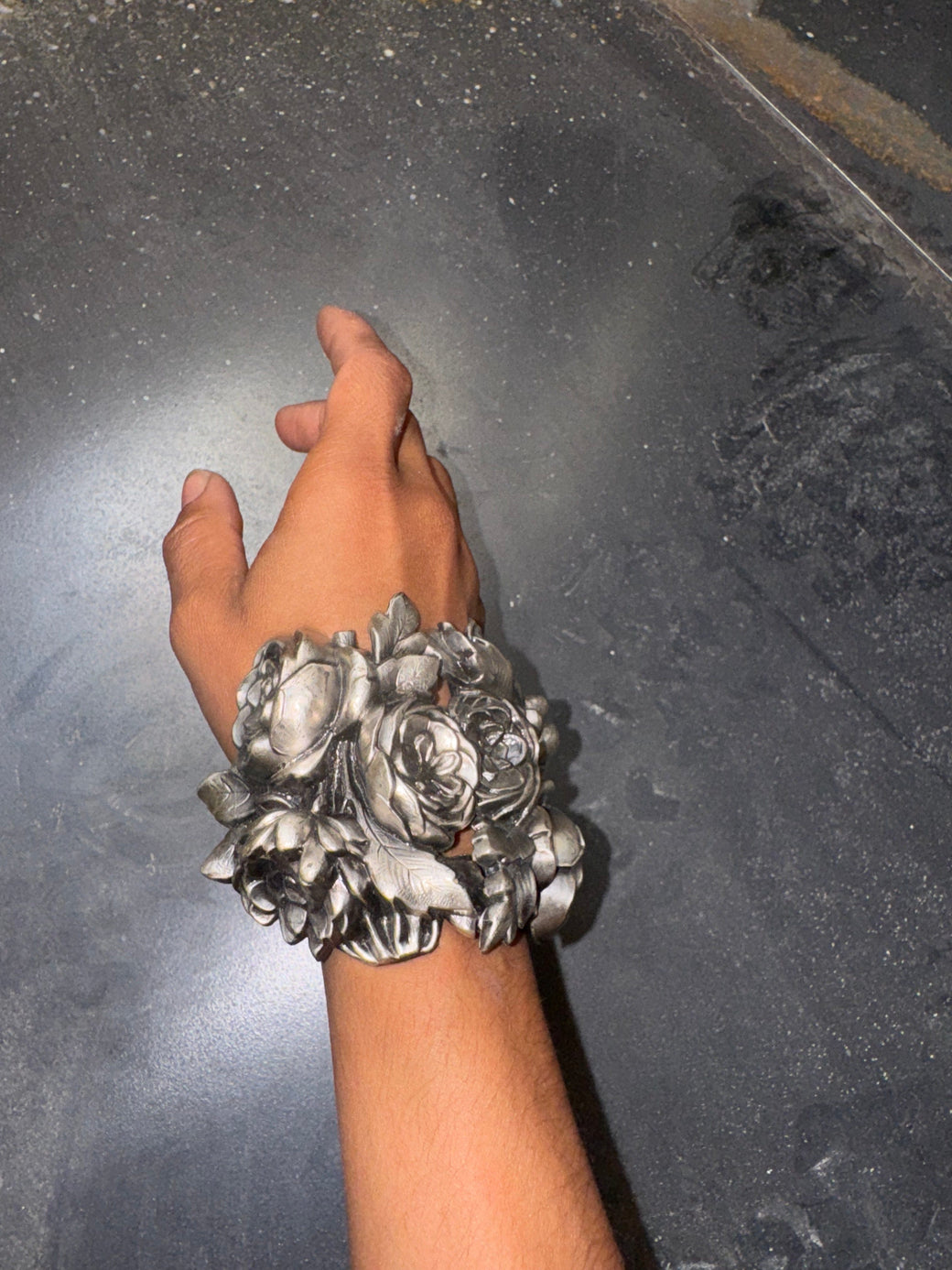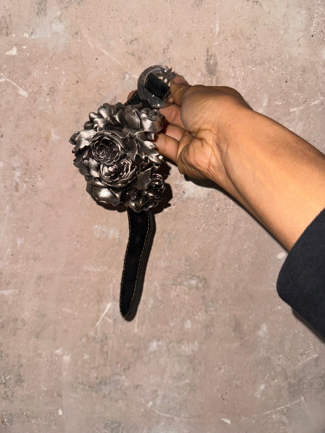 Sculptural cuff crafted from vintage lightweight metal buckles on a soft black leather adjustable wristband. Finished with an antique glass buckle etched with rose motifs. A singular piece that merges structure and sentiment.