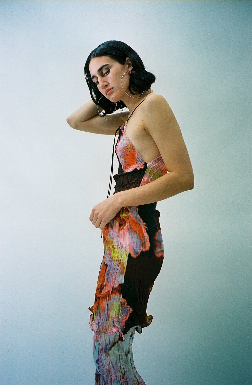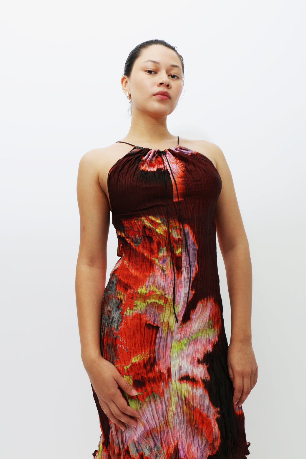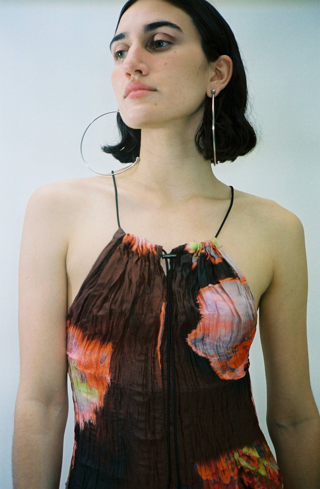 Crushed pleat sleeveless dress with adjustable shoulder straps. Toggle closure in front with ties. Crushed satin creates a soft tactile feel. Each print is exclusively designed in-house, this print features a modified floral design.  Designed in Paris. Made in France. Worn with the Hilde Daliah Trouser.