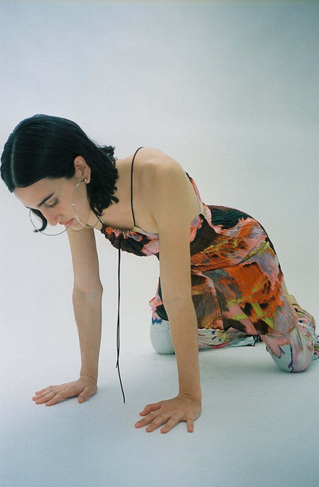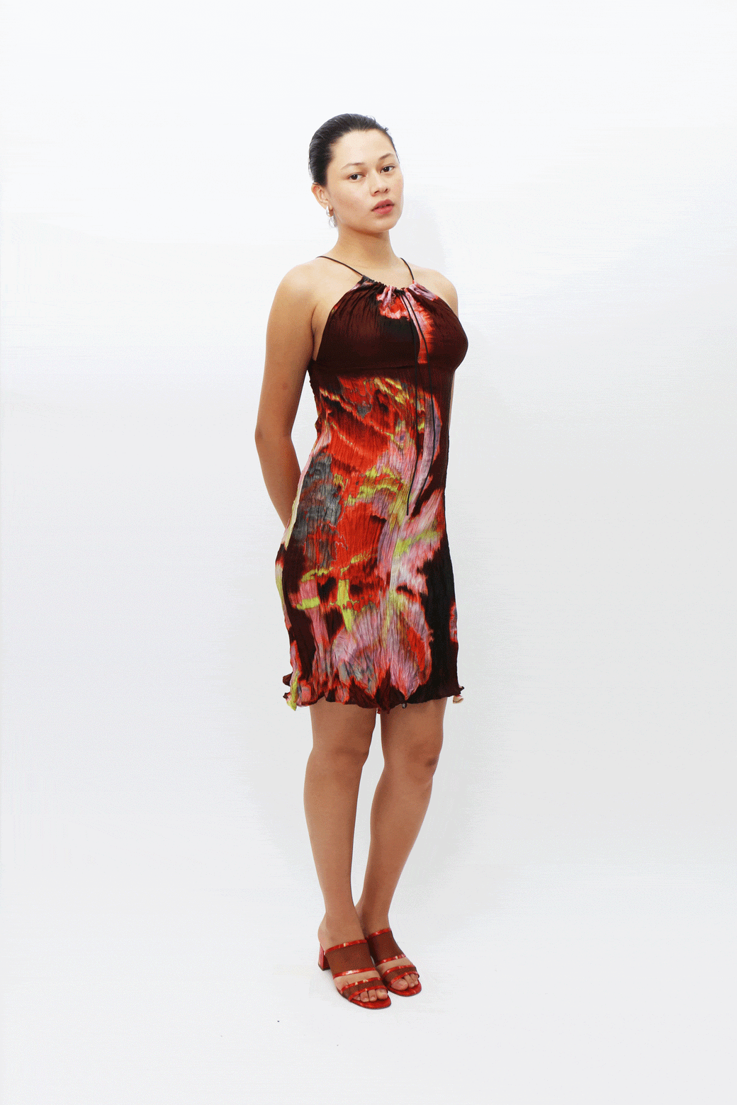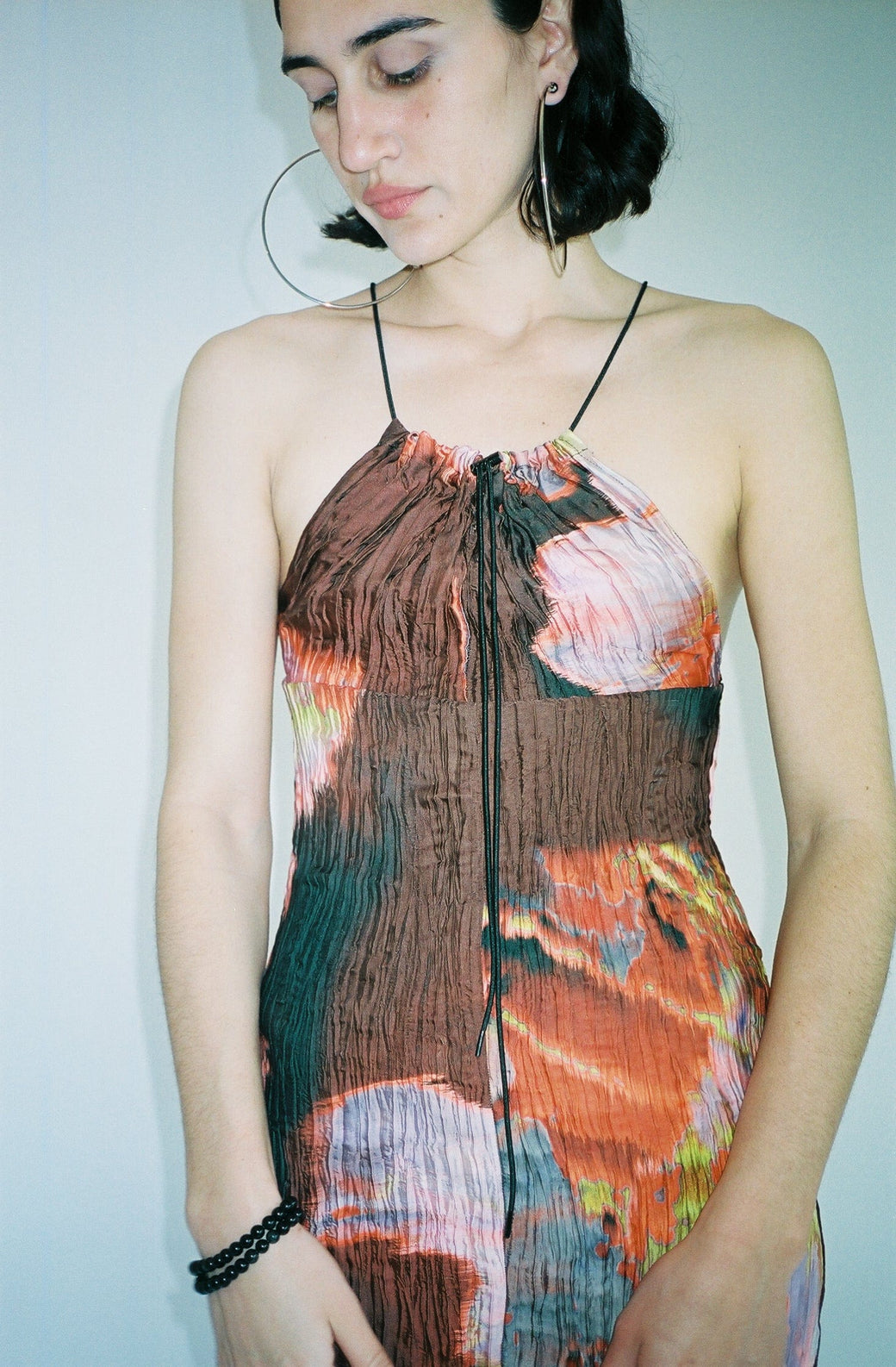 Crushed pleat sleeveless dress with adjustable shoulder straps. Toggle closure in front with ties. Crushed satin creates a soft tactile feel. Each print is exclusively designed in-house, this print features a modified floral design.  Designed in Paris. Made in France. Worn with the Hilde Daliah Trouser.