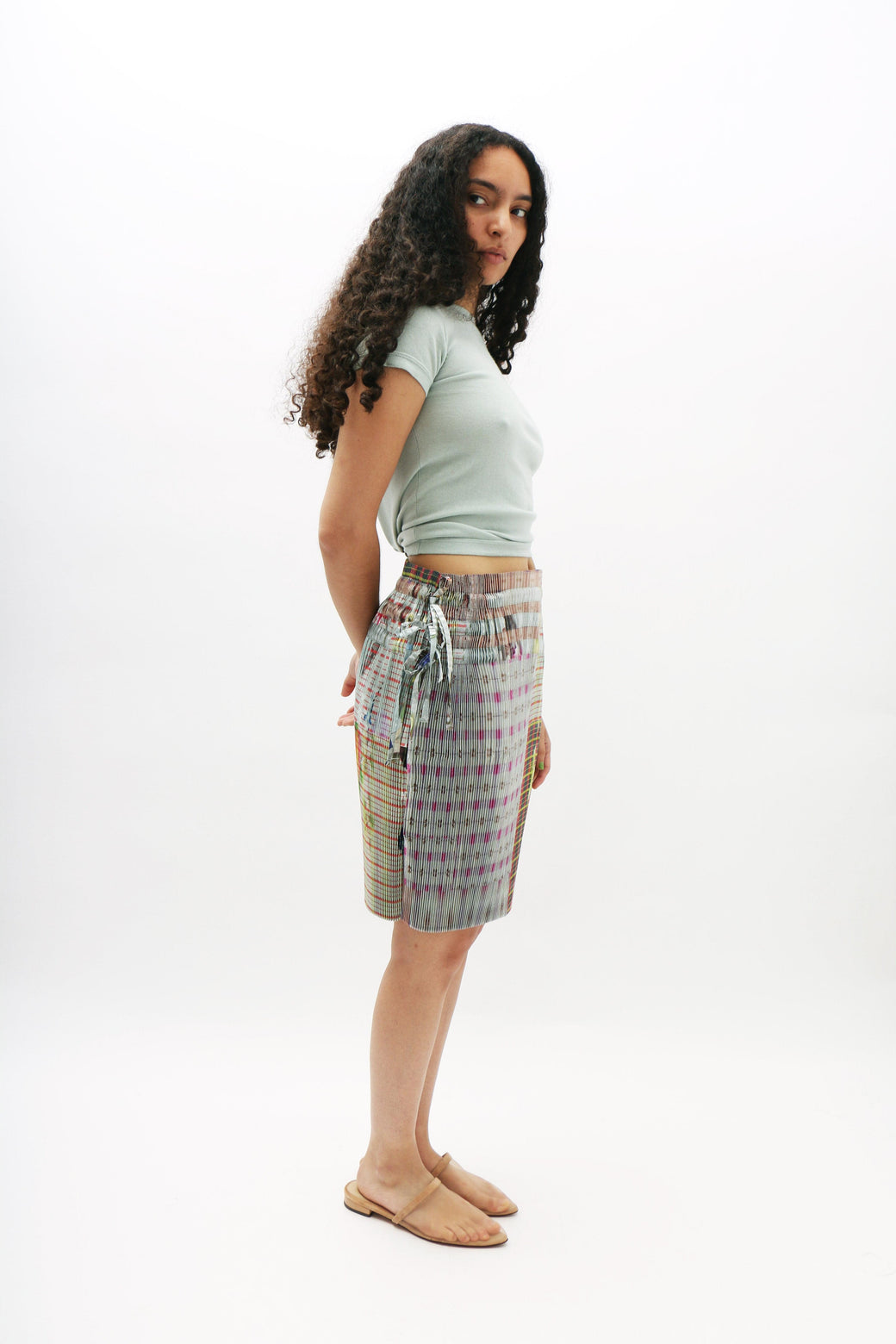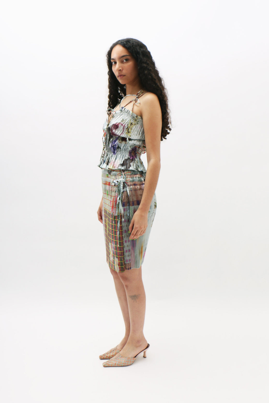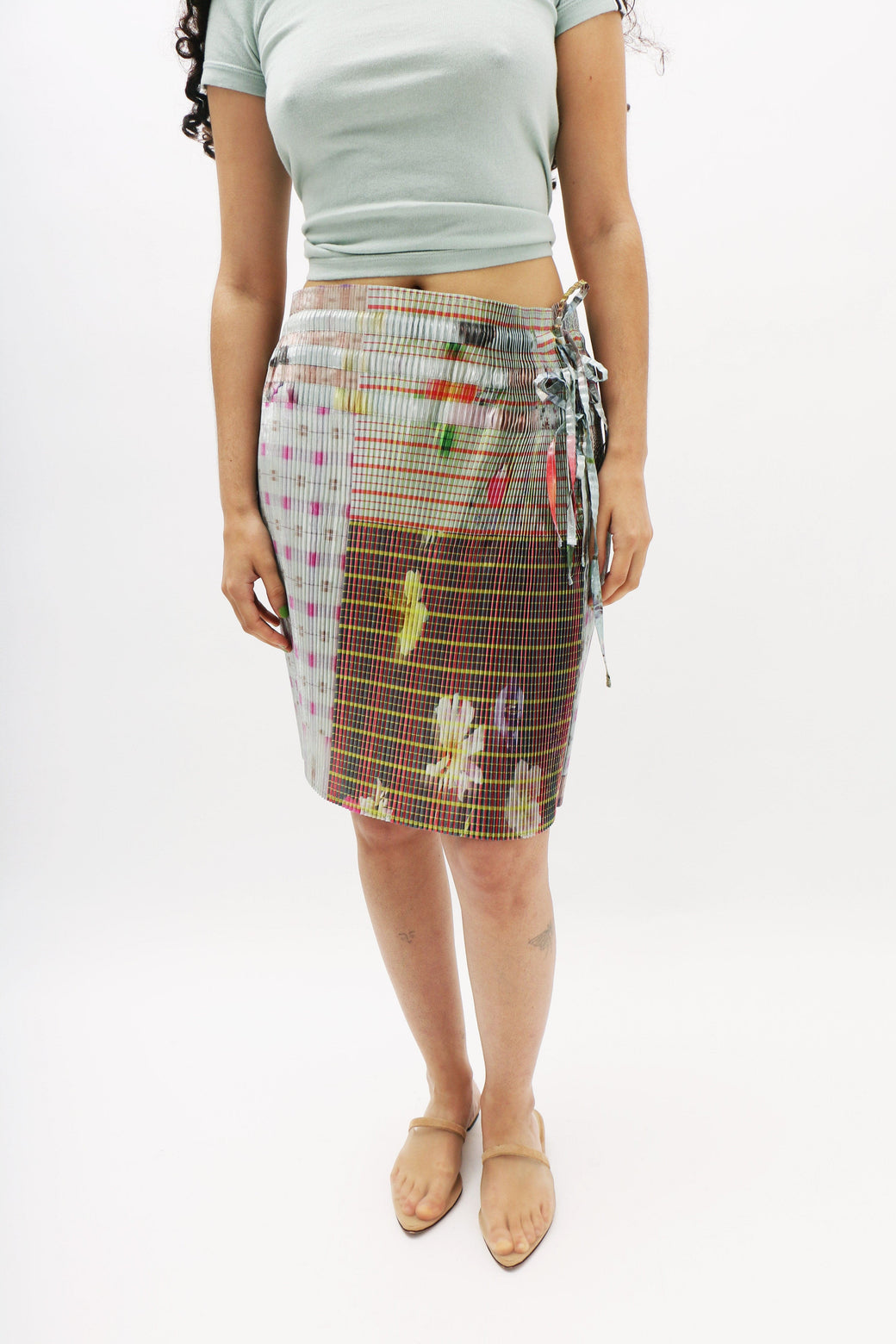 Pleated midi skirt crafted from metallic fabric with floral and plaid prints, featuring delicate ribbon detailing and adjustable side ties for a customizable fit.