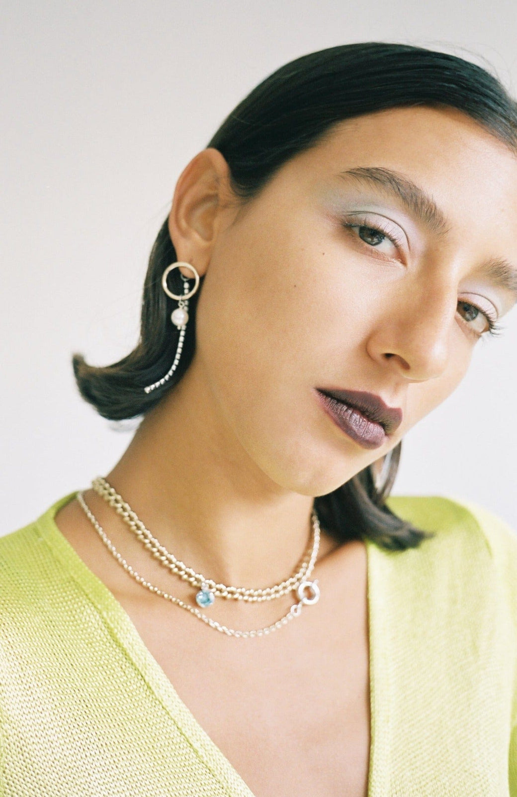 Part of the SS22 collection, the Esther necklace is made of brass dipped in palladium, pale gold 24K, and blue crystals. The necklace is designed and handmade in France.