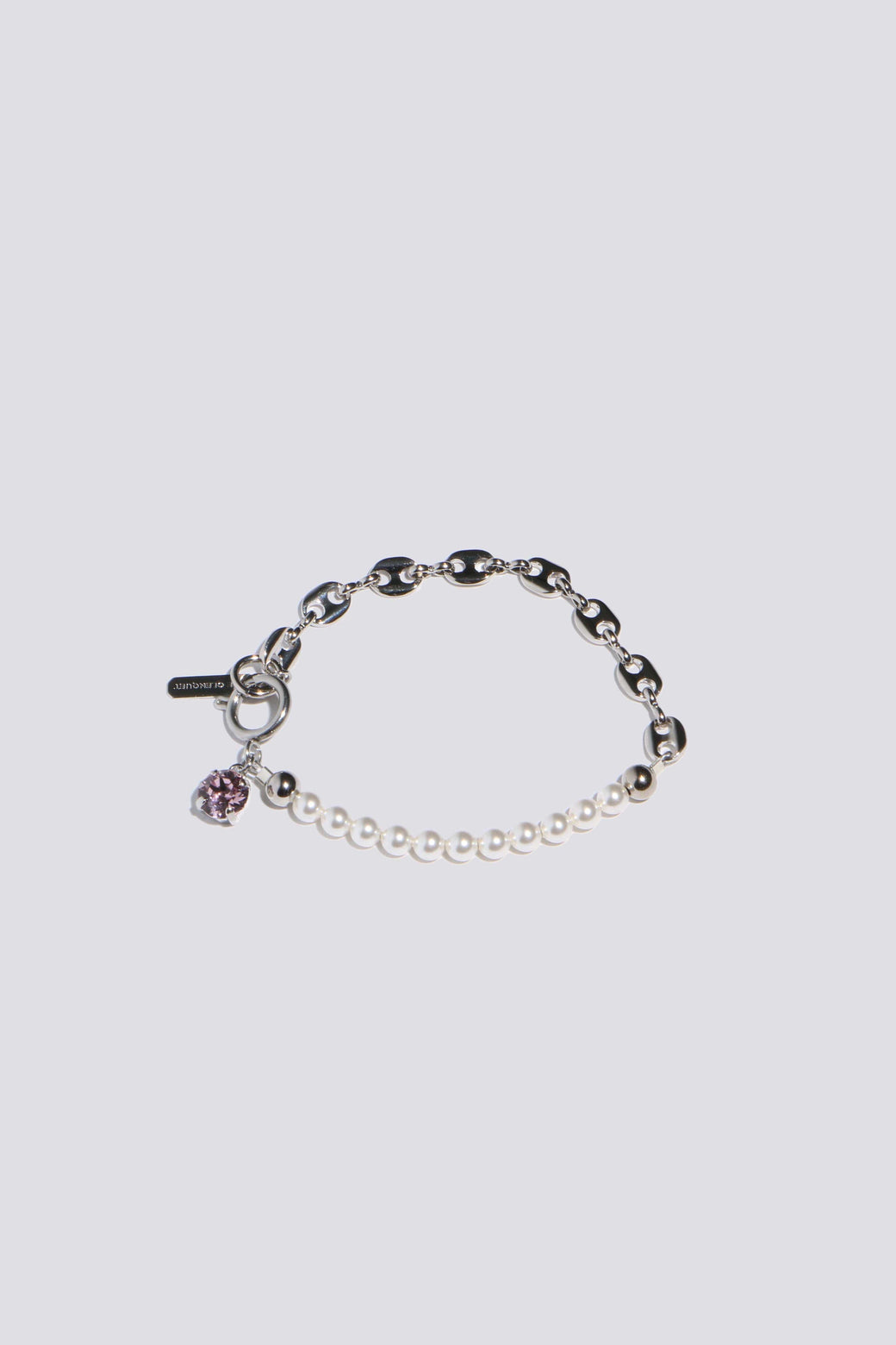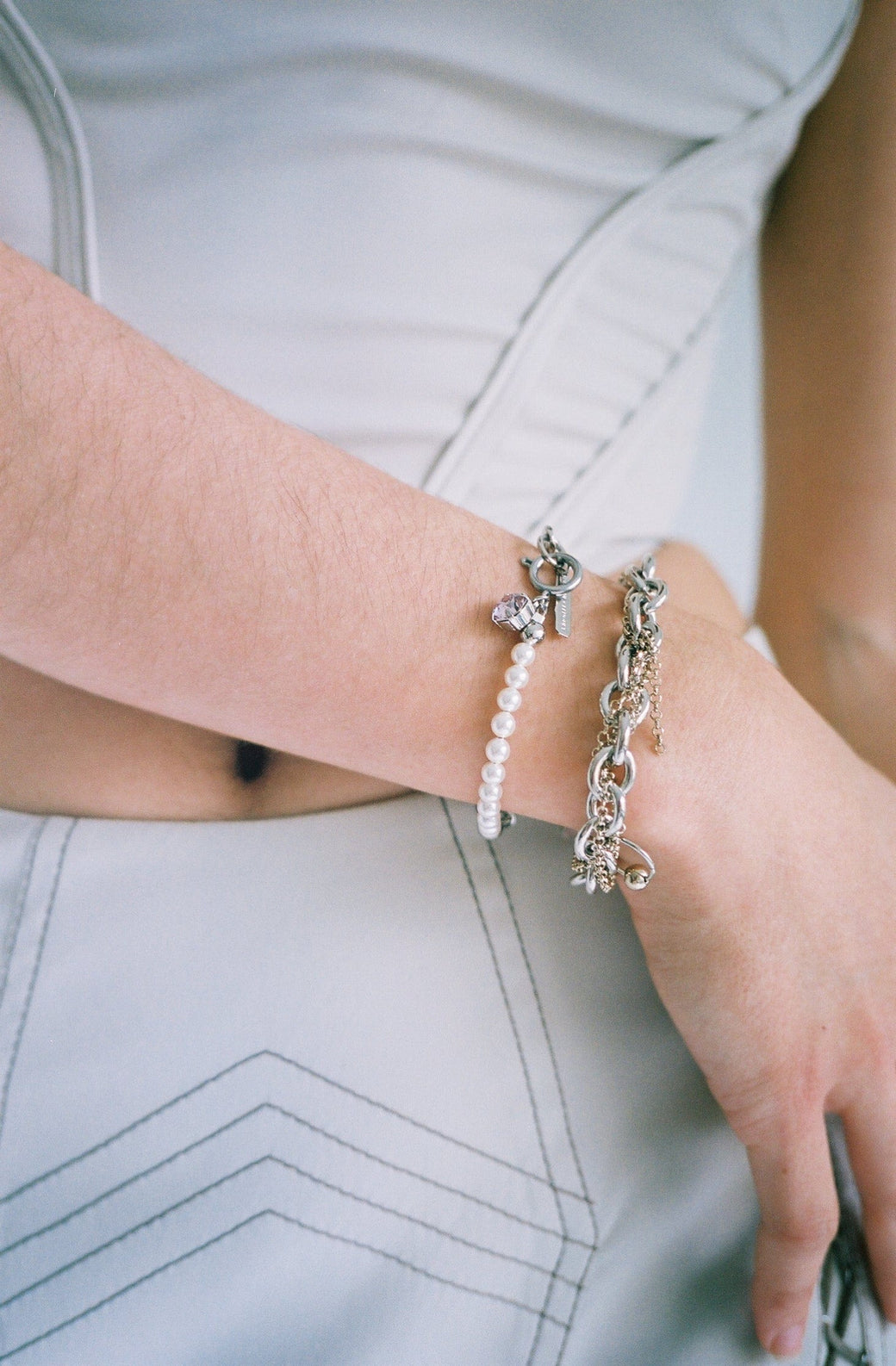 The Maddy Bracelet is a half pearl and half coffee bean chain wristlet. The silver-tone chain and off-white crystal pearl chain features a light amethyst rhinestone crystal charm and is made of brass dipped in palladium. Justine Clenquet’s jewels are subtle mixes of styles and edgy reinterpretations of classic pieces. Designed and handmade in France.