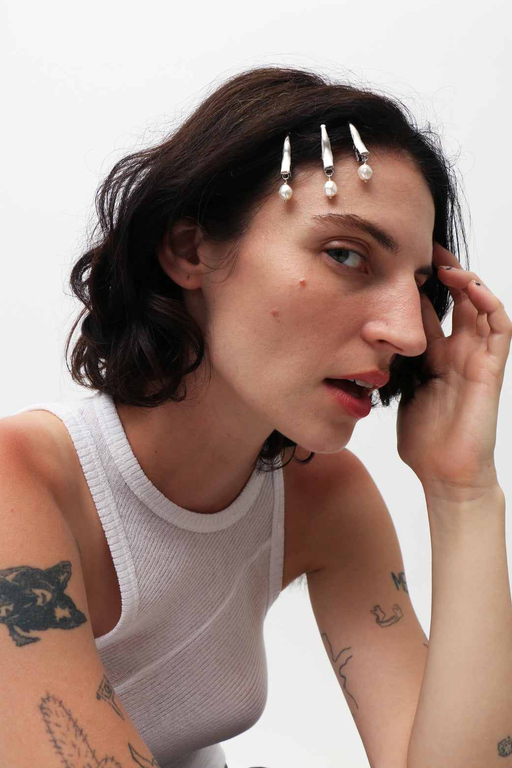 This piece is sold in single units, for more than 1 unit, add additional units to cart. Part of the Permanent collection, the Sidney hair clip is made of brass dipped in palladium and crystal pearls. Justine Clenquet’s jewels are subtle mixes of styles and reinterpretations of classic pieces. Designed and handmade in France.