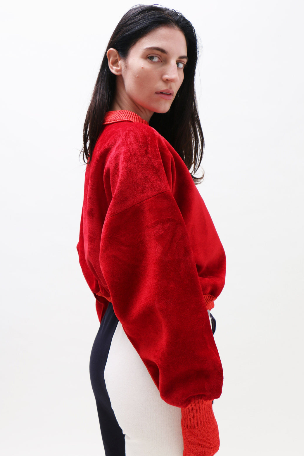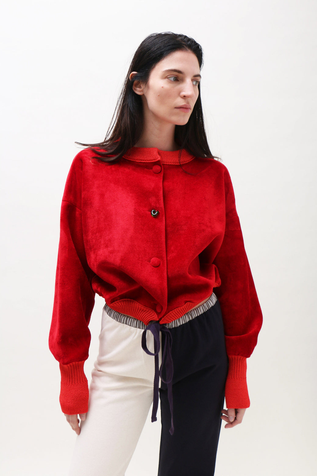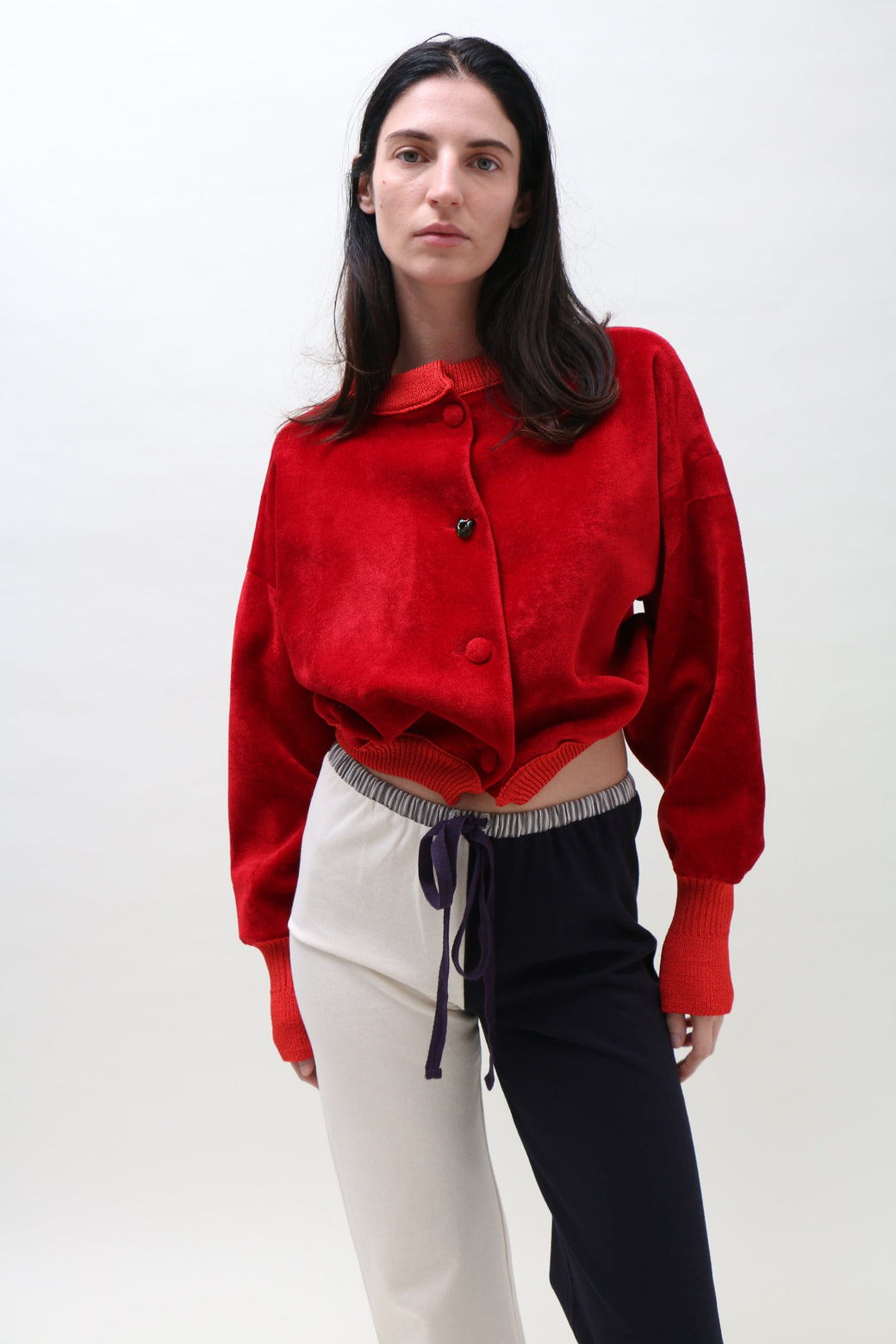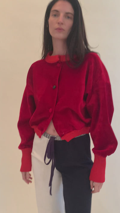 Slightly boxy, cropped bomber in bright red neoprene velvet. Finished with ribbed cuffs, bottom hem, and collar. Front button closure accented by a single hand-blown glass button.