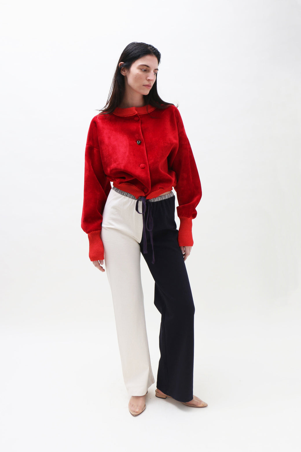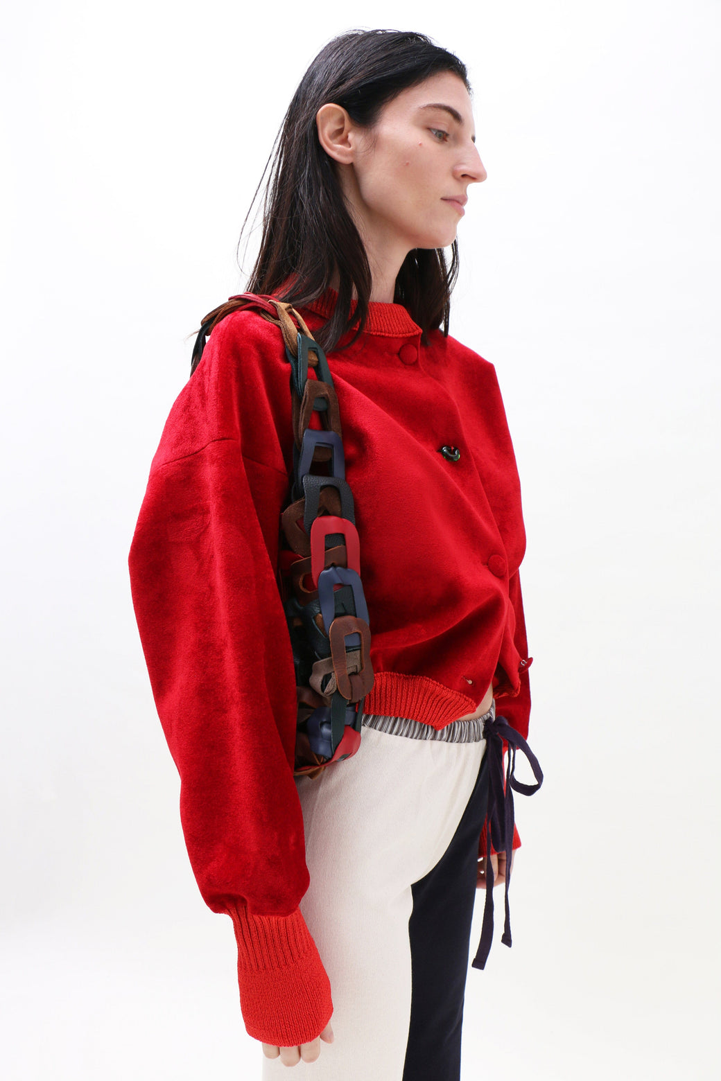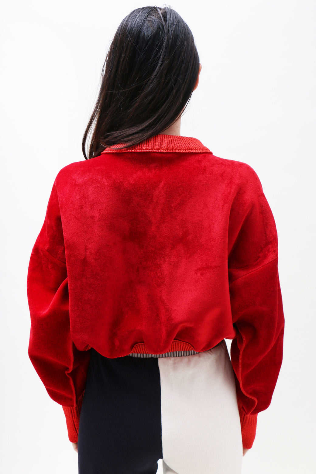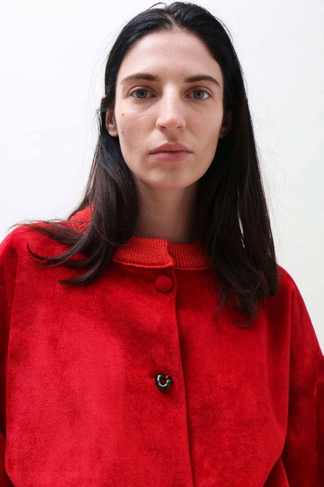 Slightly boxy, cropped bomber in bright red neoprene velvet. Finished with ribbed cuffs, bottom hem, and collar. Front button closure accented by a single hand-blown glass button.