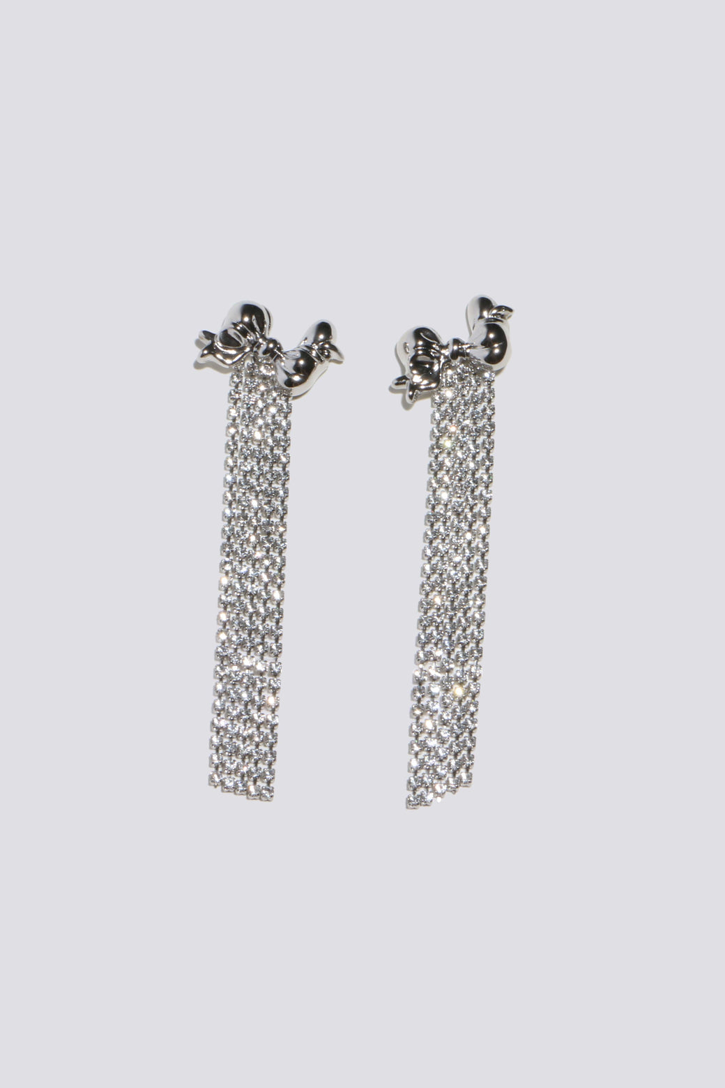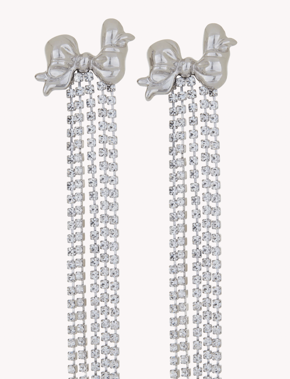 These Silver-plated bow earrings are adorned with elegant crystal chains that gracefully hang down. Made from white-bronze plated brass, crystal stones and .925 silver ear posts.