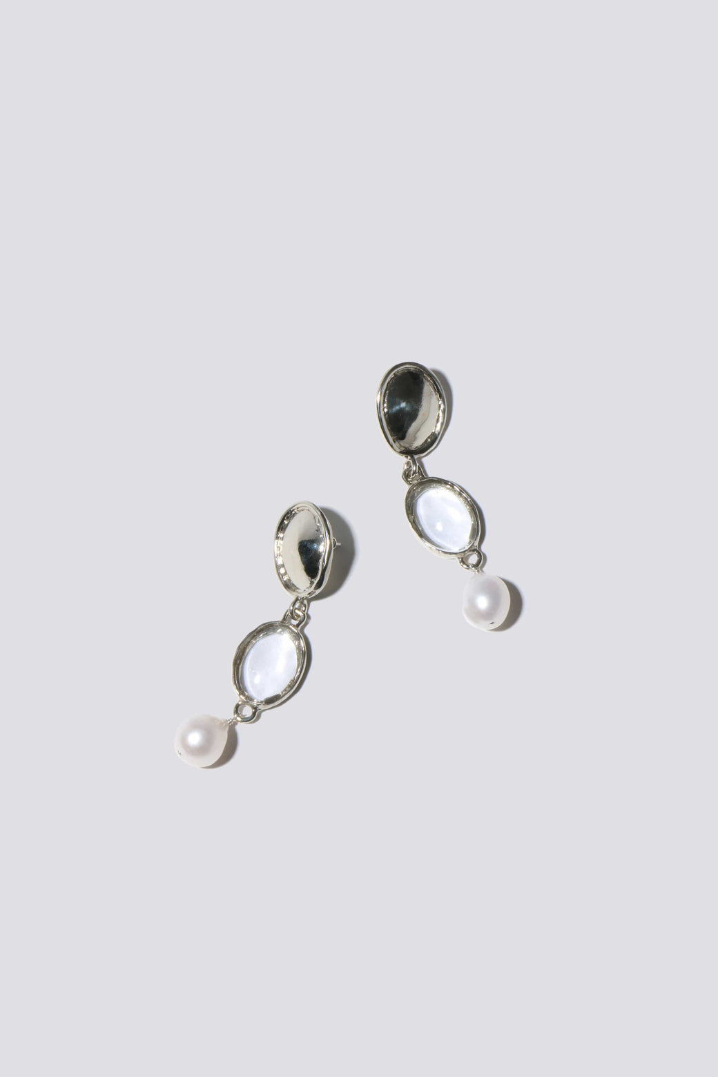 Pair of white bronze earrings with glass stone crystal and baroque pearls suspended.