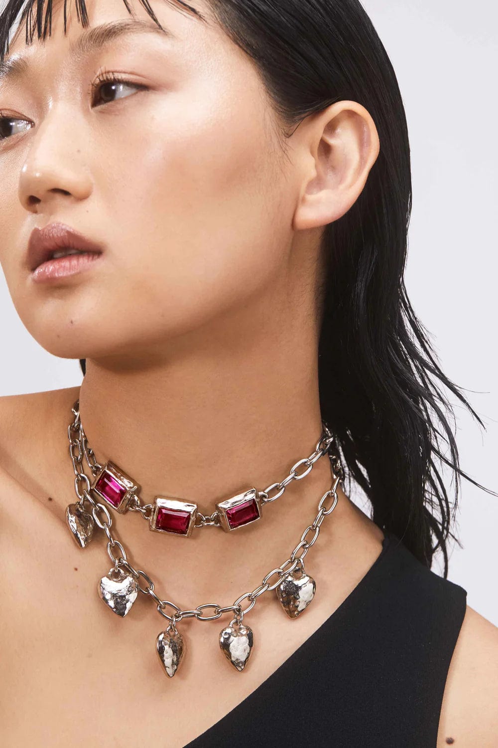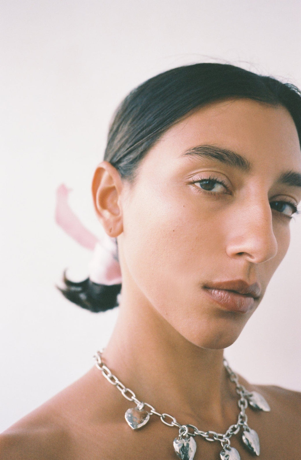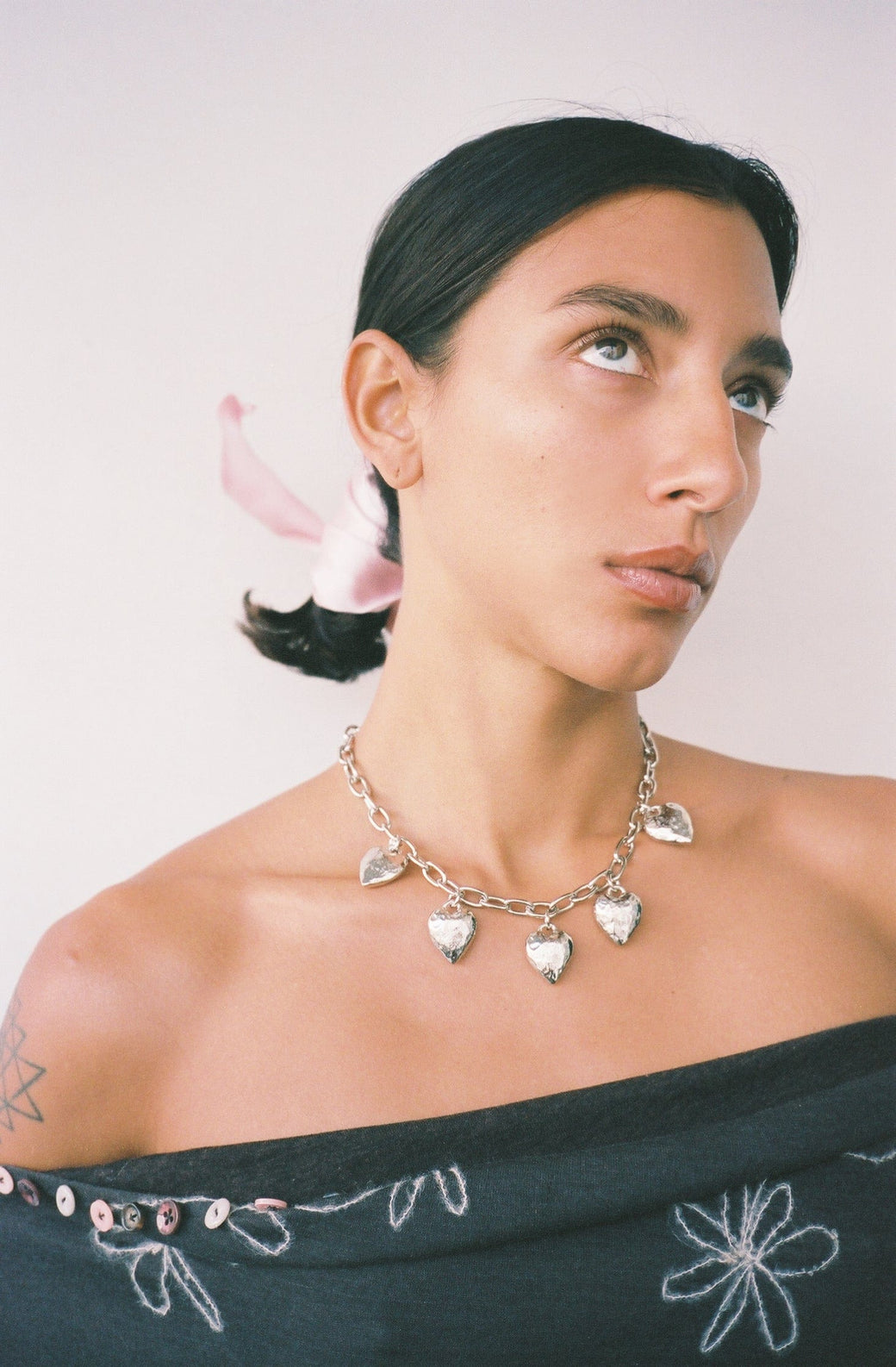 Silver-tone heart necklace on cable chain. Charm Length: 1"White bronze plated necklace on cable chain, with 5 suspended hearts. Charm Length: 1". Available in two lengths, please select your desired length before adding to cart.