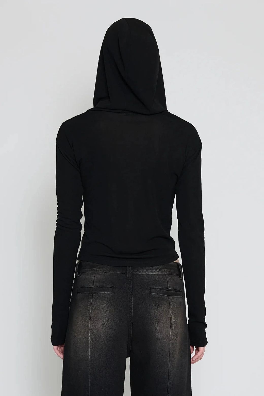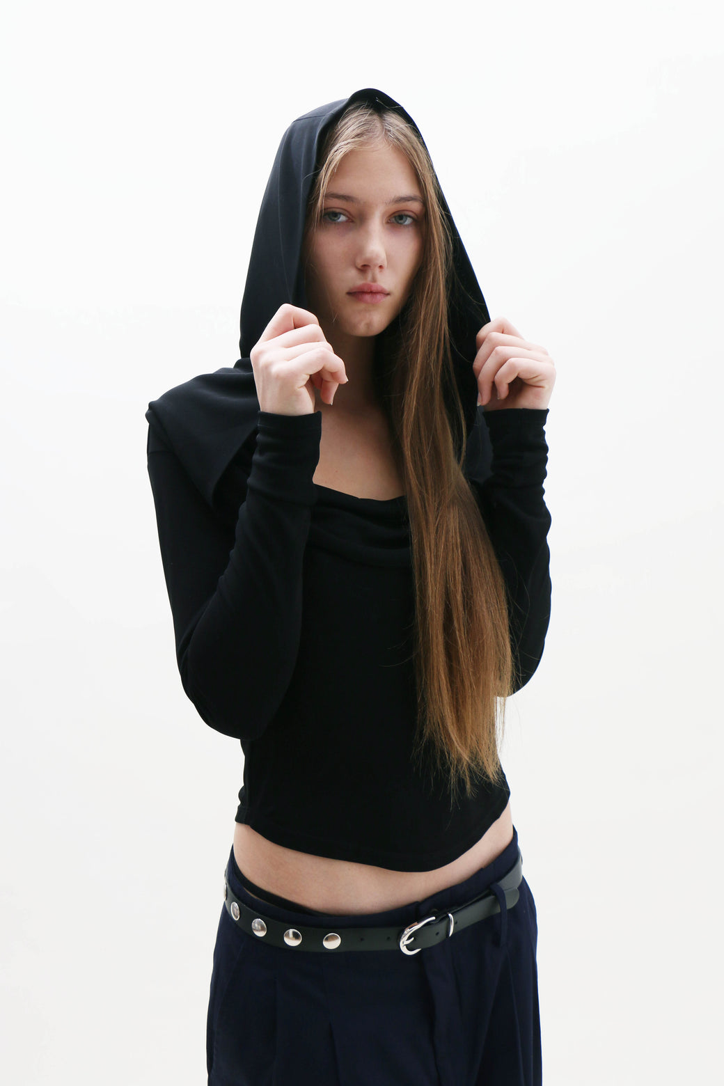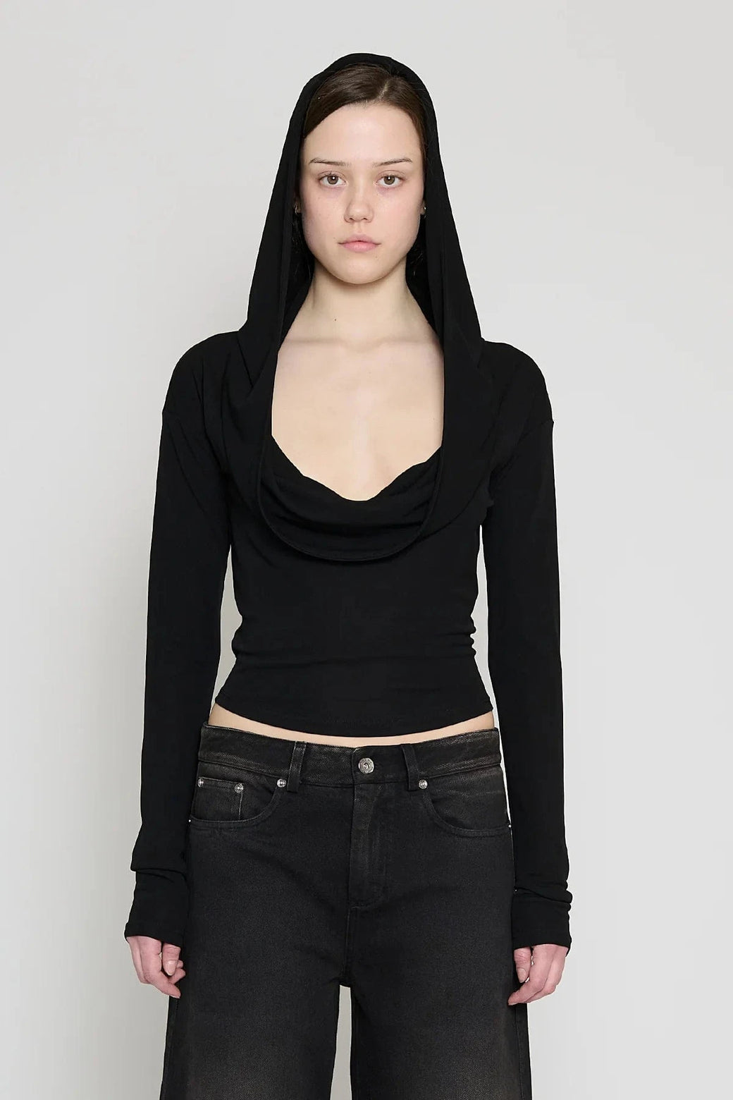 Black Italian stretch viscose jersey cut in a slim silhouette. Features a convertible neckline that shifts from a hooded cowl to an off-the-shoulder drape, finished with long sleeves and a slightly cropped length that sits at the hipbone.
