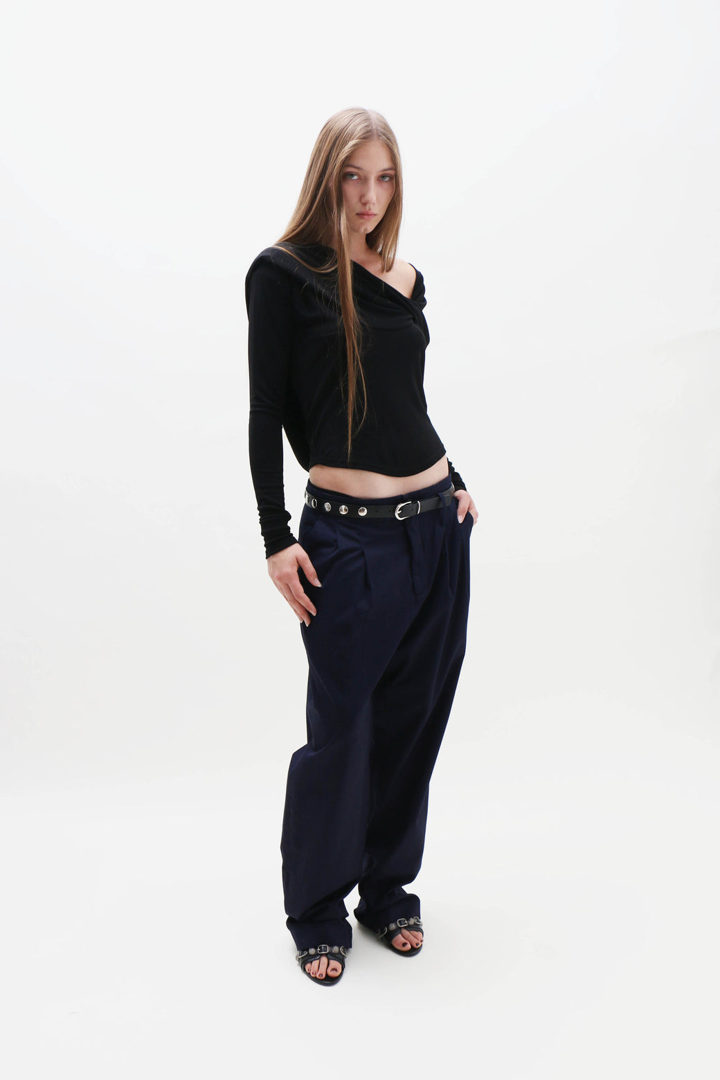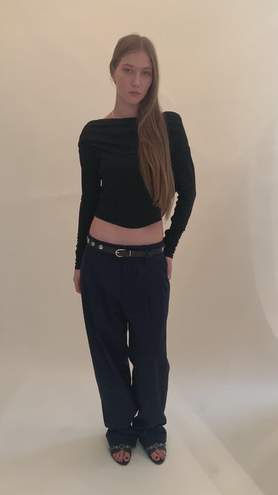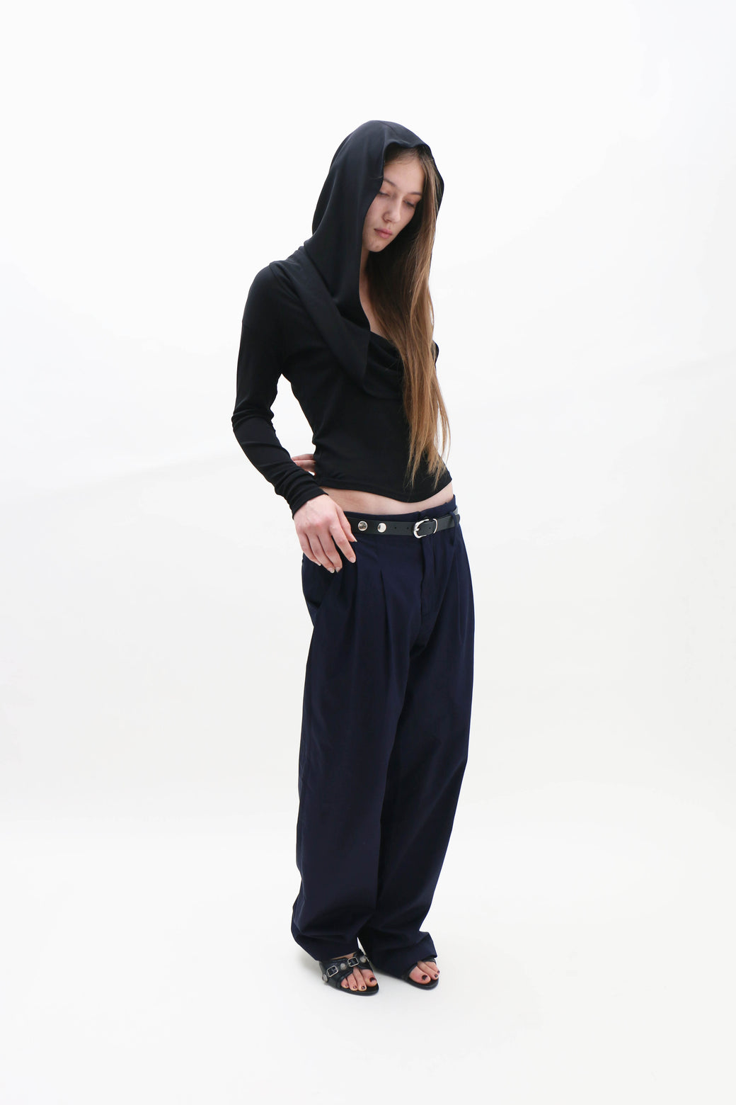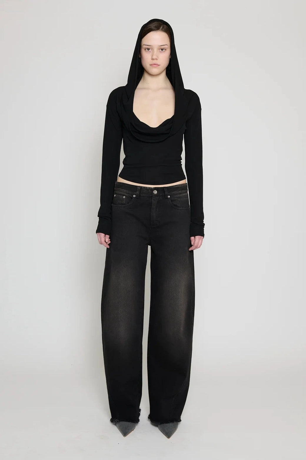 Black Italian stretch viscose jersey cut in a slim silhouette. Features a convertible neckline that shifts from a hooded cowl to an off-the-shoulder drape, finished with long sleeves and a slightly cropped length that sits at the hipbone.