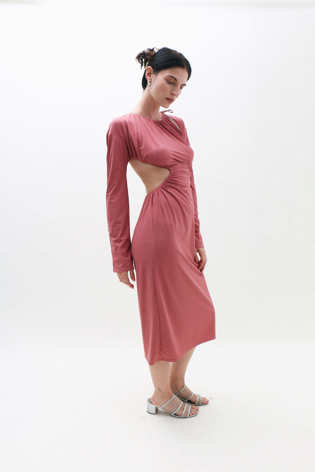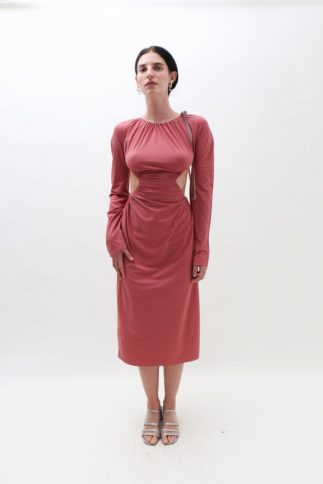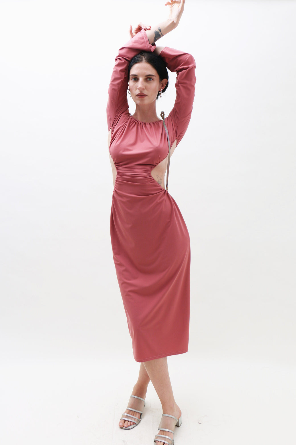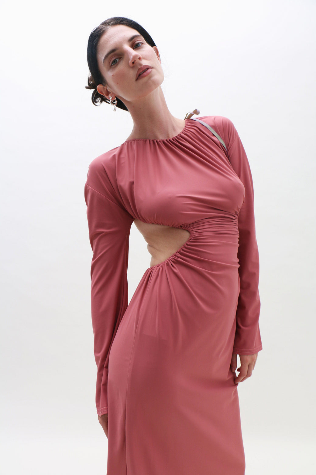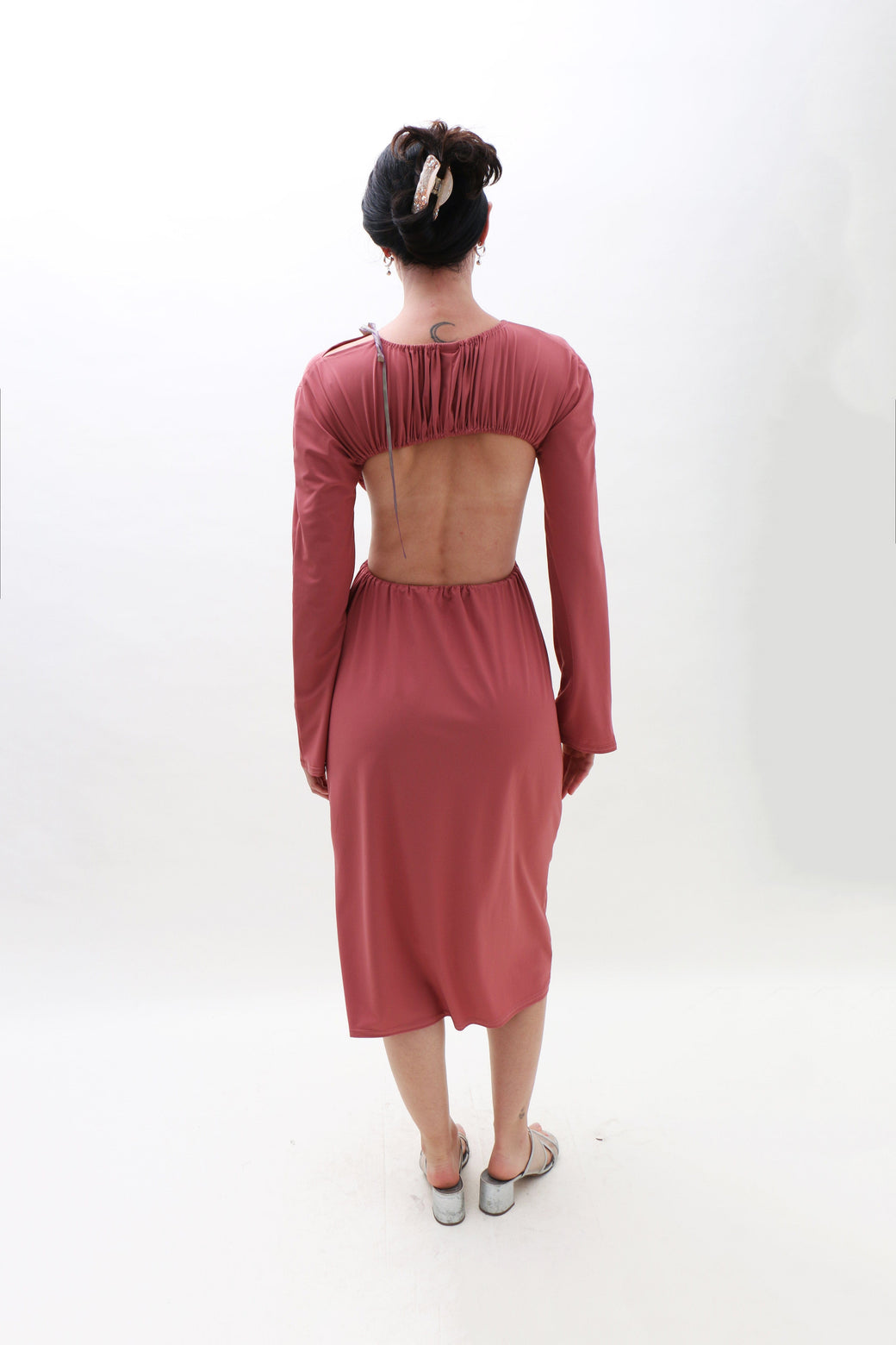 Blush pink dress with an exposed open back and sides. Long sleeves are gathered at the neckline and along the bust to waist, creating subtle volume and movement. Finished with black drawstrings and Lucille Thièvre’s signature glass beads.